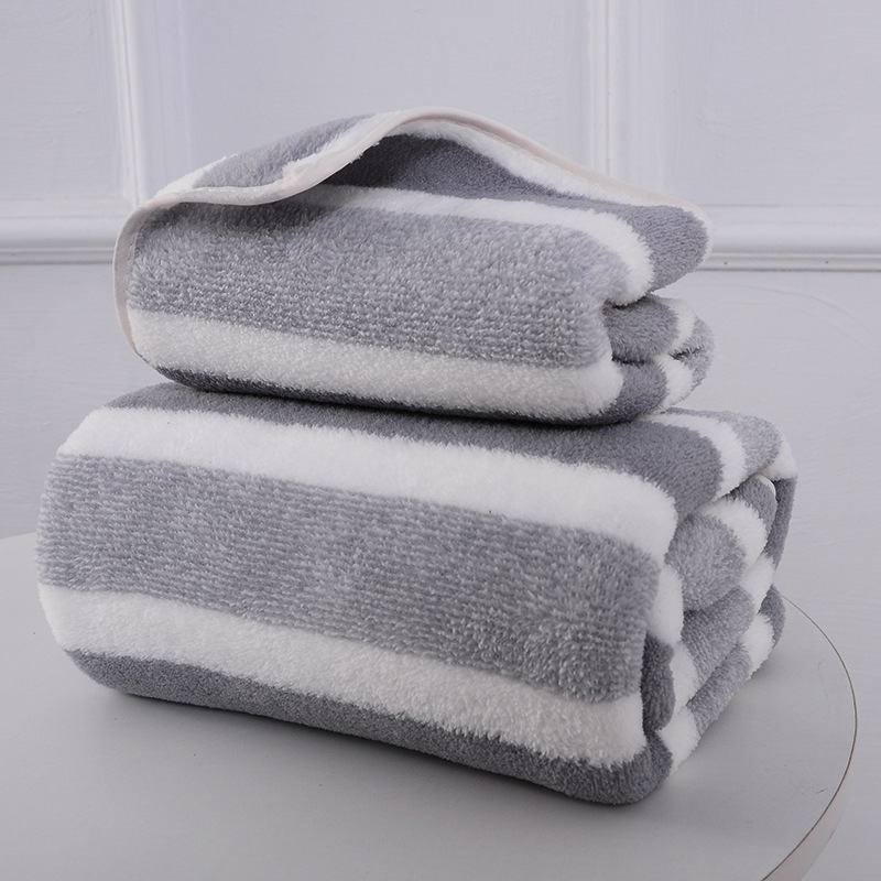 국경 간 목욕 타월 포장 타월 두꺼운 초대형 흡수 페이스 워시 가정용 와이드 스트라이프 산호 양털 타월 세트 도매