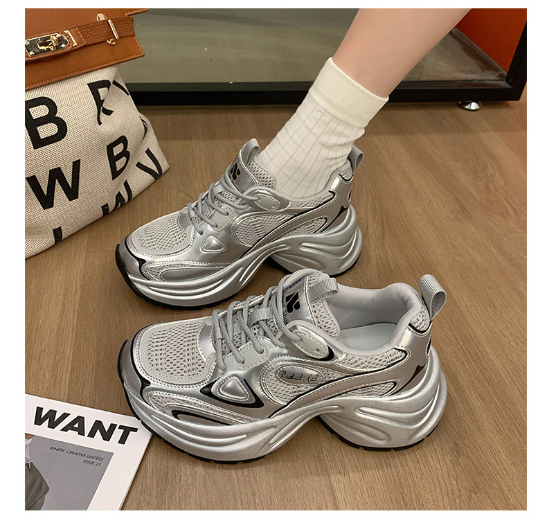 두꺼운 밑창의 여성용 아빠 신발 2025 봄 가을 신상 다용도 메쉬 통기성 실버 색상 키높이 캐주얼 운동화스토어 가기