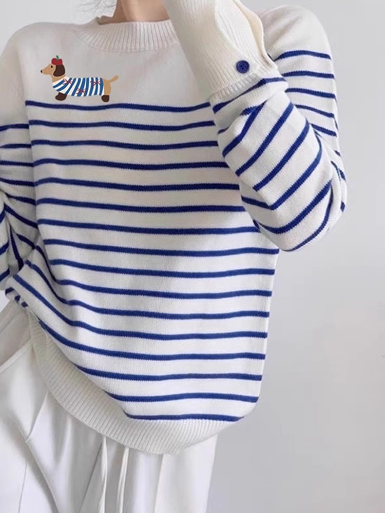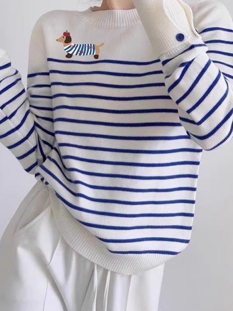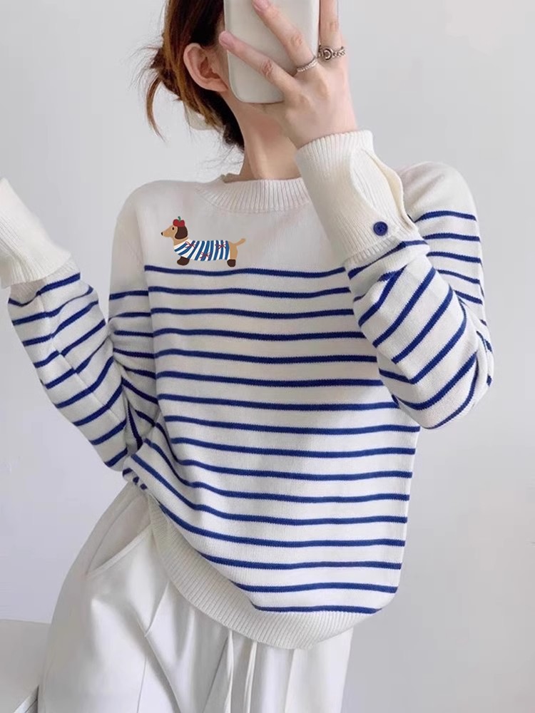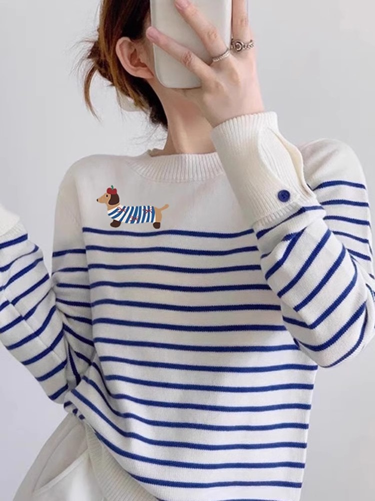 블루 스트라이프 만화 강아지 니트 스웨터 여성의 초가을 2024 새로운 슬리밍 대학 스타일 라운드 넥 스트라이프 스웨터스토어 가기