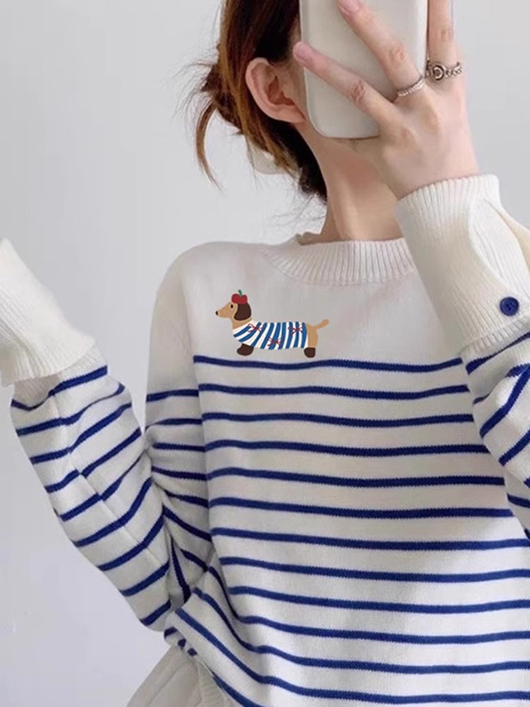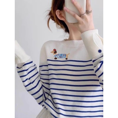블루 스트라이프 만화 강아지 니트 스웨터 여성의 초가을 2024 새로운 슬리밍 대학 스타일 라운드 넥 스트라이프 스웨터