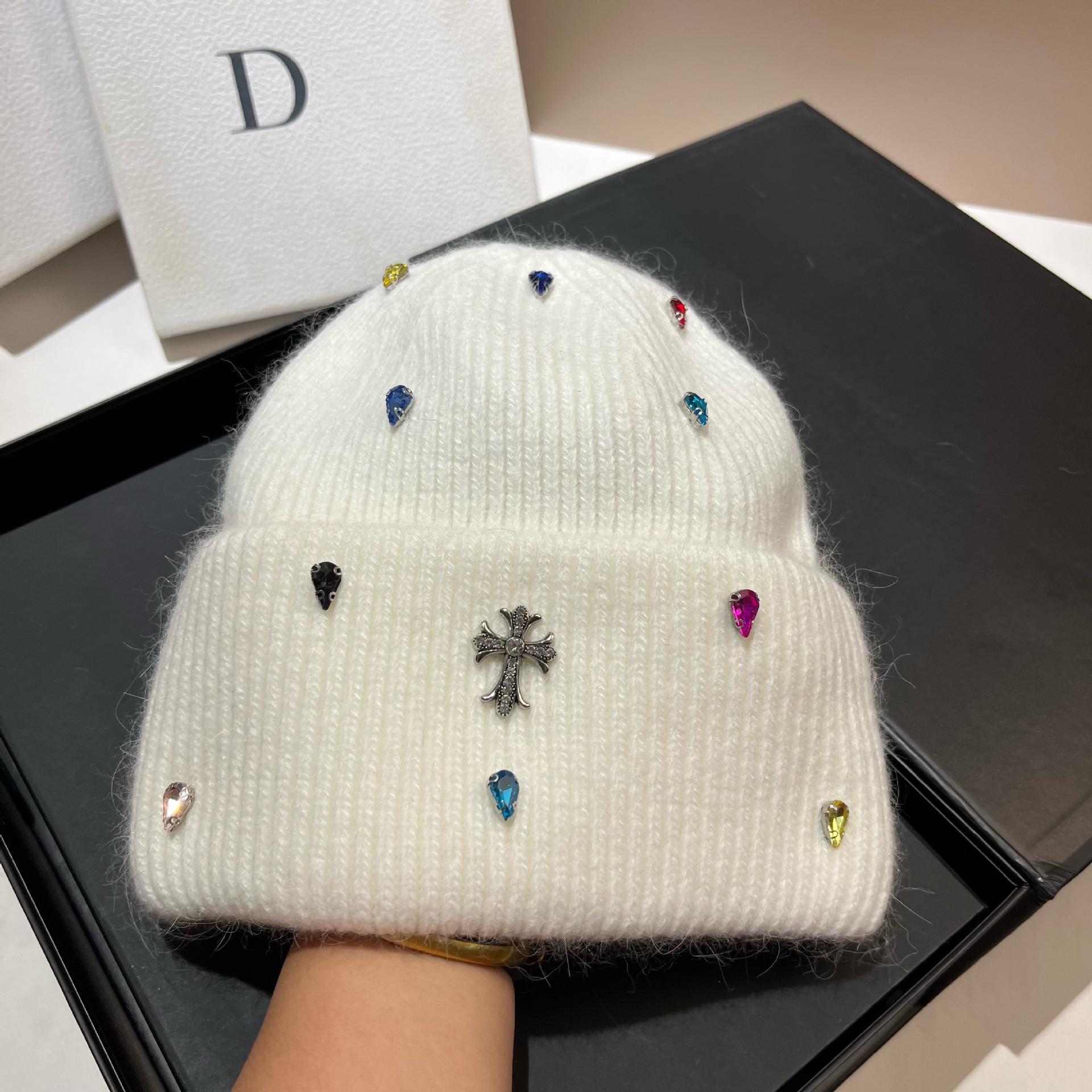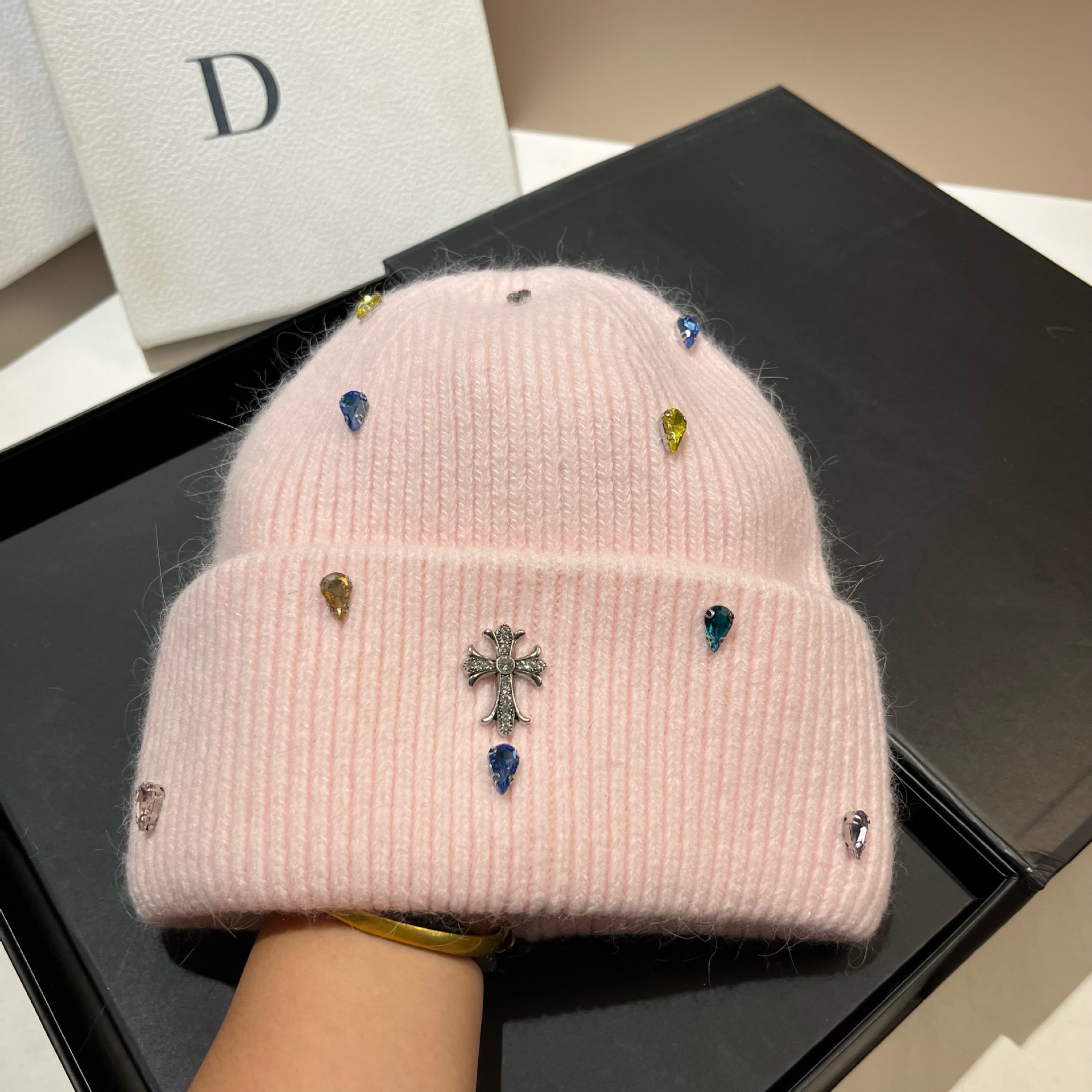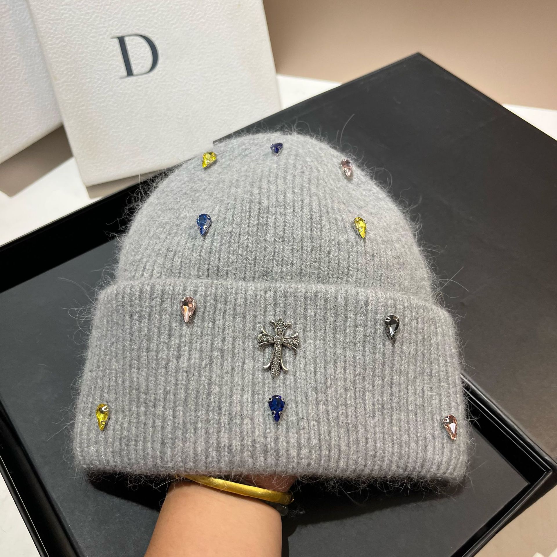 패션 파리 크로스 라이트 럭셔리 다채로운 라인스톤 토끼 헤어 니트 모자 겨울 야외 따뜻한 부드러운 왁스 봉제 귀 보호 모자스토어 가기