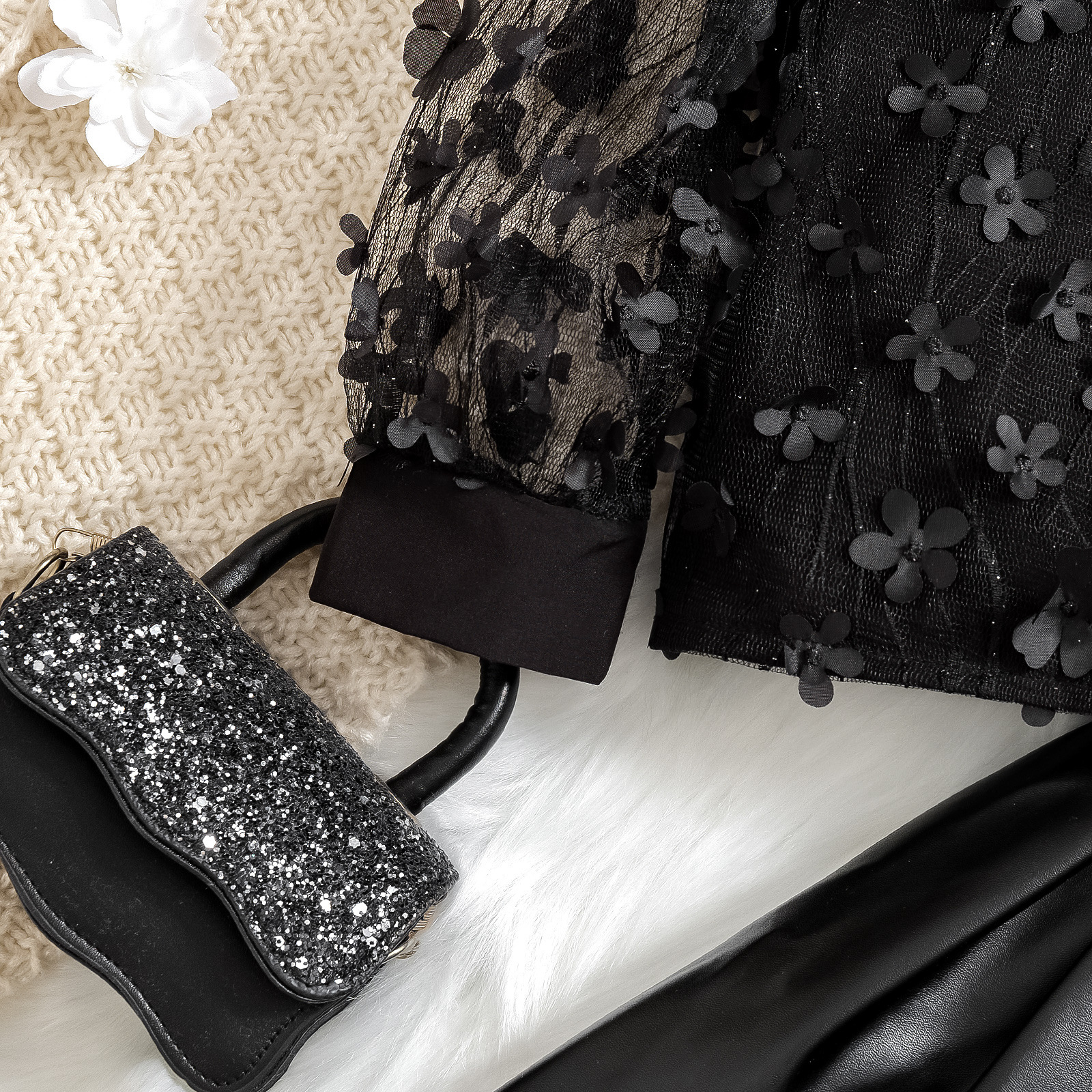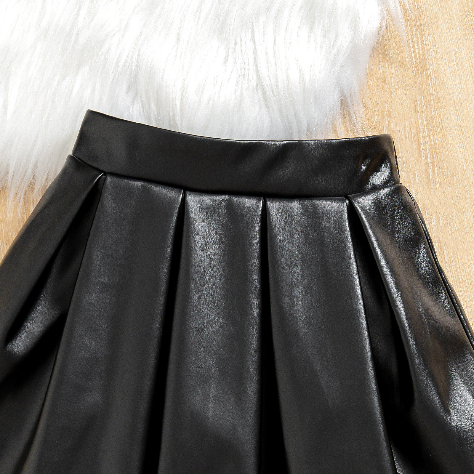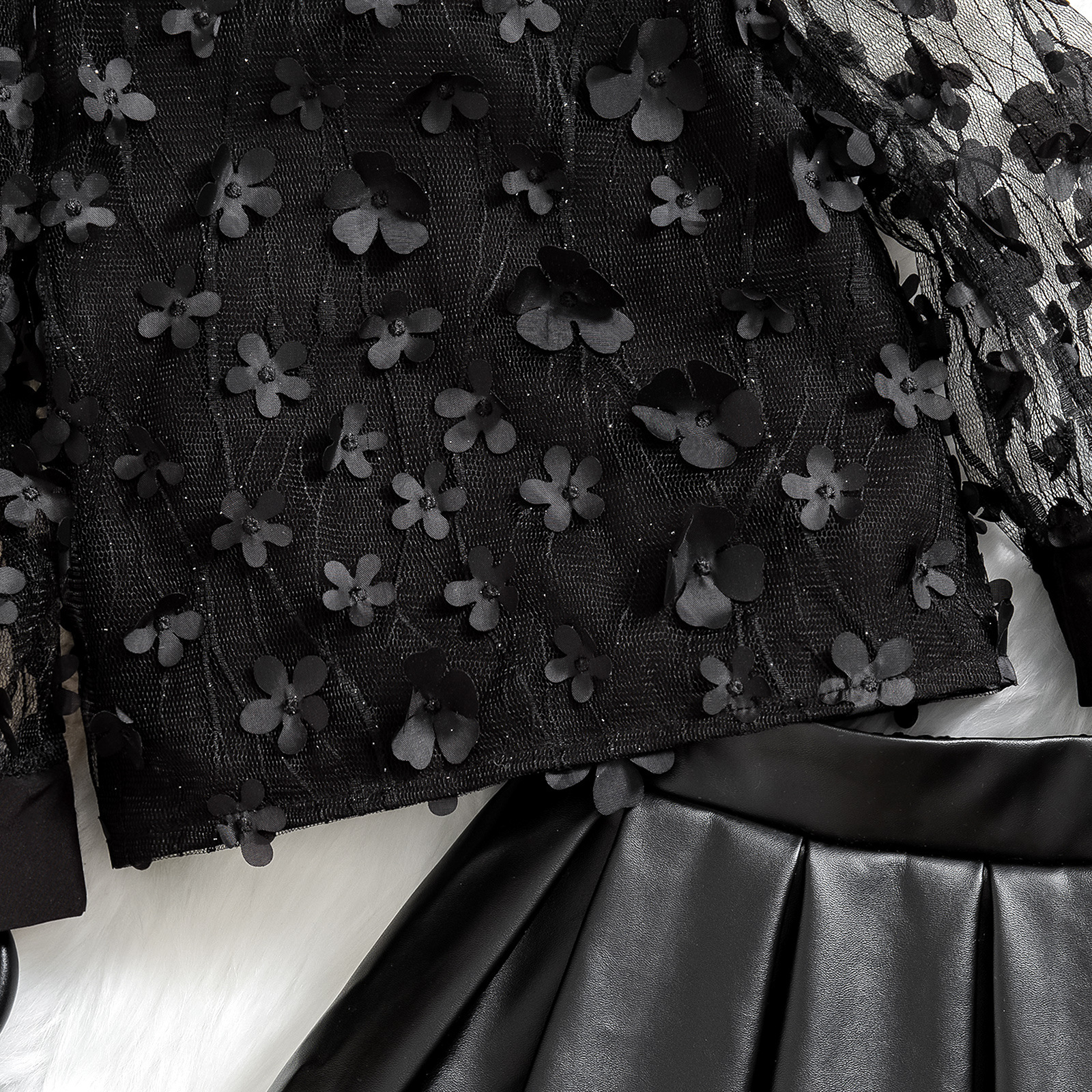 2024 대외 무역 국경 신제품 유럽과 미국의 봄과 가을 소녀 메시 꽃 긴 소매 최고 pu 가죽 스커트 투피스 세트스토어 가기