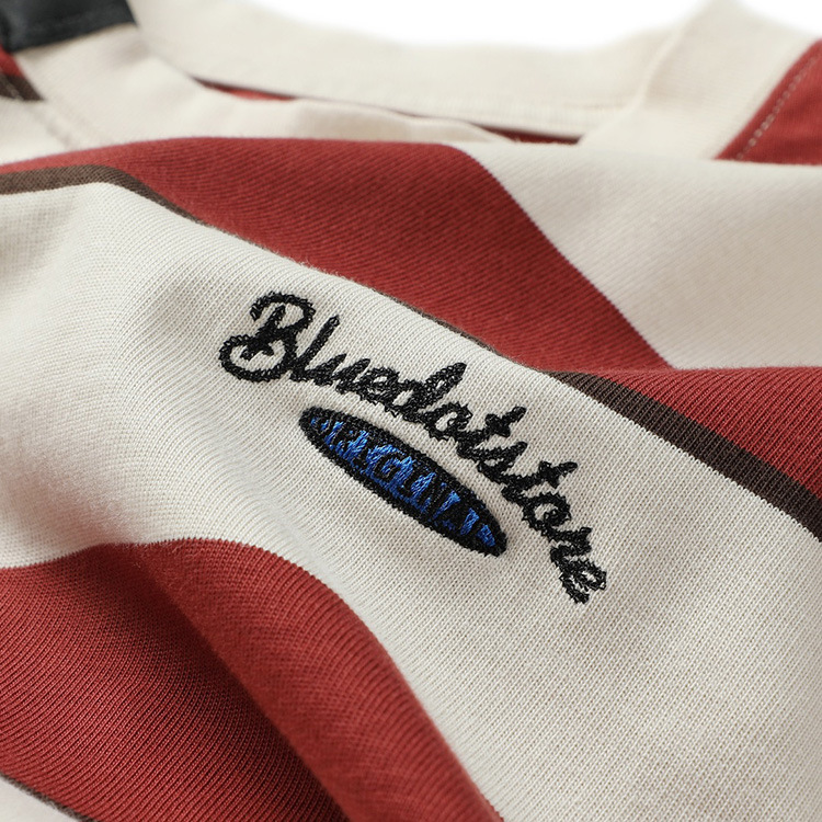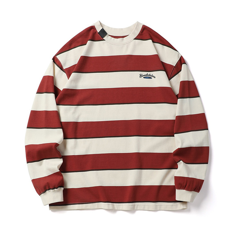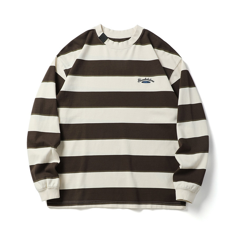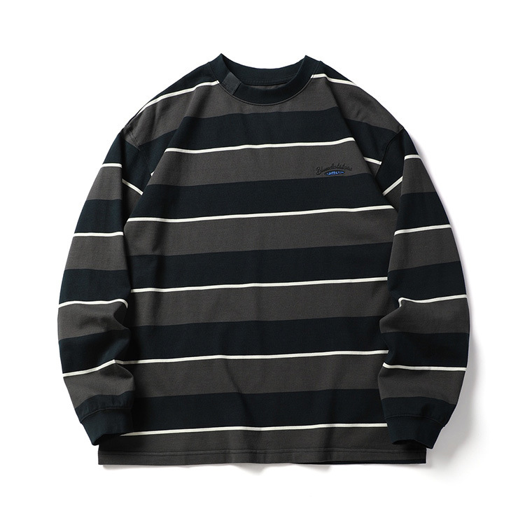 두꺼운 줄무늬 작은 자수 350G 무거운 긴팔 티셔츠 남성용 느슨한 어깨 소매 둥근 목 재킷 가을면 긴팔스토어 가기