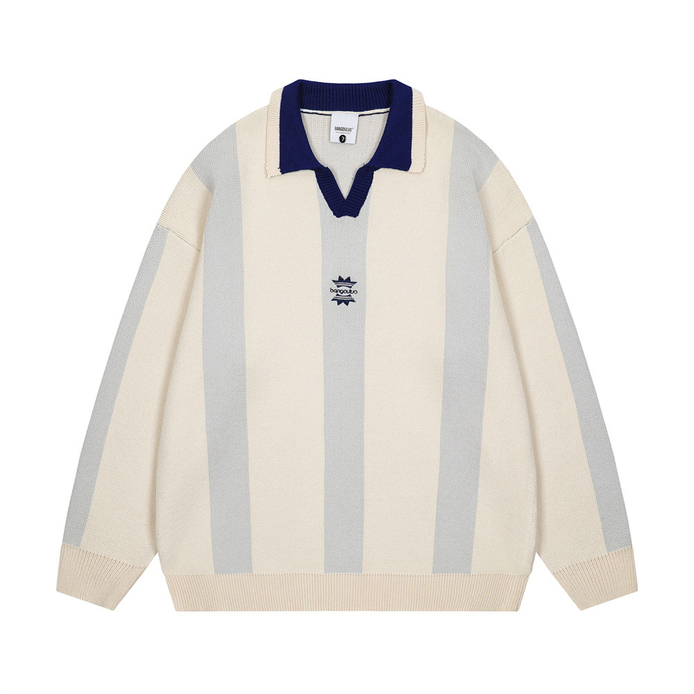 수직 스트라이프 컬러 블록 옷깃 가을 및 겨울 트렌디 브랜드 남성 대학 스타일 느슨한 캐주얼 V 넥 POLO 칼라 스웨터스토어 가기