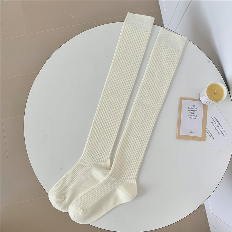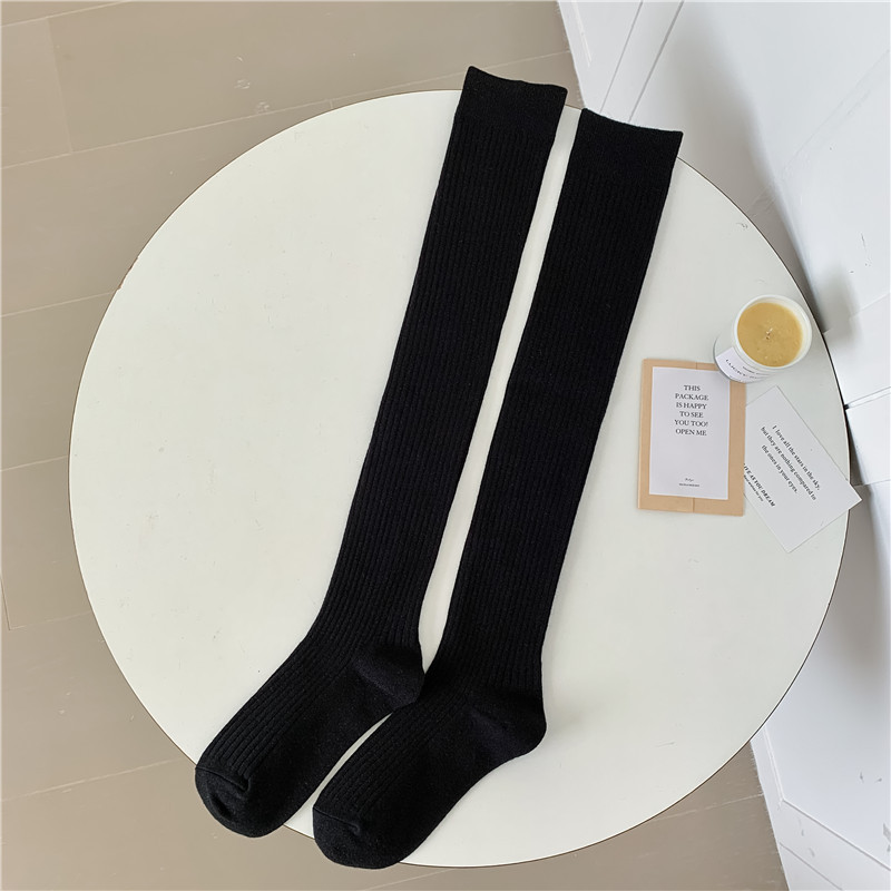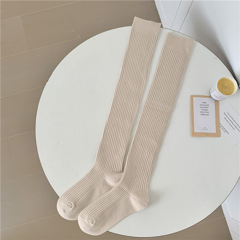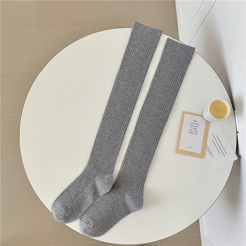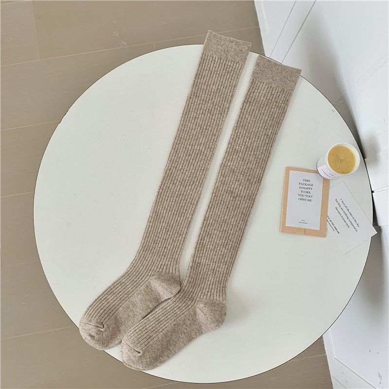 캐시미어 무릎 위까지 오는 가을 겨울 캐시미어 양말 여성용 일본 레트로 스타일 이중 바늘 세로 줄무늬 양말 단색 롱 양말 다용도