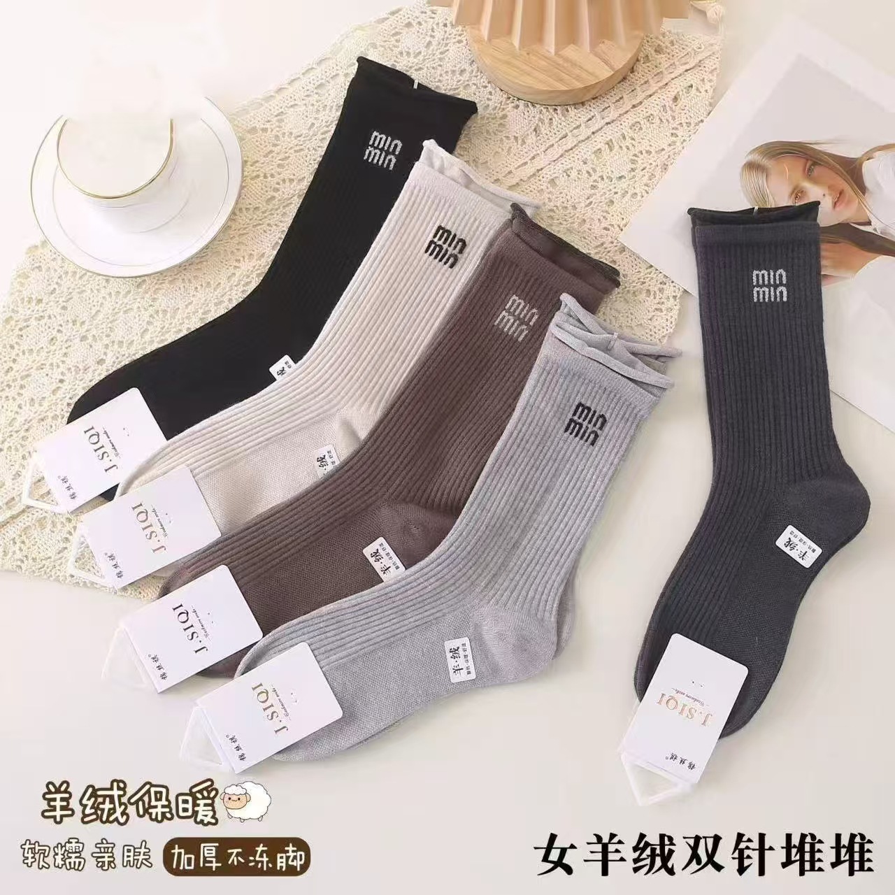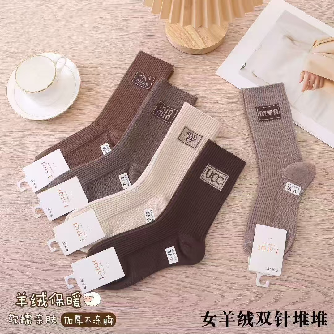 가을 겨울 신상 여성용 이중 바늘 모양 하이삭스, 다용도 캐시미어 양말, 겨울용 두꺼운 커피색 중목 양말, 다용도 레터링