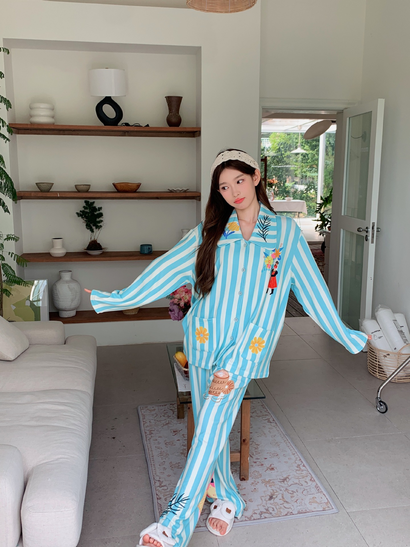 가을과 겨울 새로운 줄무늬 소시지 개 벨벳 두꺼운 긴 소매 잠옷 세트 카디건 귀여운 겉옷 집 옷스토어 가기