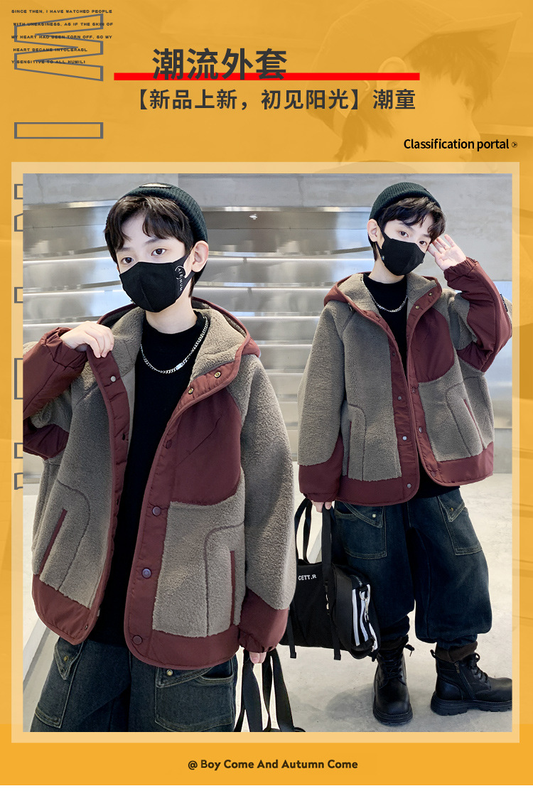 男童冬季连帽毛毛衣外套2024新款大儿童洋气加绒加厚保暖风衣大衣