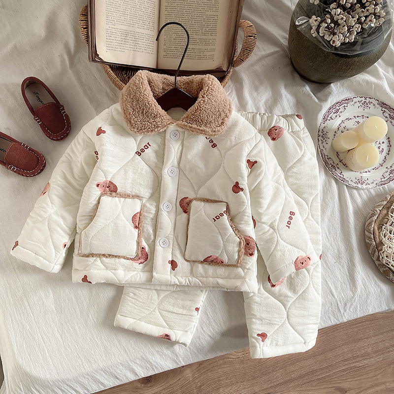 아기 남자와 여자의 겨울 옷 세트 분할 된 두 조각 아기 옷 곰 머리 옷깃 면화 패딩 옷 홈 옷 세트