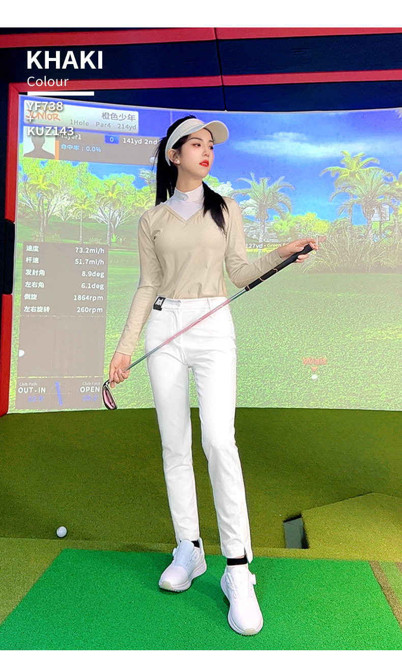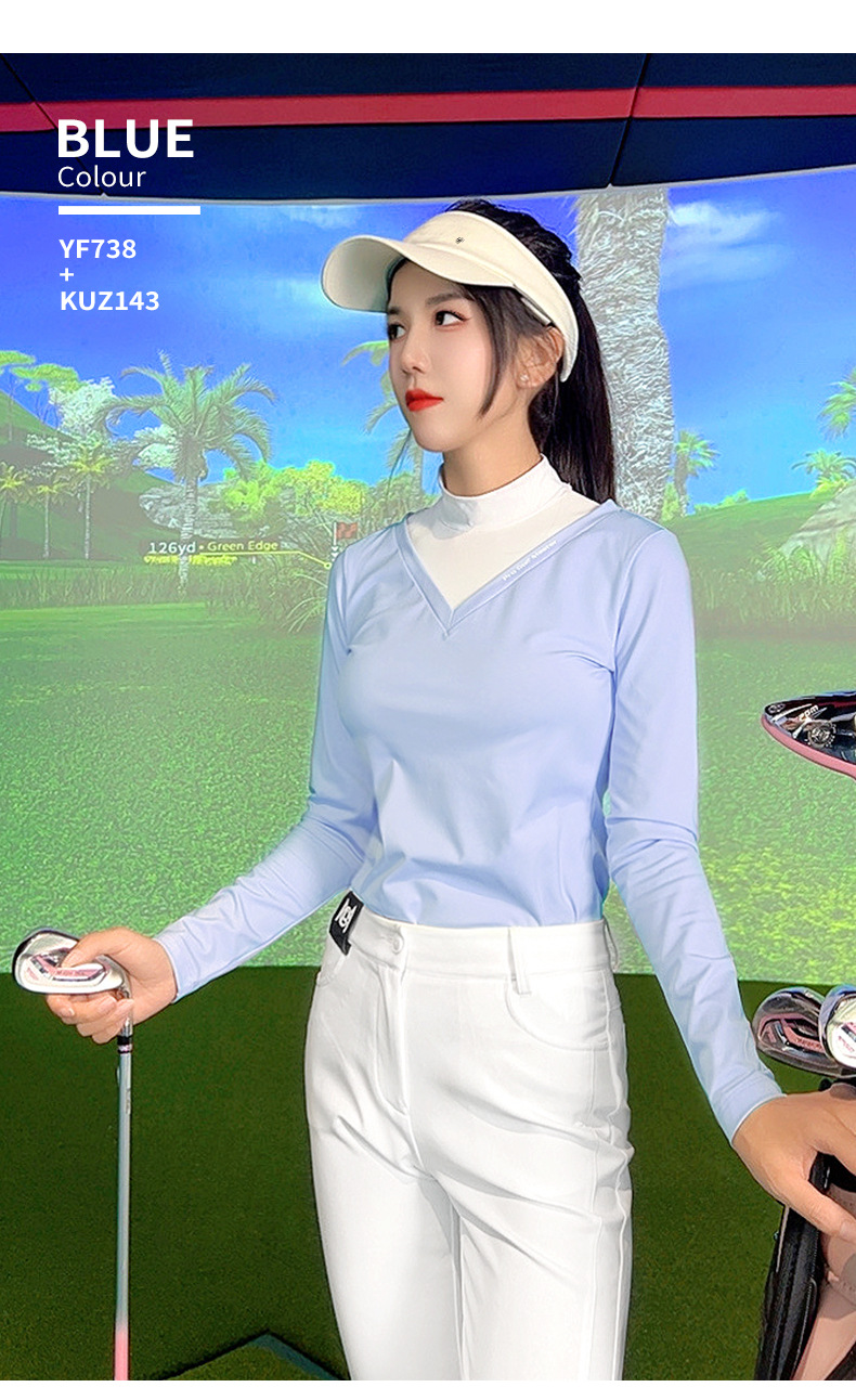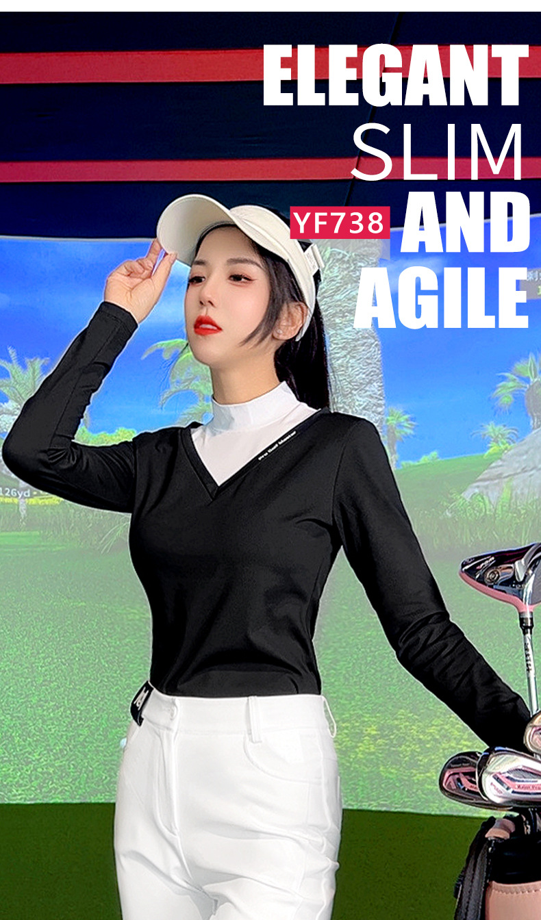 PGM 골프 의류 여성용 긴팔 티셔츠 가짜 투피스 수직 칼라 V넥 탑 자른 바지 바지 세트