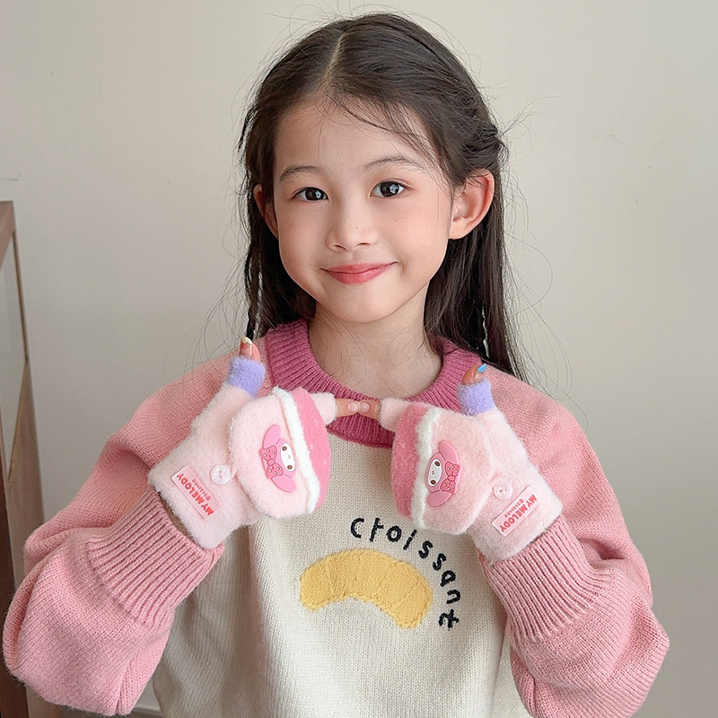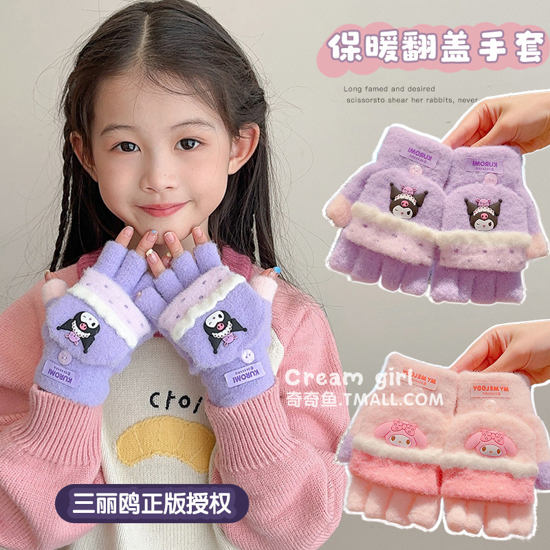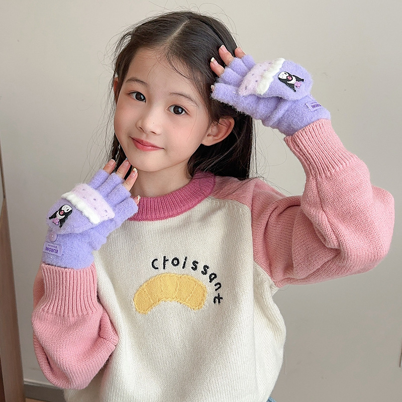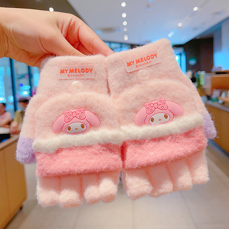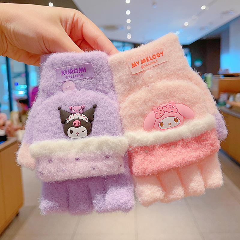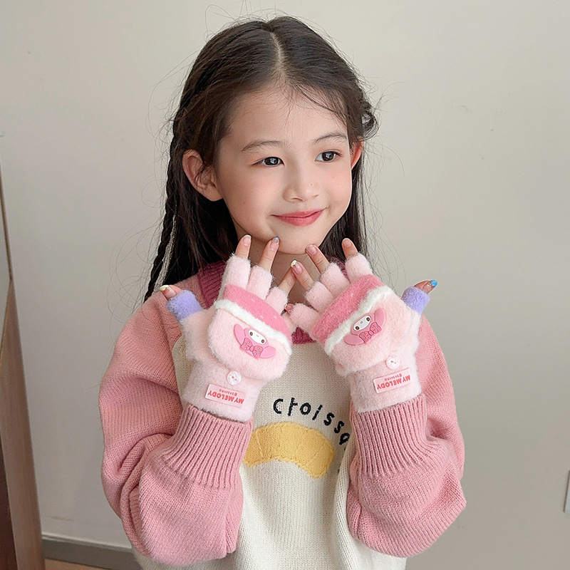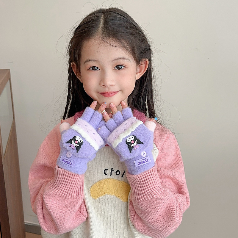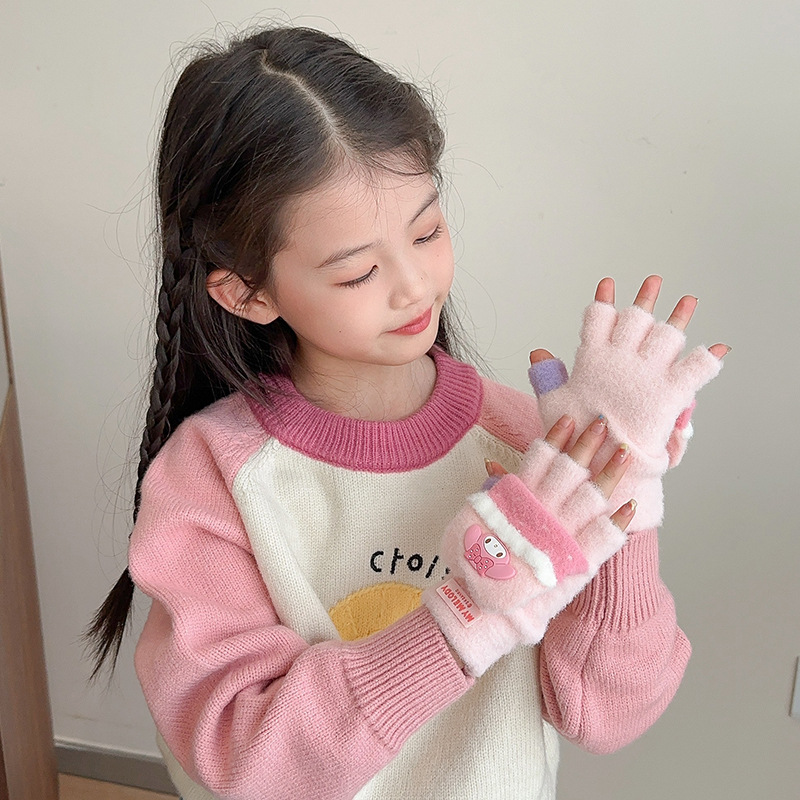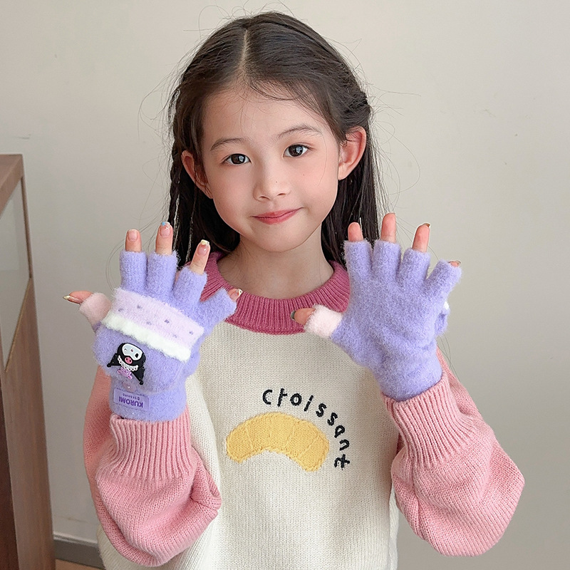 어린이 장갑 가을과 겨울 산리오 쿨로 미 소년과 소녀 초등학생 울 하프 핑거 플립 커버 베어 핑거 글쓰기스토어 가기