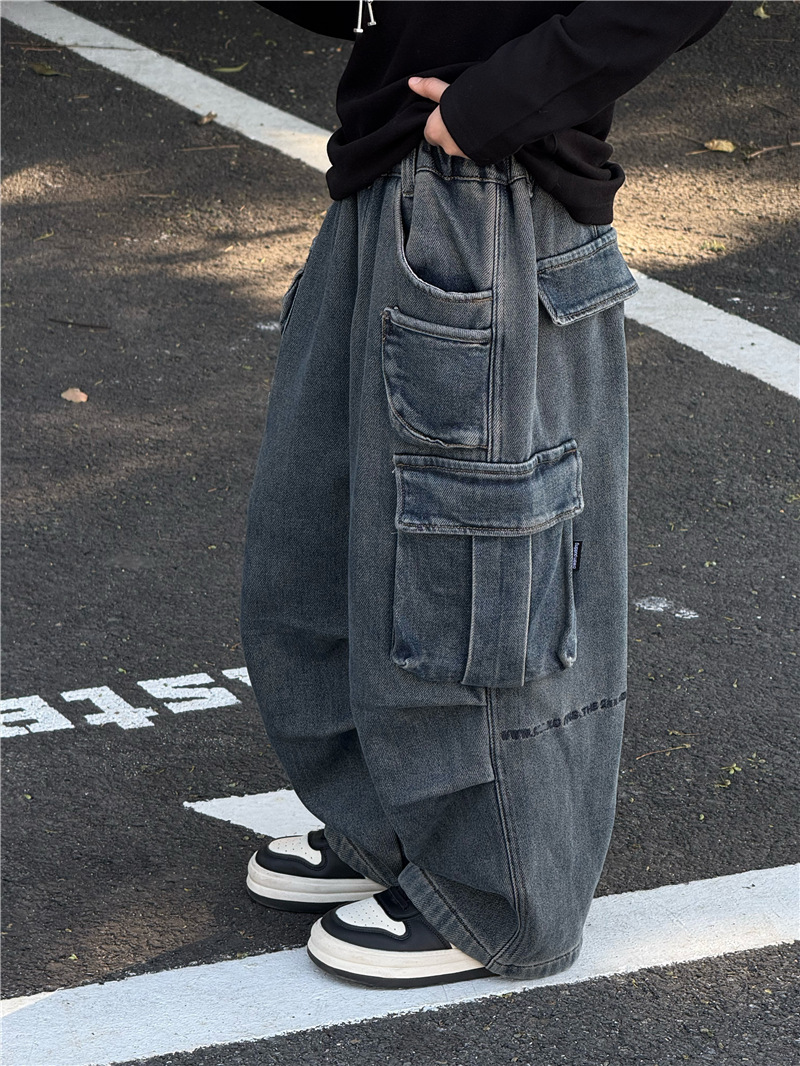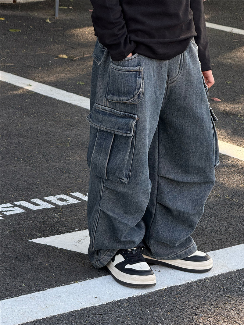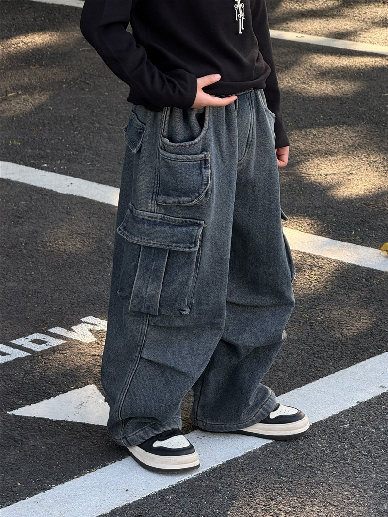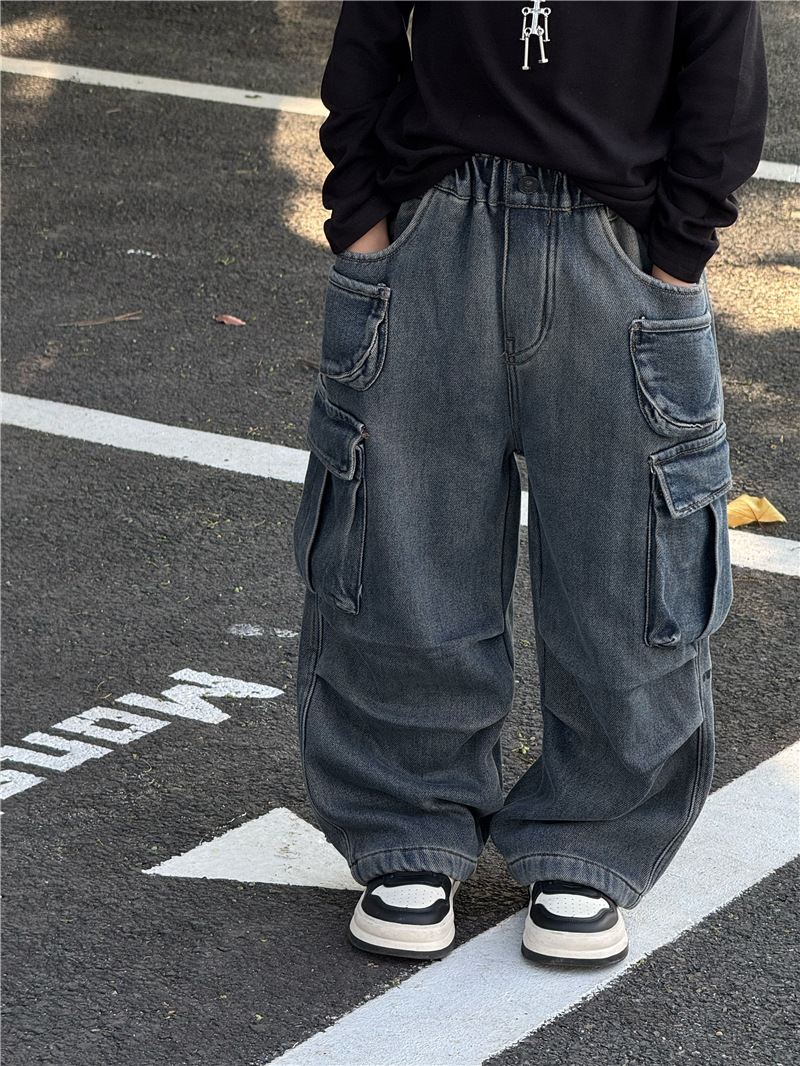 Baoduo 아동복 소년 기모 청바지 겨울 원피스 벨벳 2024 새 바지 두꺼운 100-170 바지