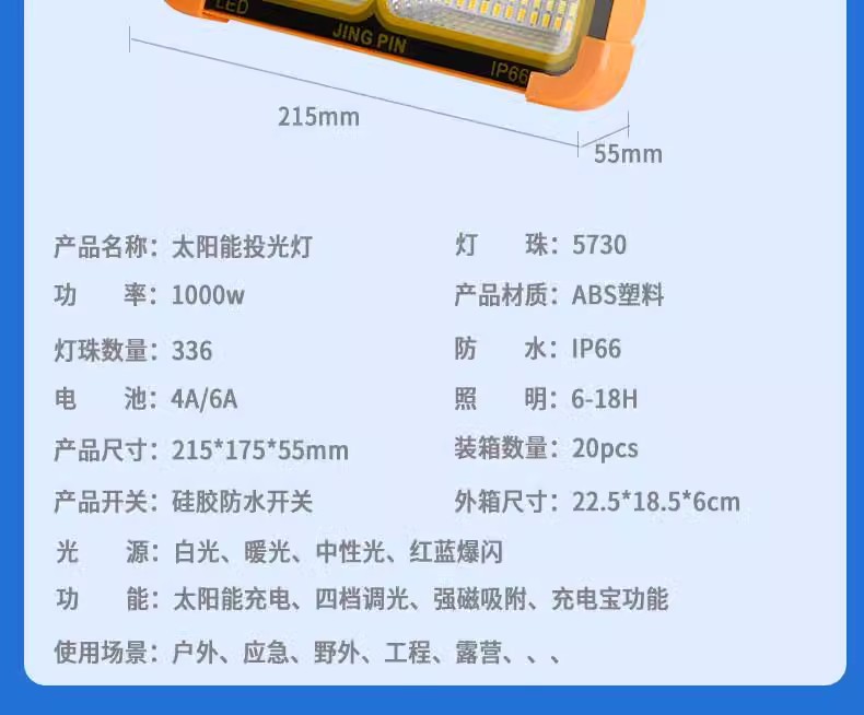 • 폭발적인 200W 작은 노란색 조명 + 5단계 디밍 + 충전식 휴대폰