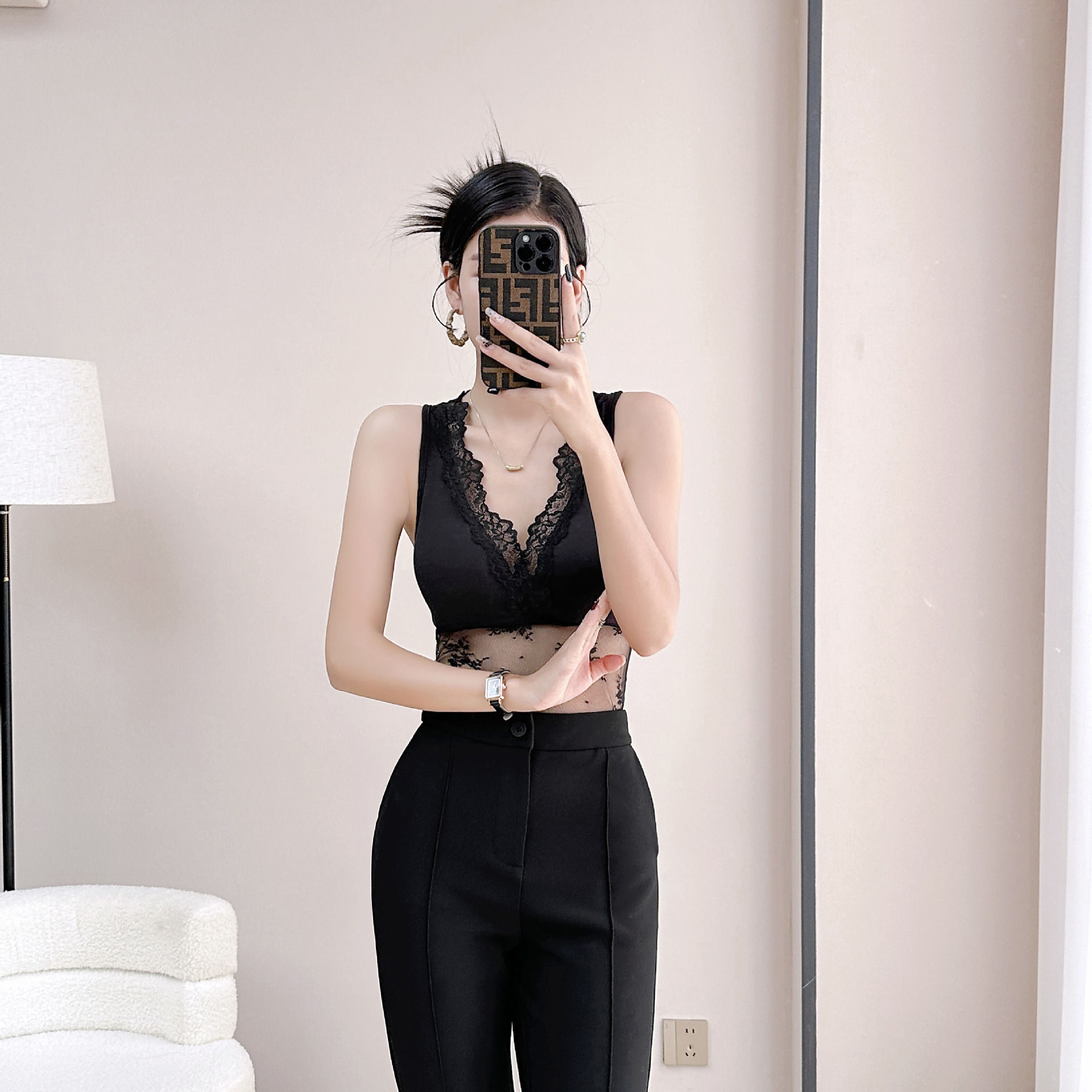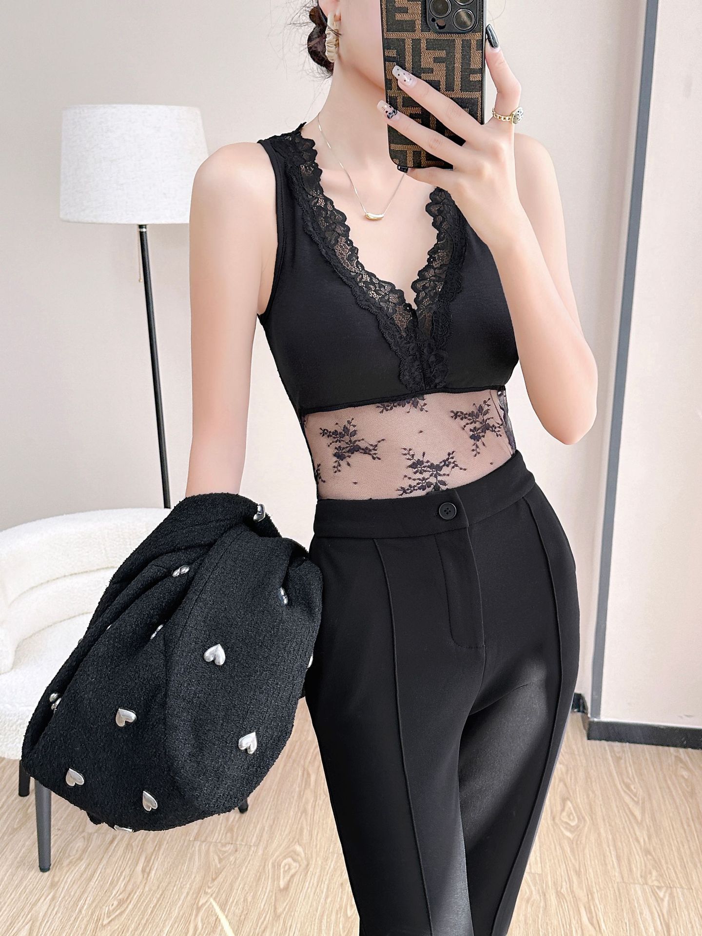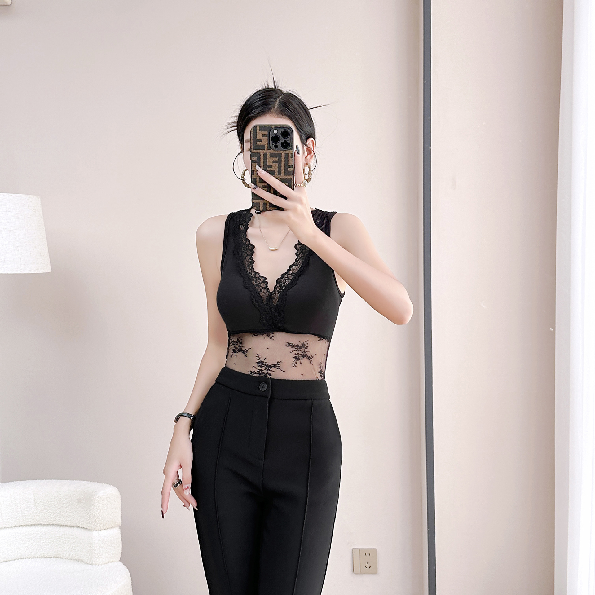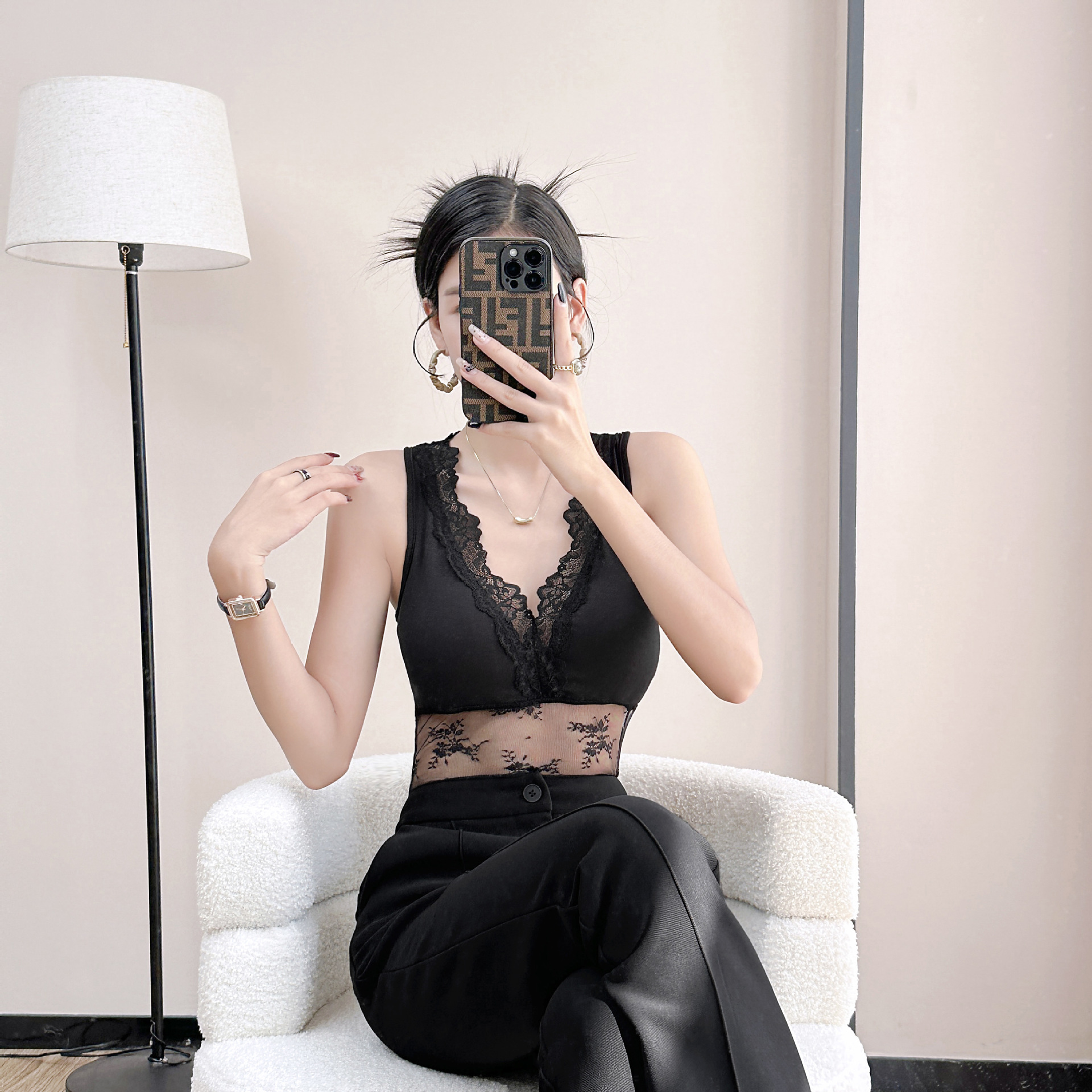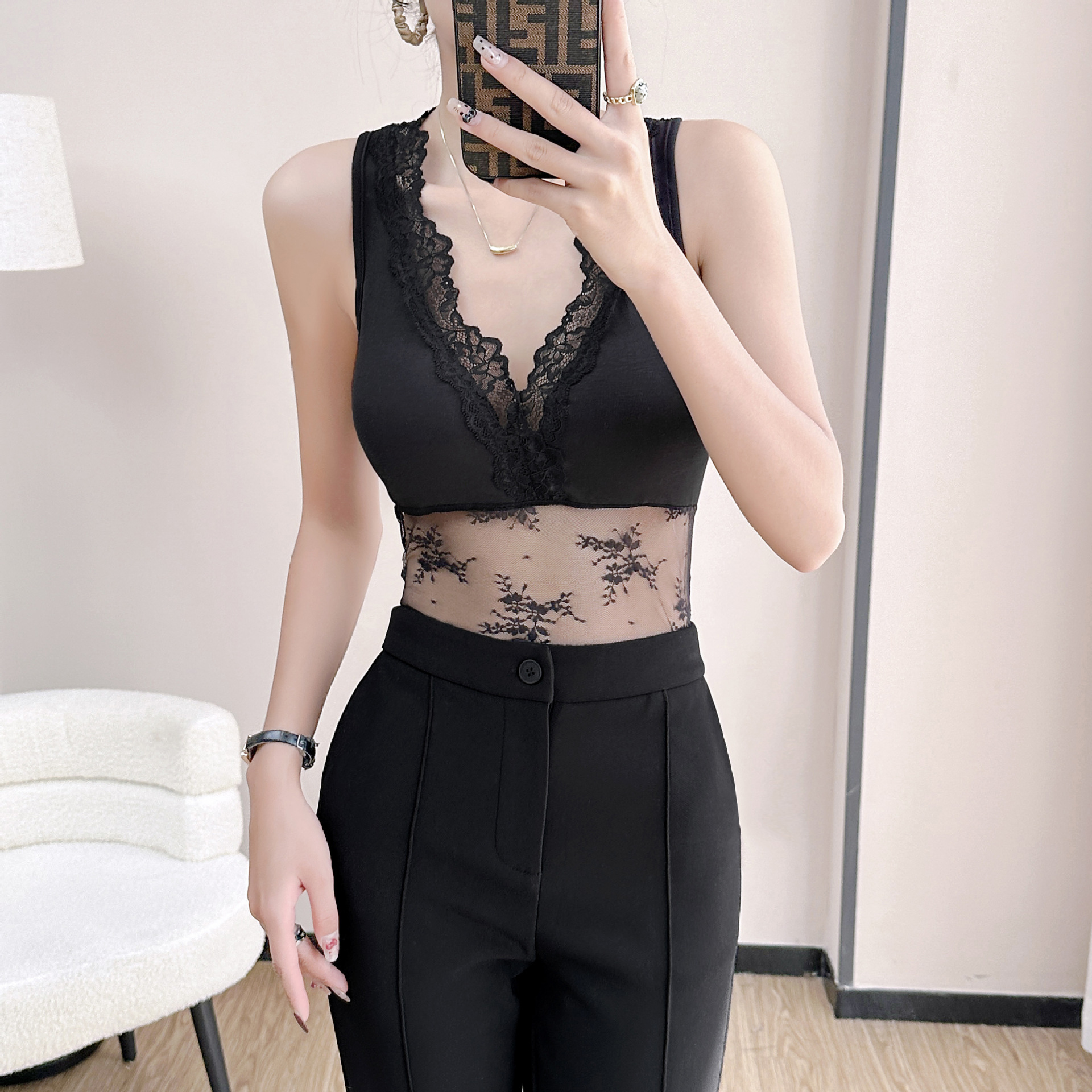 레이스 메쉬 스티칭 섹시한 스파이스 소녀 조끼 베이스 슬링 여성 내부 벨트 가슴 패드 슬림 핏 할로우 아웃 가슴 랩 탑