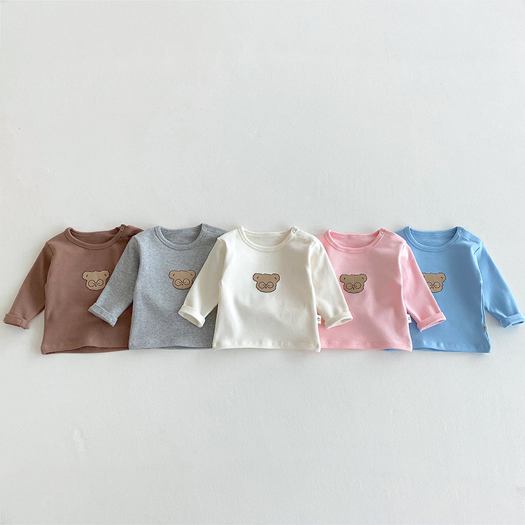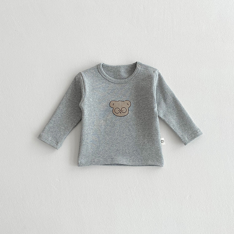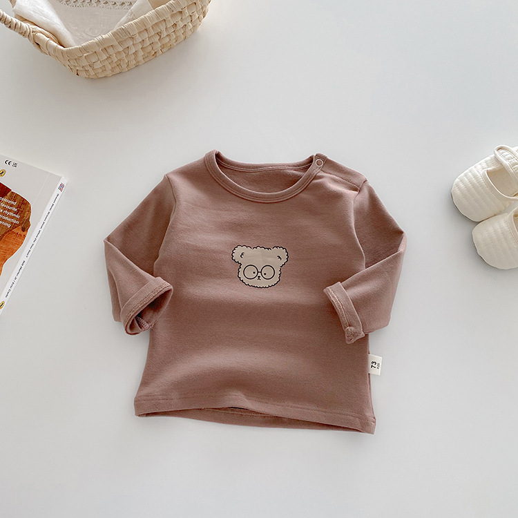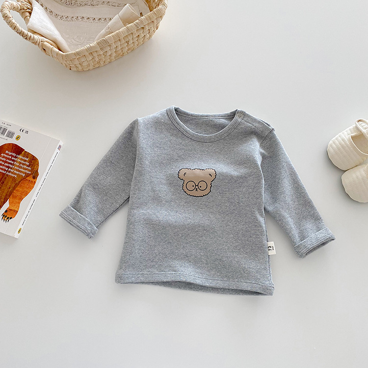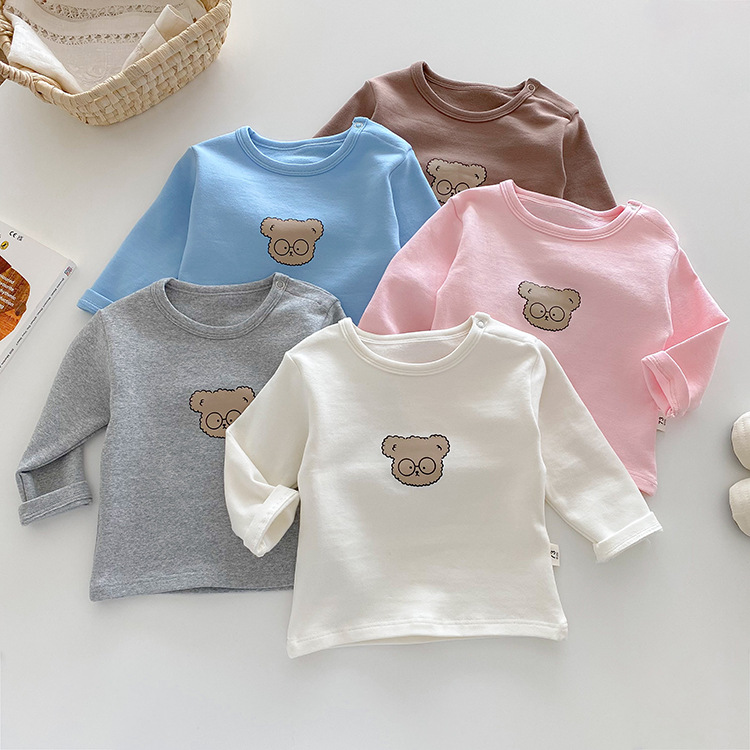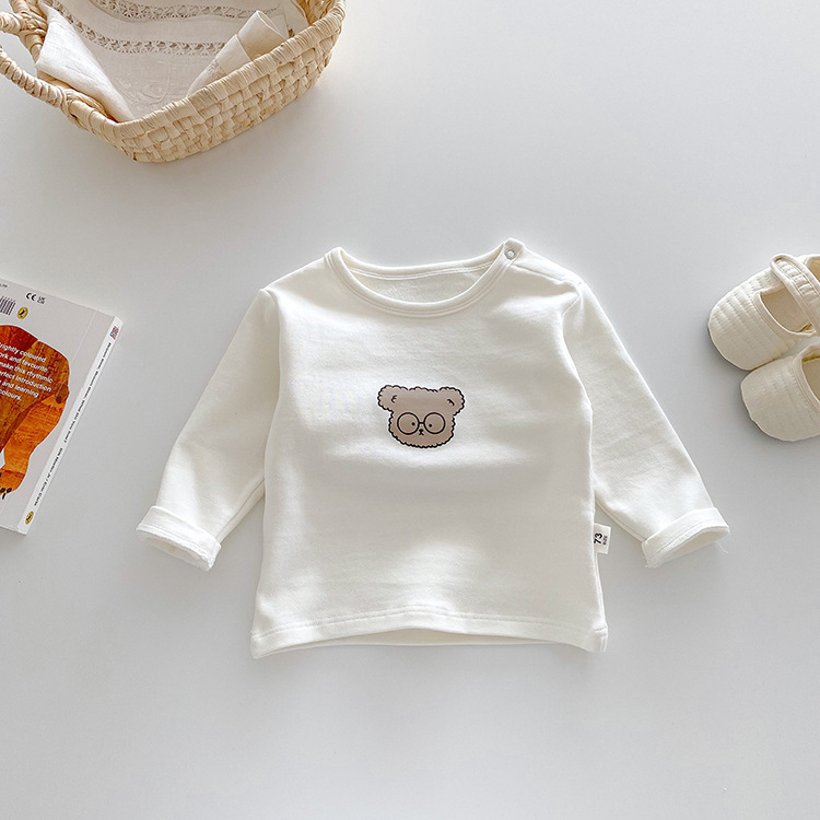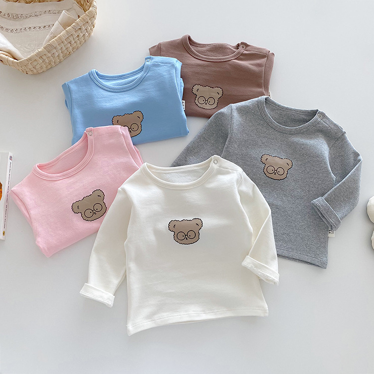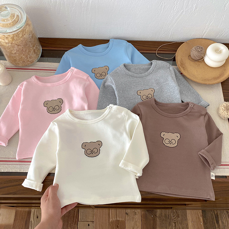 2024 한국식 아기 간단한 귀여운 곰 면 긴팔 티셔츠 아기 가을과 겨울 샌딩 따뜻한 베이스 셔츠