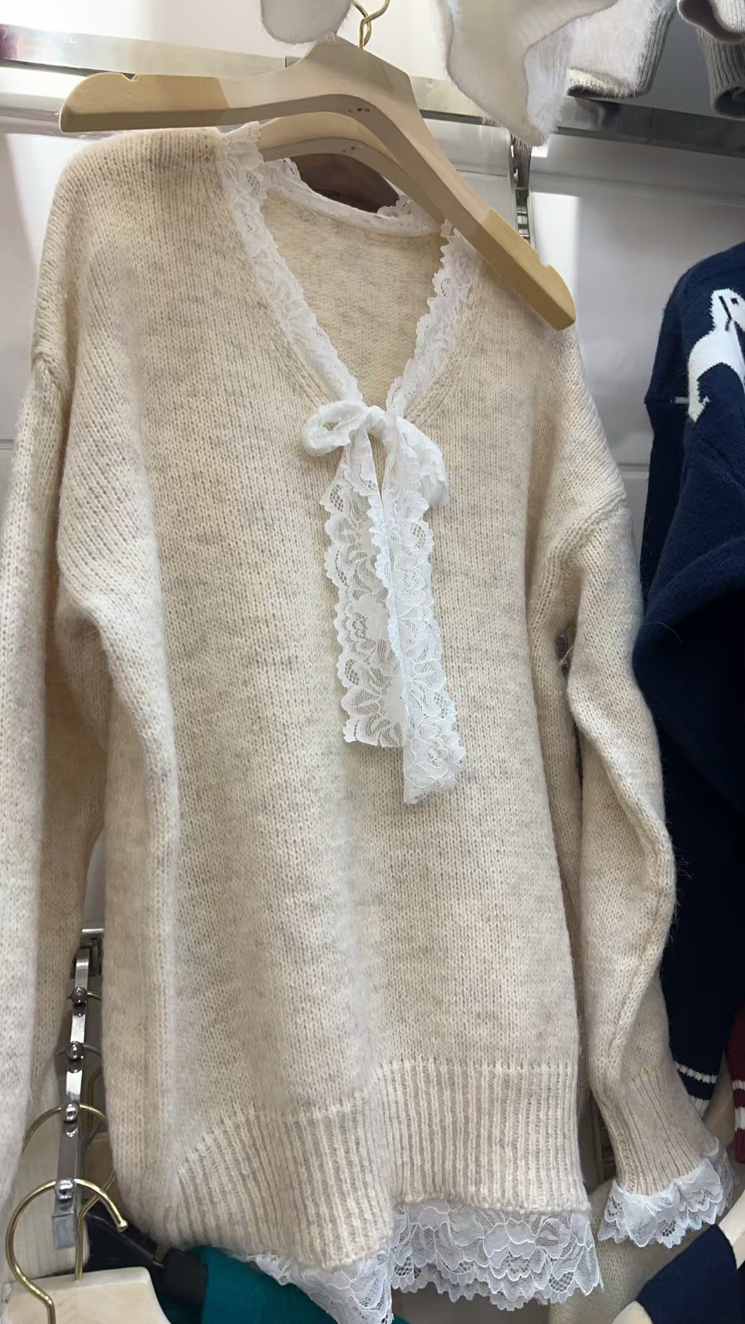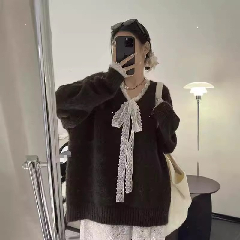 YUNSHU 한국식 디자인 센스 레이스 리본 소프트 왁스 풀오버 스웨터 여성의 가을과 겨울 느슨한 게으른 스타일 니트 스웨터
