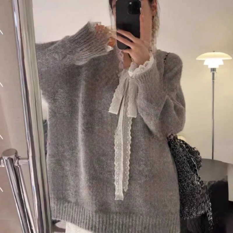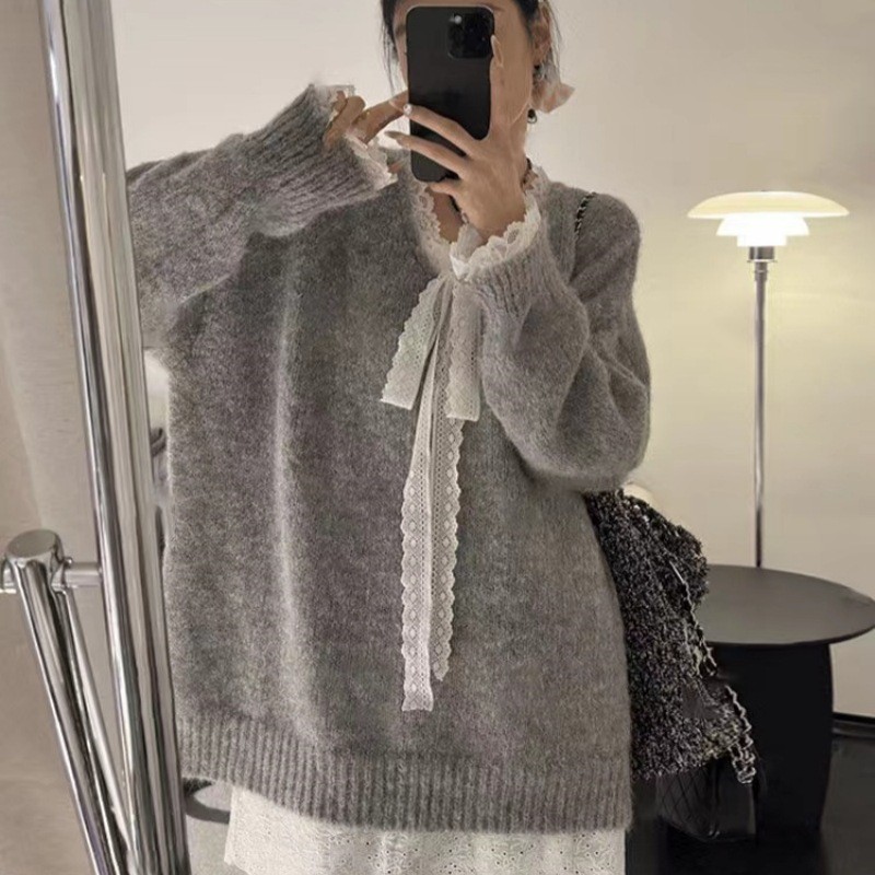 YUNSHU 한국식 디자인 센스 레이스 리본 소프트 왁스 풀오버 스웨터 여성의 가을과 겨울 느슨한 게으른 스타일 니트 스웨터스토어 가기