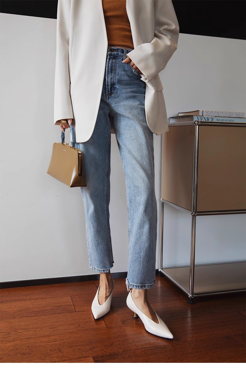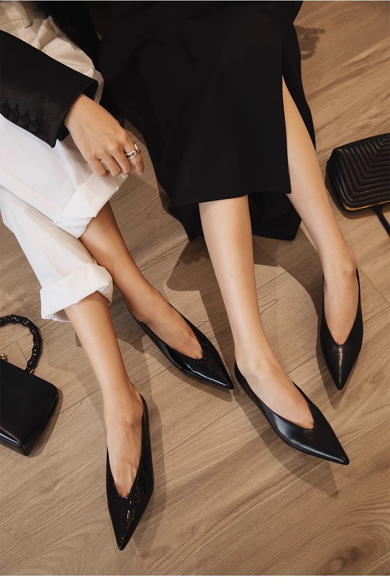 기질 틈새 느낌 ~ 2024 년 이른 봄 새로운 뾰족한 깊은 v 새끼 고양이 다큐멘터리 신발 특허 가죽 미드 힐 여성 신발스토어 가기