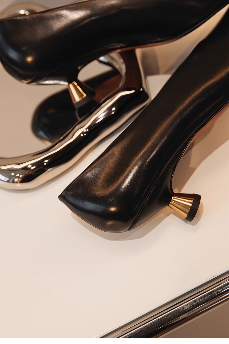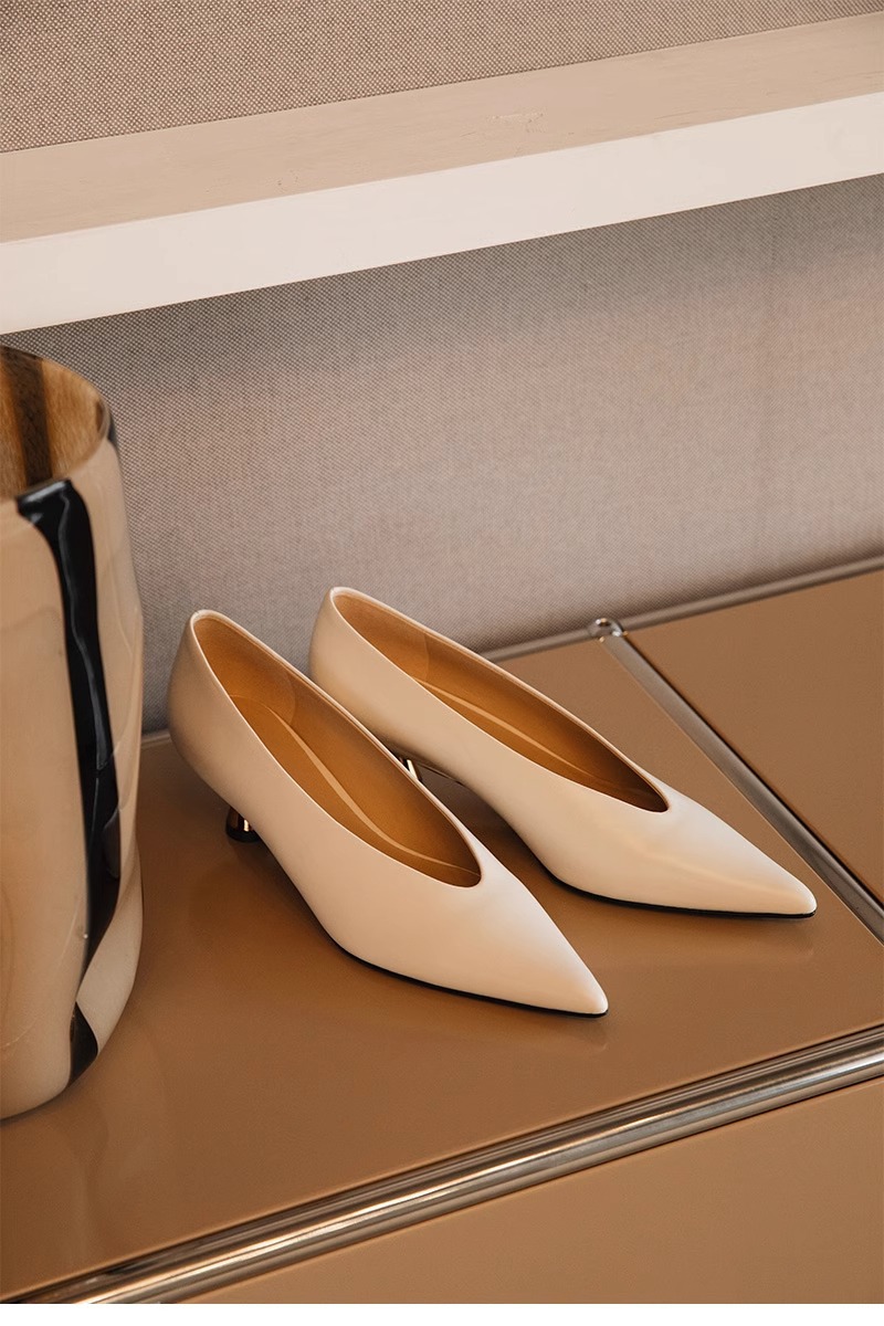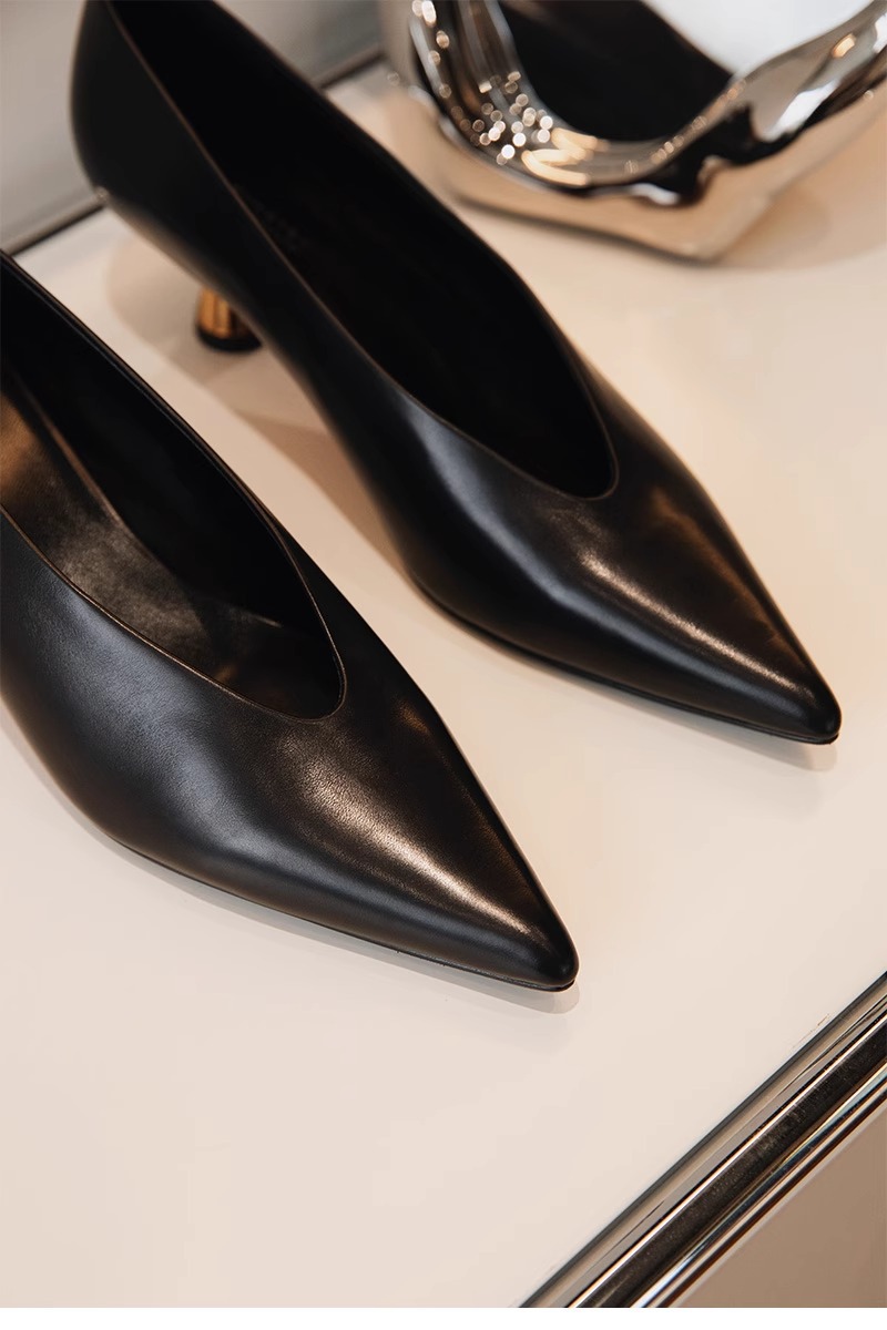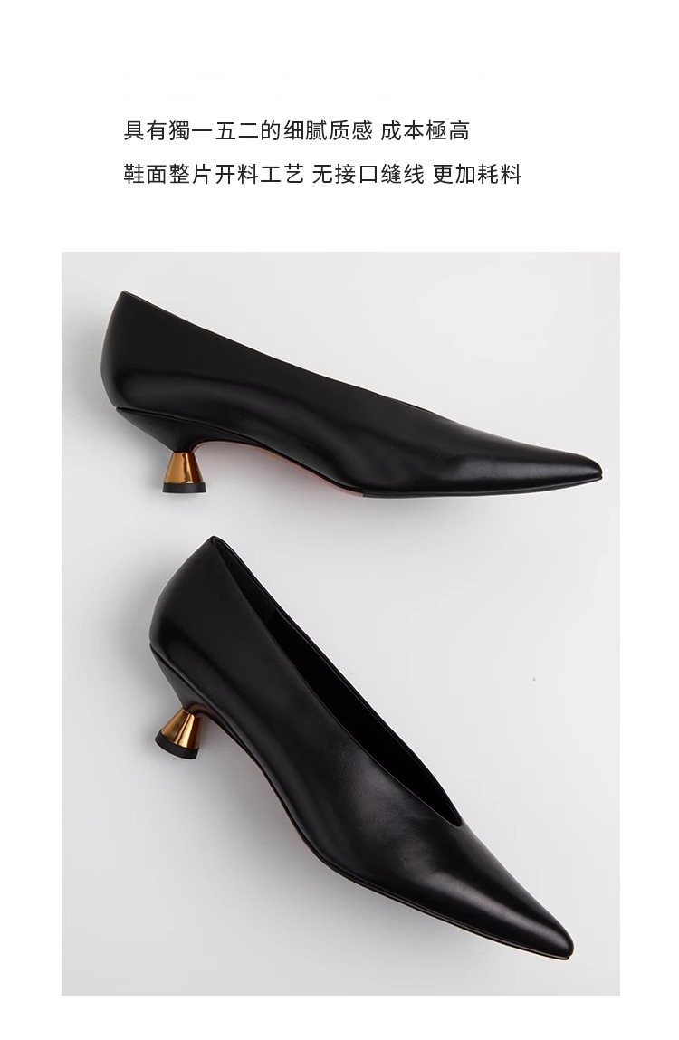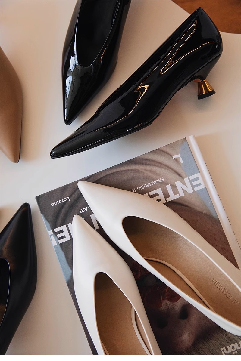 기질 틈새 느낌 ~ 2024 년 이른 봄 새로운 뾰족한 깊은 v 새끼 고양이 다큐멘터리 신발 특허 가죽 미드 힐 여성 신발