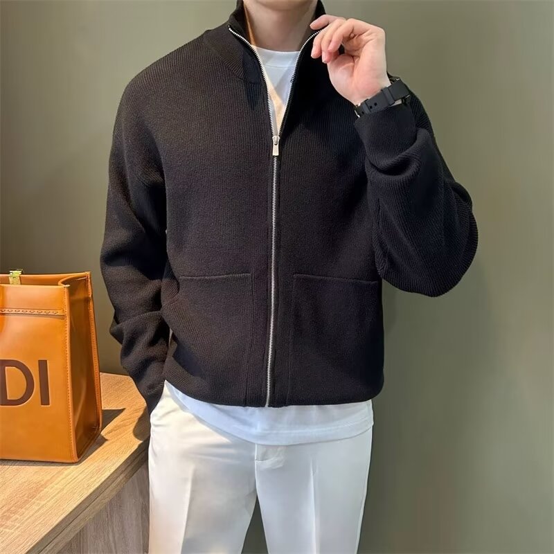 니트 가디건 남성 스웨터 남성용 2024 가을 겨울 트렌디 브랜드 사이드 긴소매 포켓 스탠드 칼라 캐주얼스토어 가기