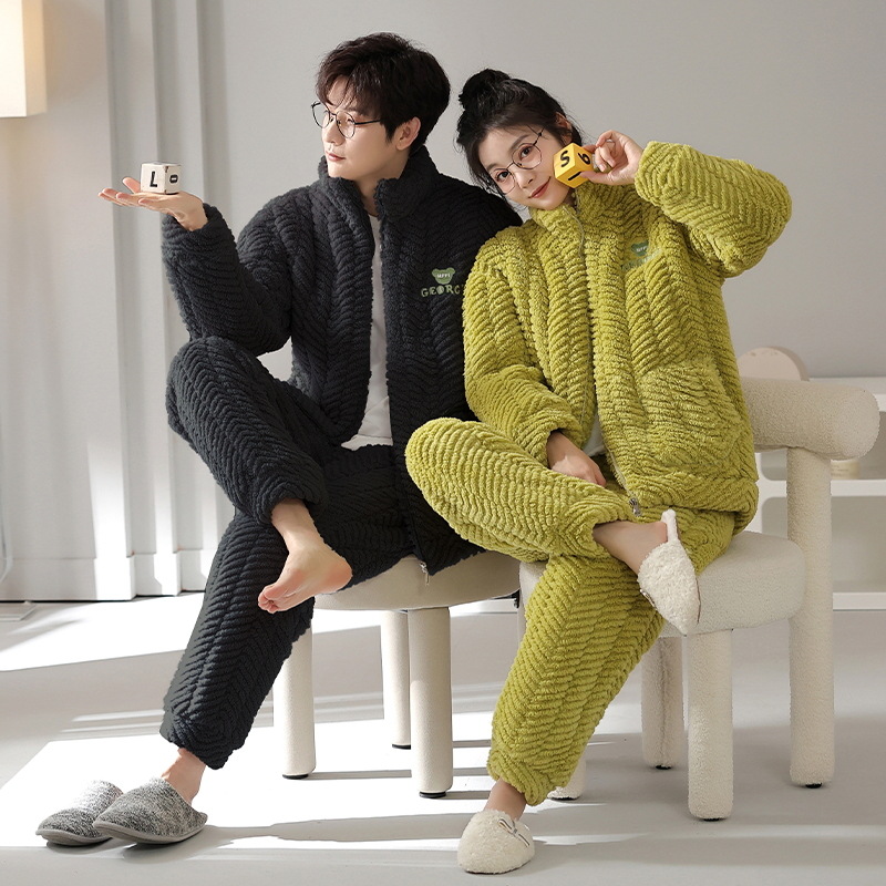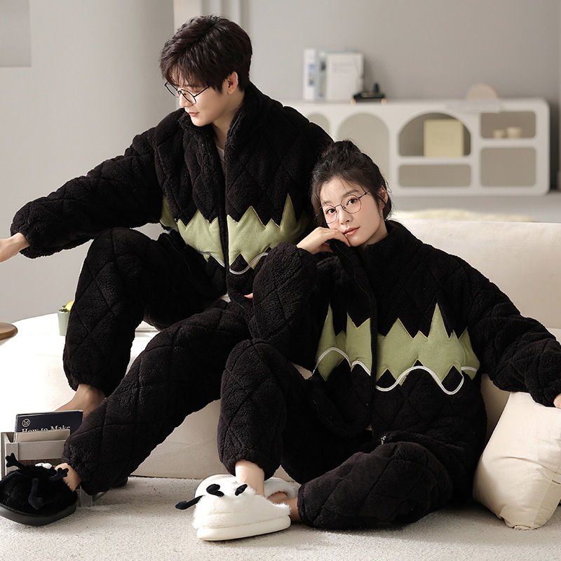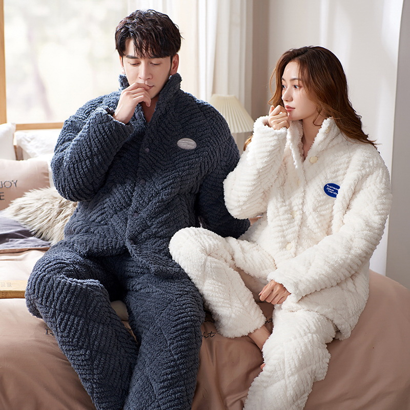 겨울 두꺼운 커플의 플란넬 파자마 여성의 따뜻한 간단한 외모 가정 옷 남성 3 층 퀼트 세트