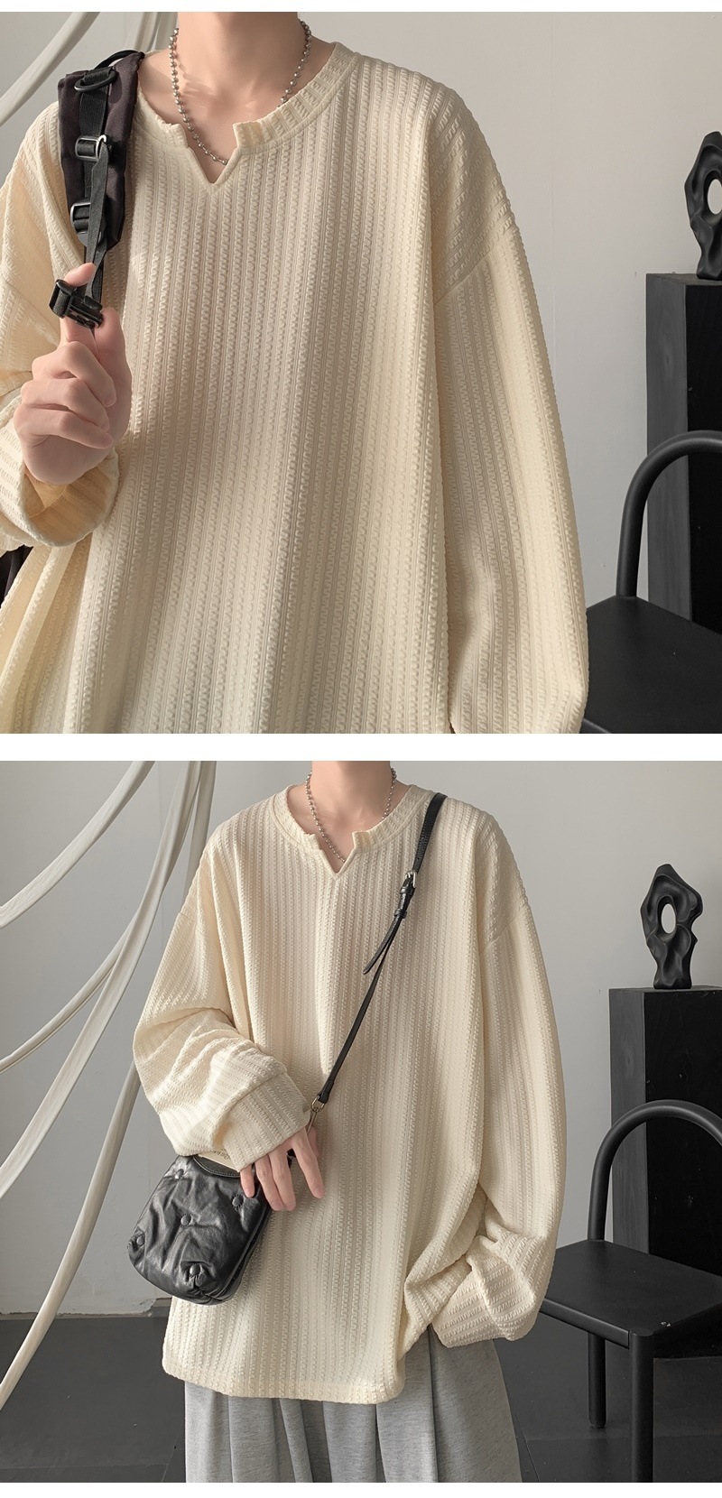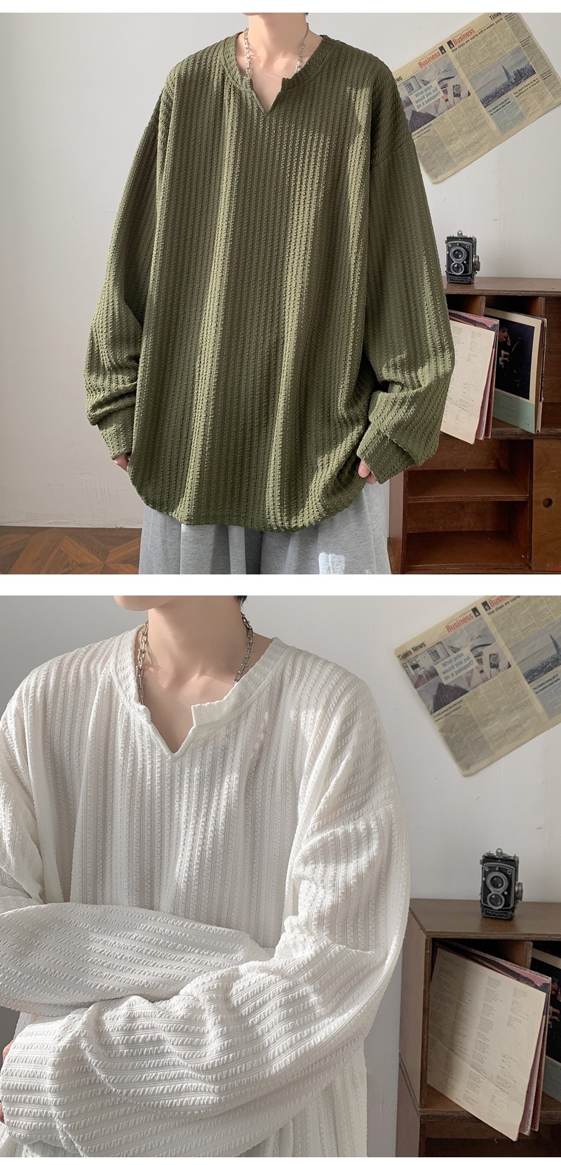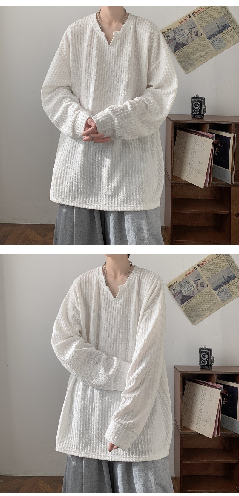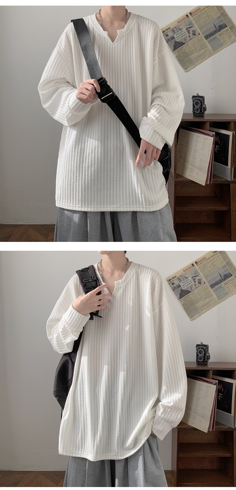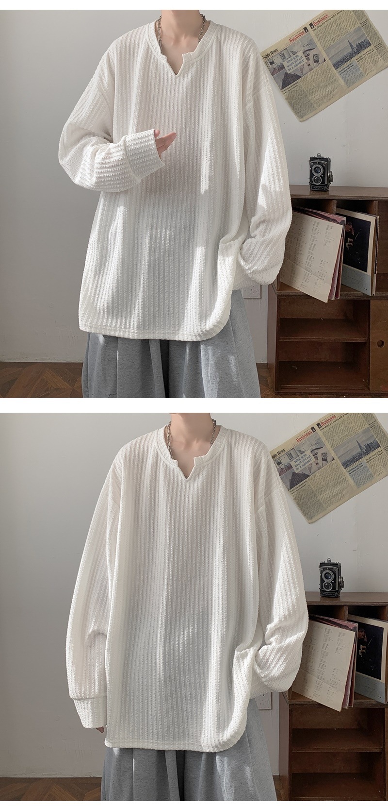 미국식 하이 스트리트 V 넥 스웨트 셔츠 남성용 봄과 가을 단색 간단한 캐주얼 올 매치 텍스처 헤비 화이트 긴팔 티셔츠스토어 가기