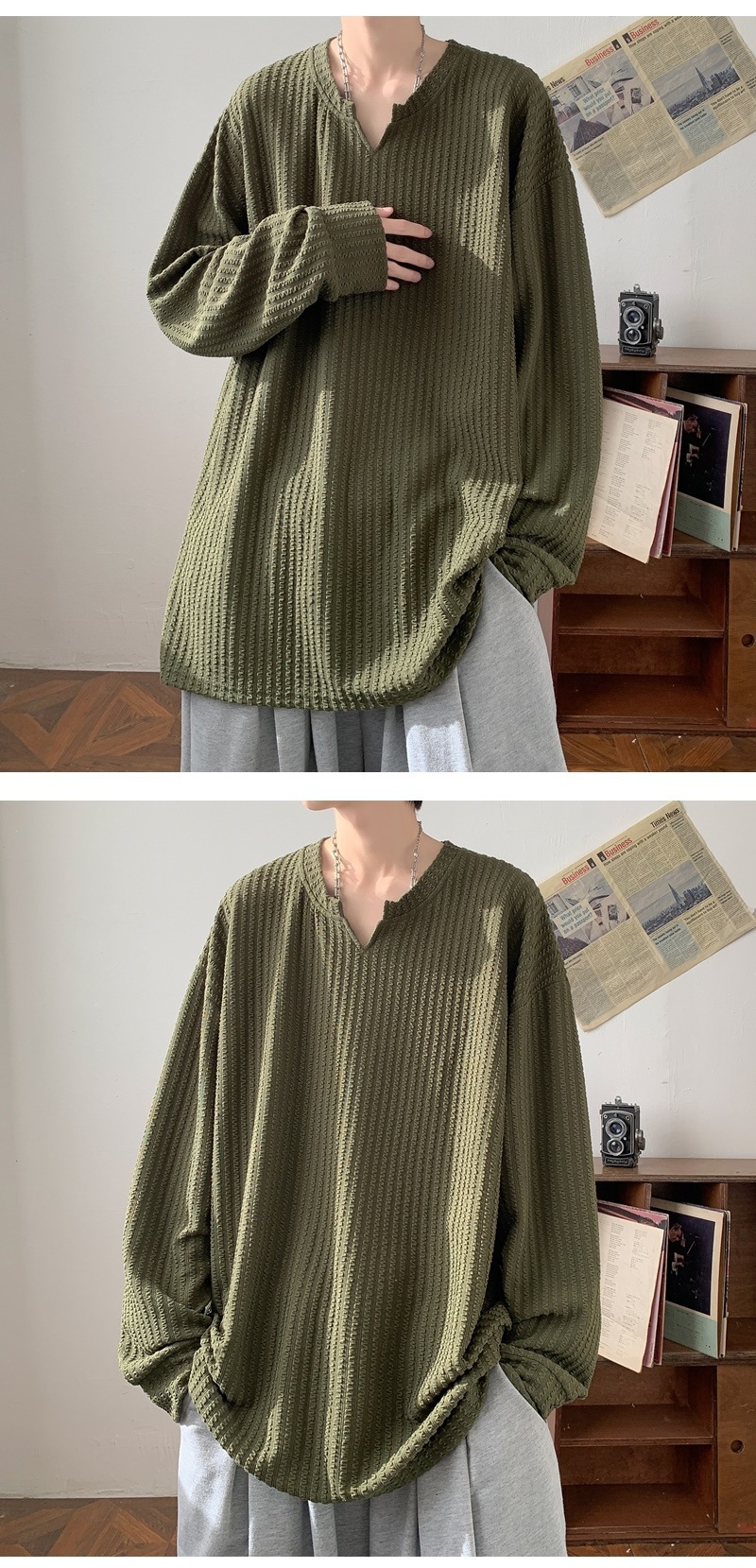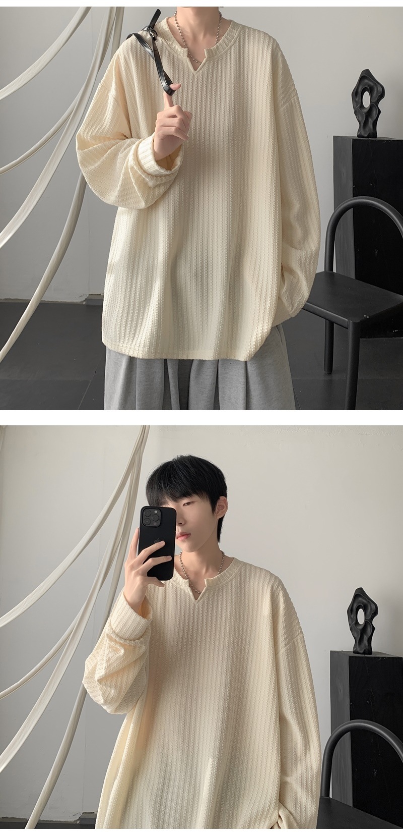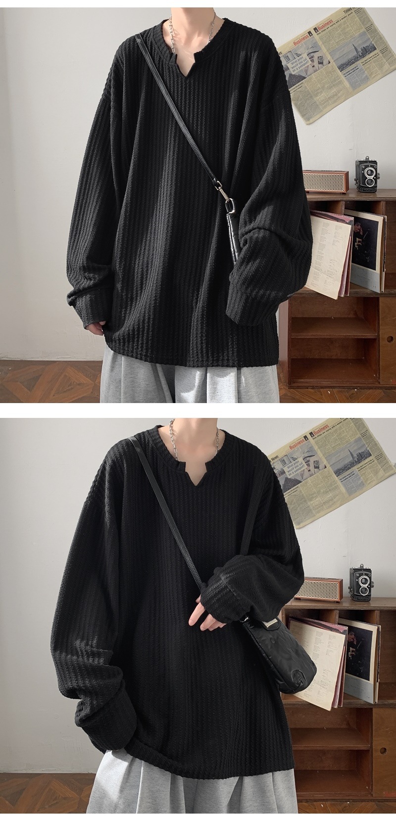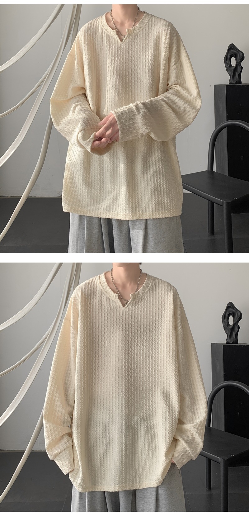 미국식 하이 스트리트 V 넥 스웨트 셔츠 남성용 봄과 가을 단색 간단한 캐주얼 올 매치 텍스처 헤비 화이트 긴팔 티셔츠스토어 가기
