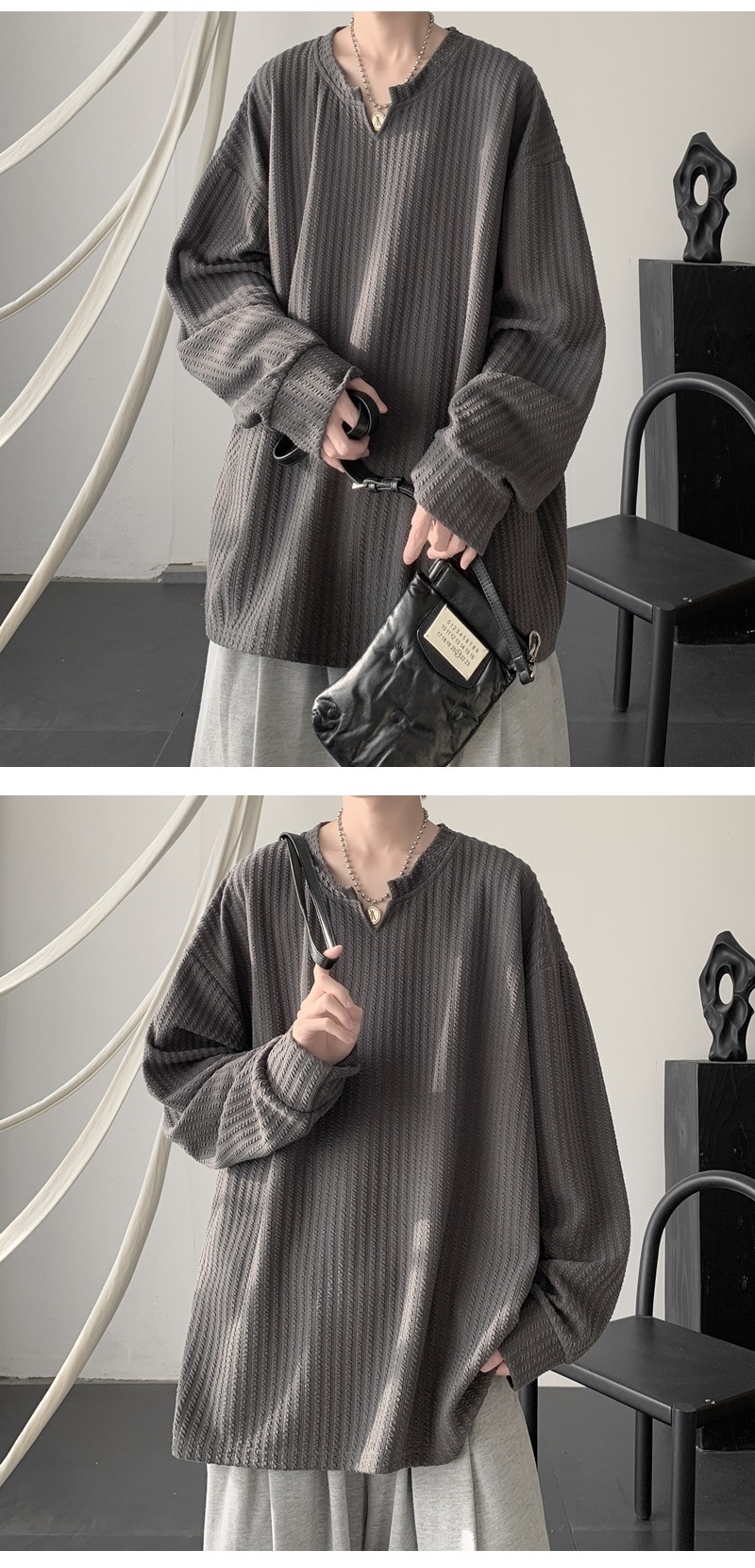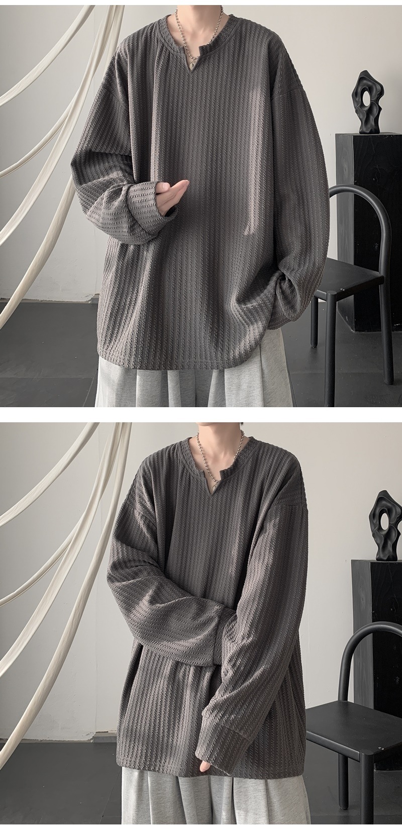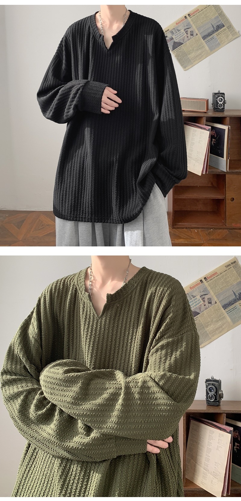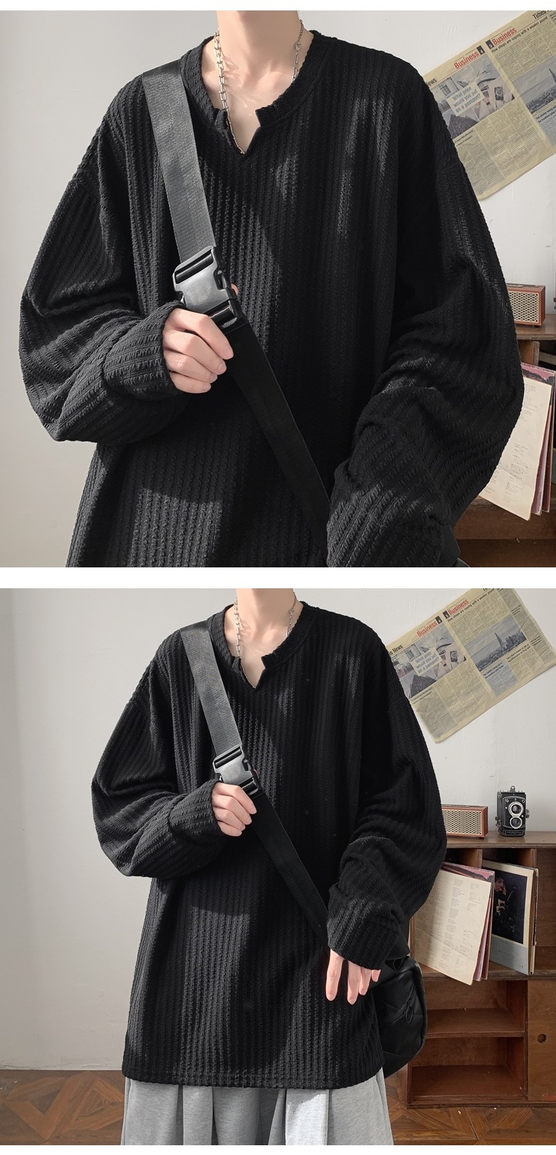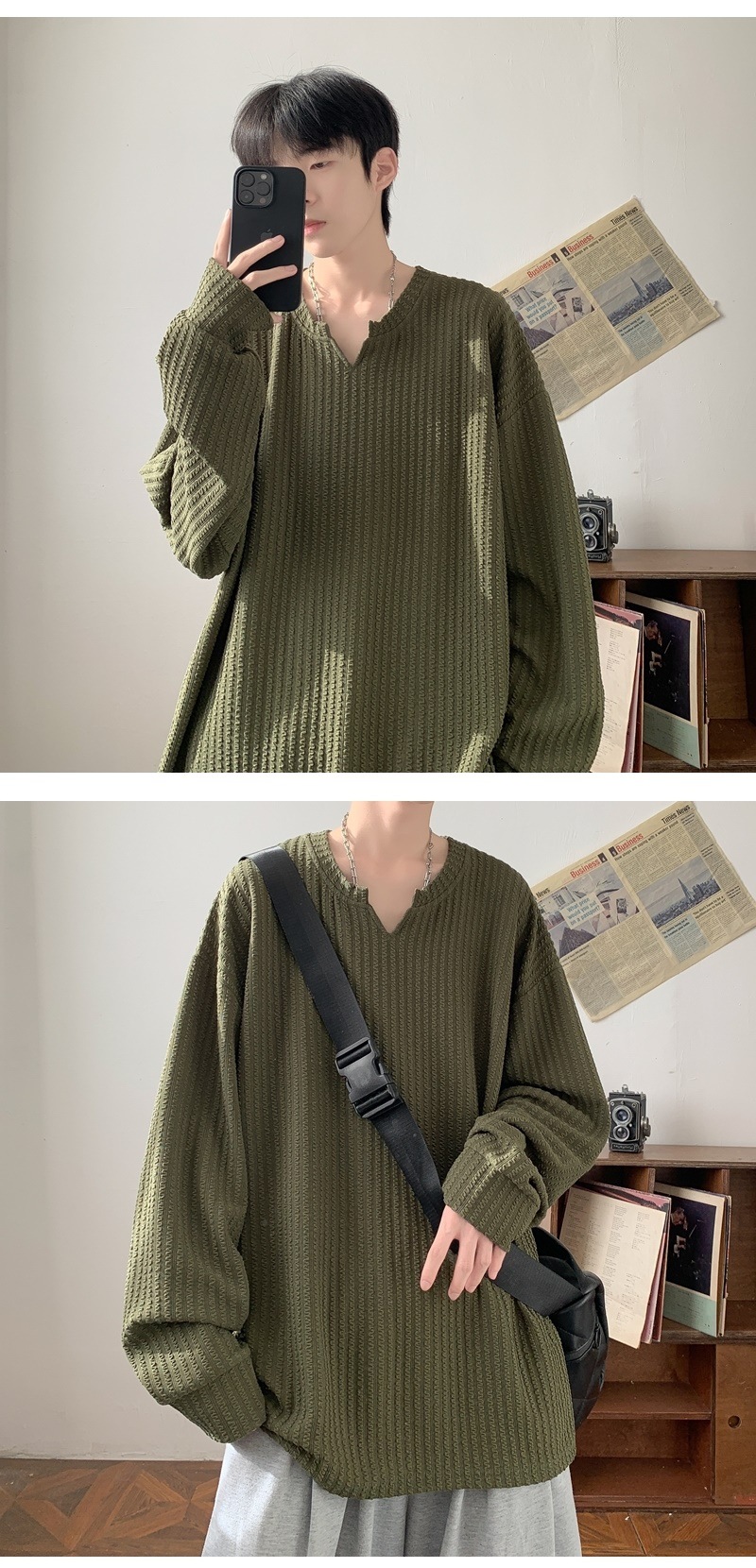 미국식 하이 스트리트 V 넥 스웨트 셔츠 남성용 봄과 가을 단색 간단한 캐주얼 올 매치 텍스처 헤비 화이트 긴팔 티셔츠스토어 가기