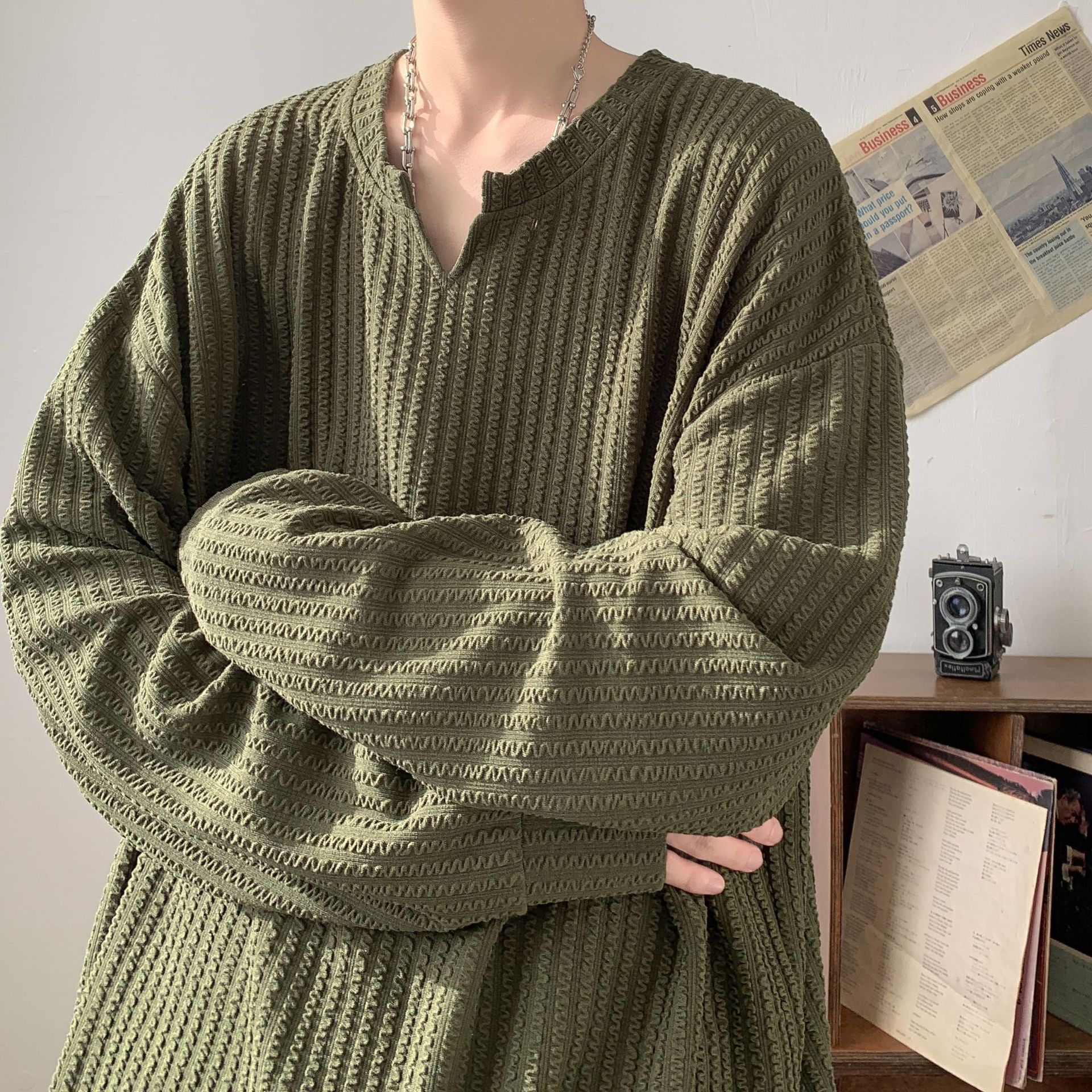 미국식 하이 스트리트 V 넥 스웨트 셔츠 남성용 봄과 가을 단색 간단한 캐주얼 올 매치 텍스처 헤비 화이트 긴팔 티셔츠