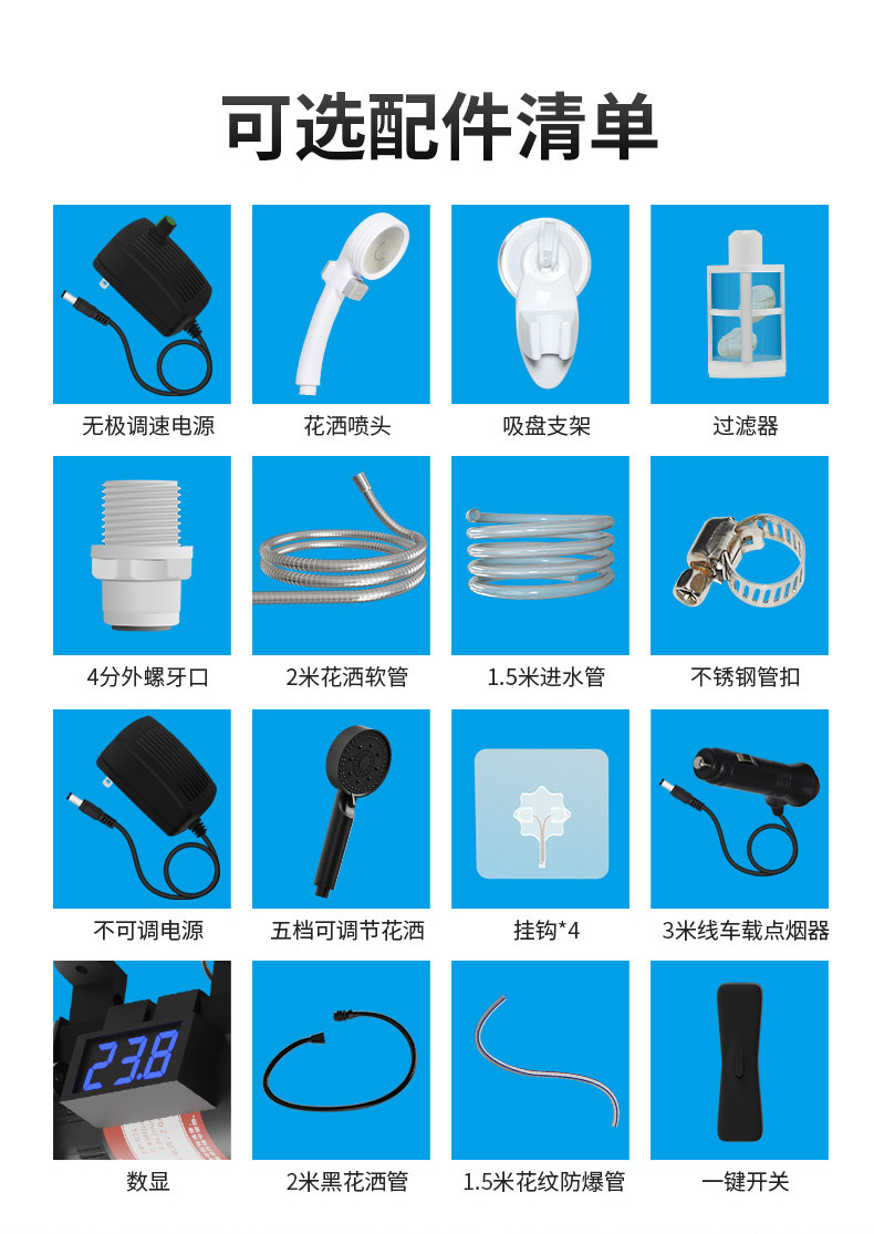 • 가정용 전원 공급 장치 + 자동차 코드 이중 목적 부스터 샤워 헤드