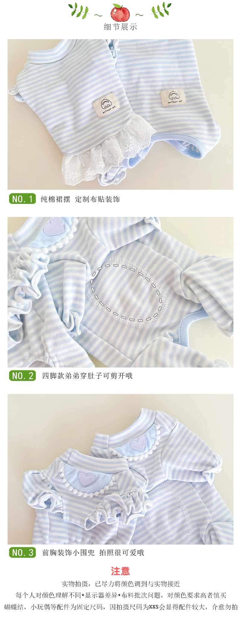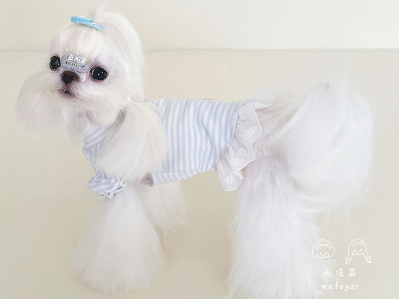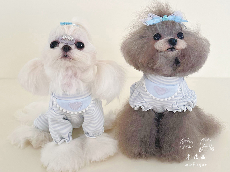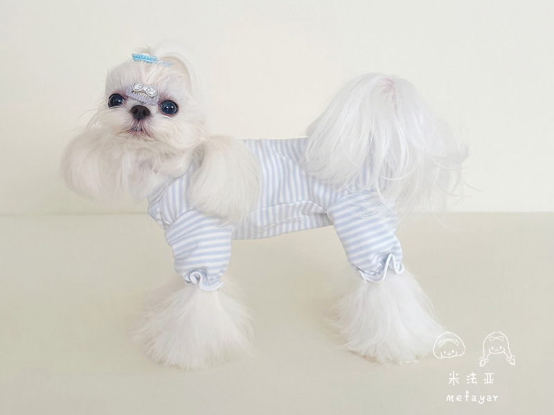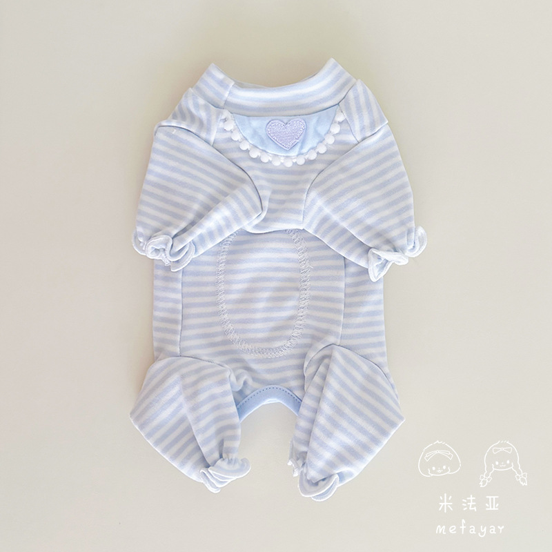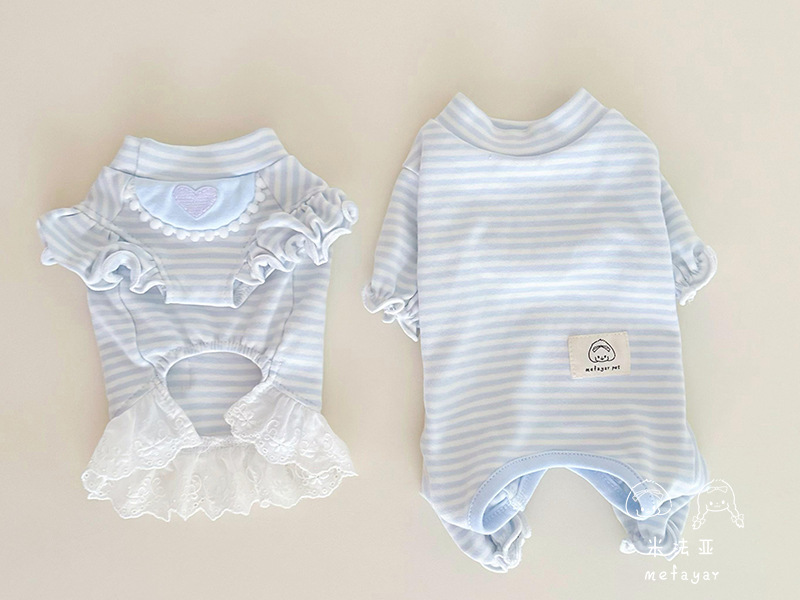 Mifaya 애완 동물 고양이와 개 옷 순수한면 푸른 줄무늬 봄과 가을 커플 슬리브 스커트 4 개 다리 가방 벨리 옷 홈베이스