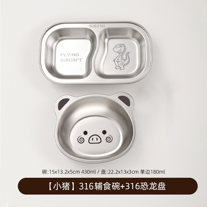 • [4종세트 + 316 항균] 돼지그릇 + 공룡접시 + 어린이용 포크와 스푼