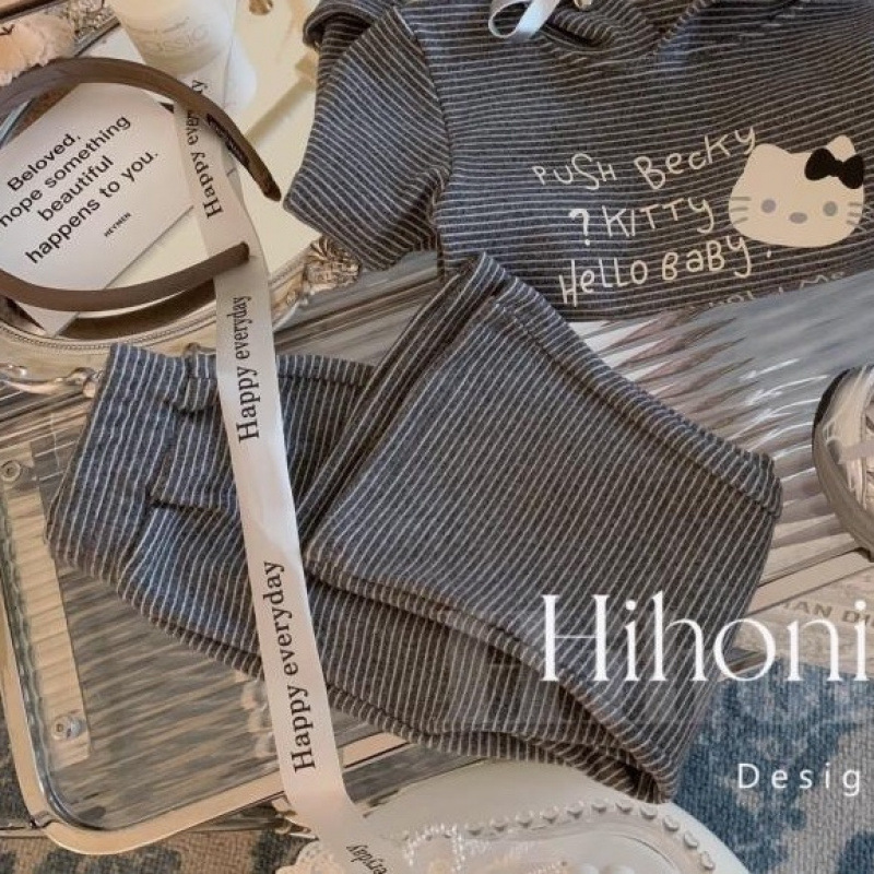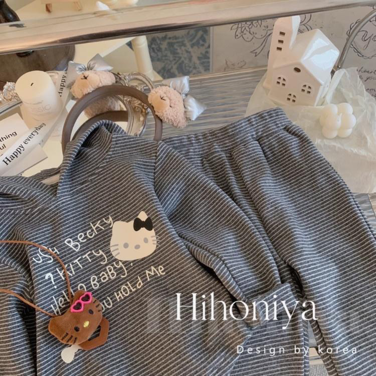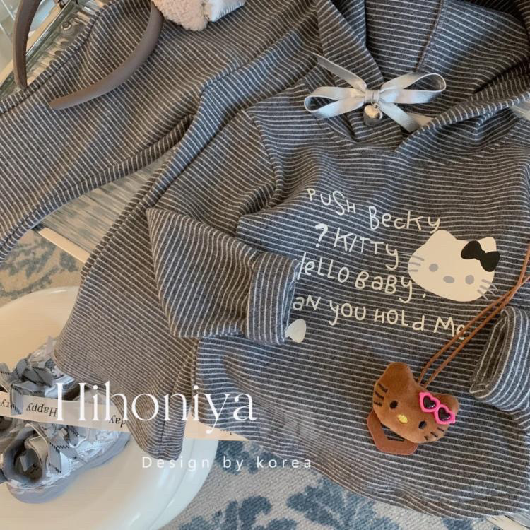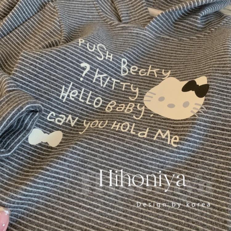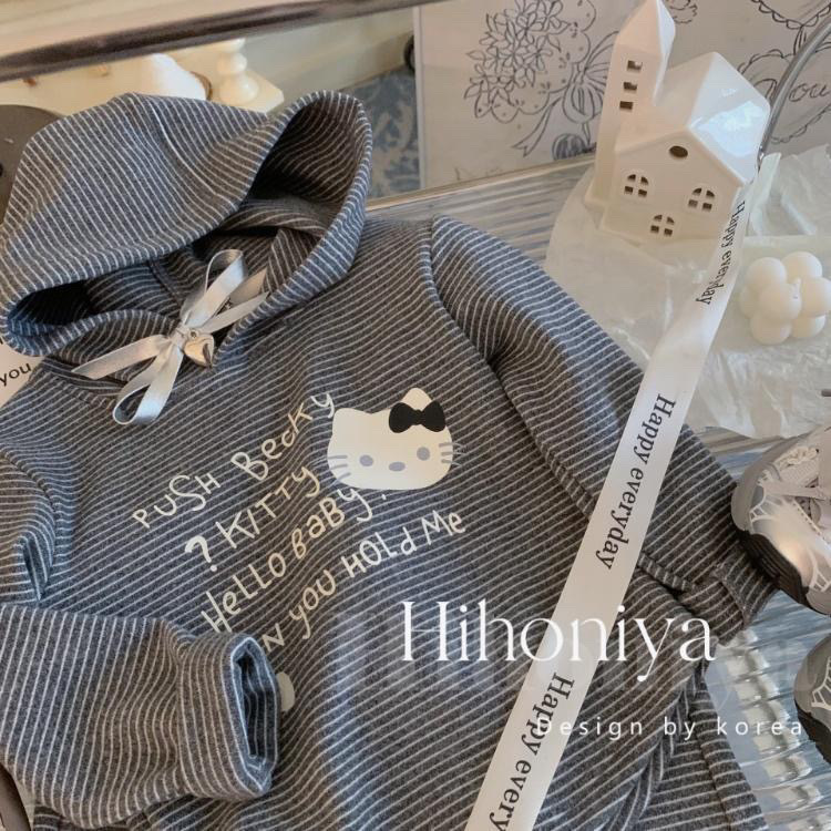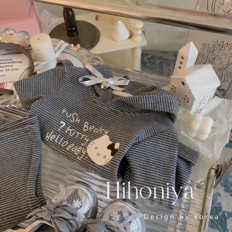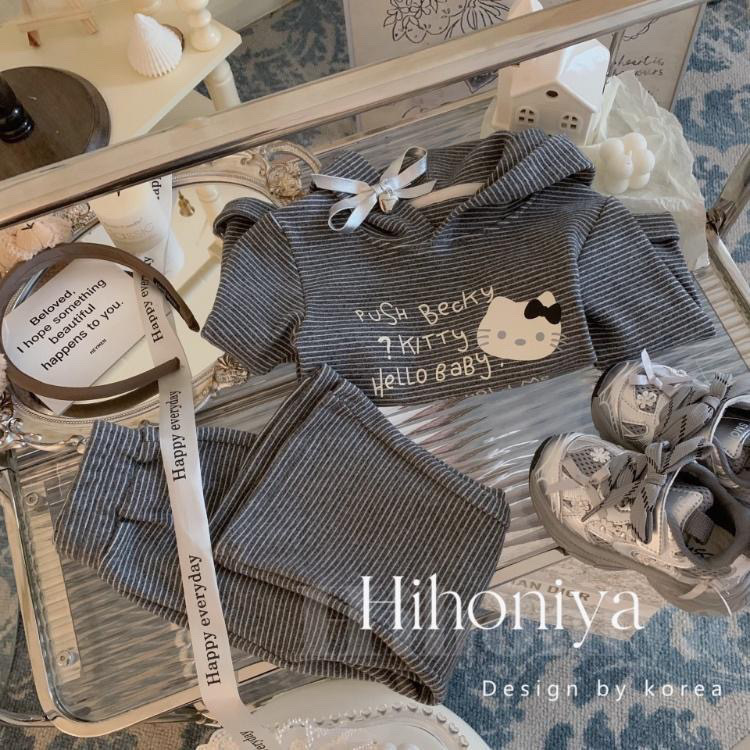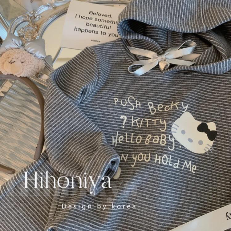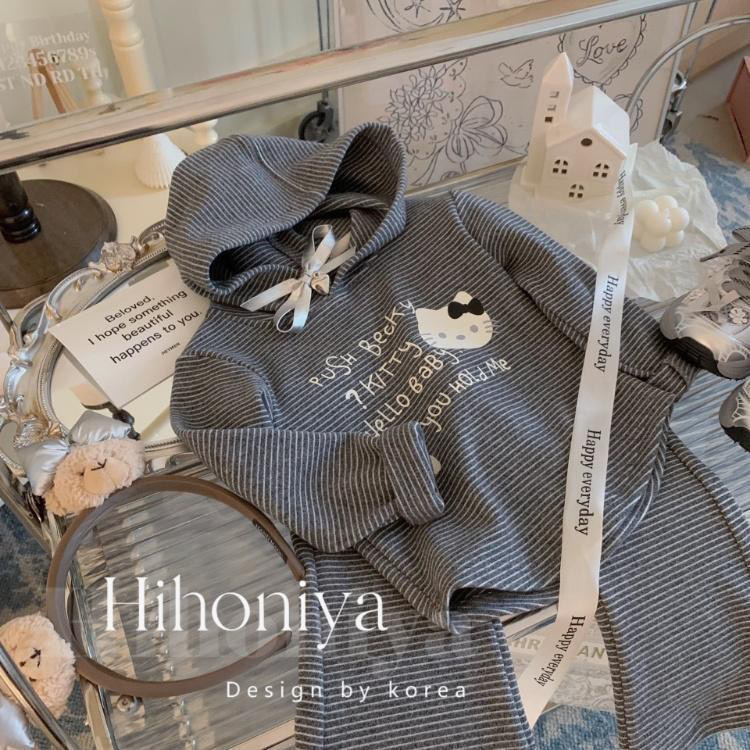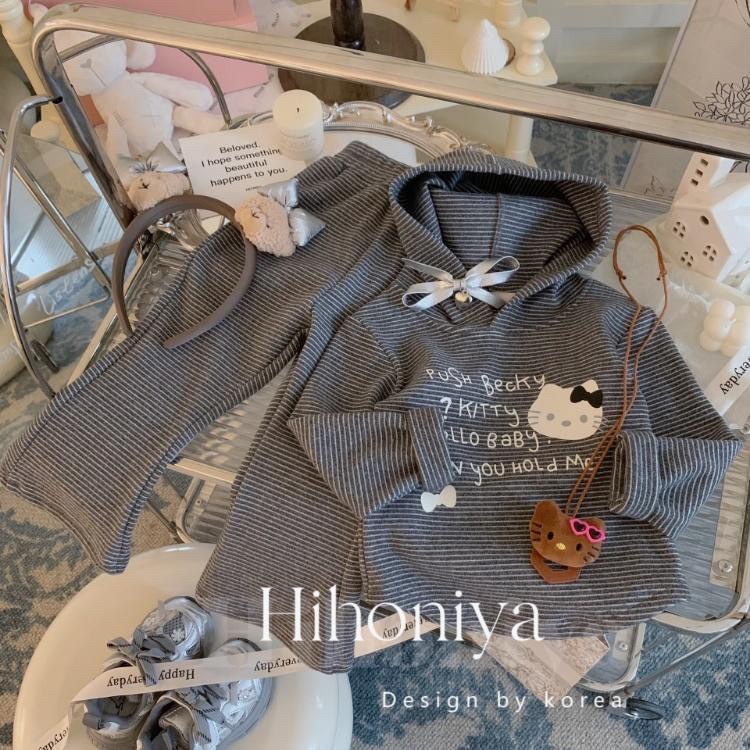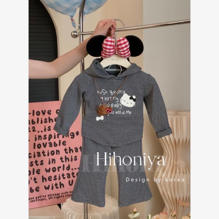 여자 가을 세트 한국 아기 소녀 새끼 고양이 후드 스웨터 서양식 슬림 스트라이프 플레어 팬츠 투피스 세트스토어 가기