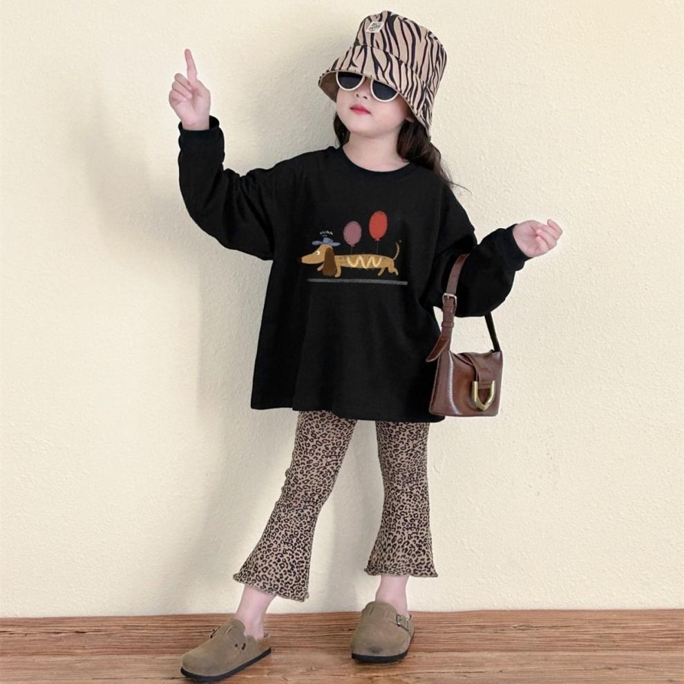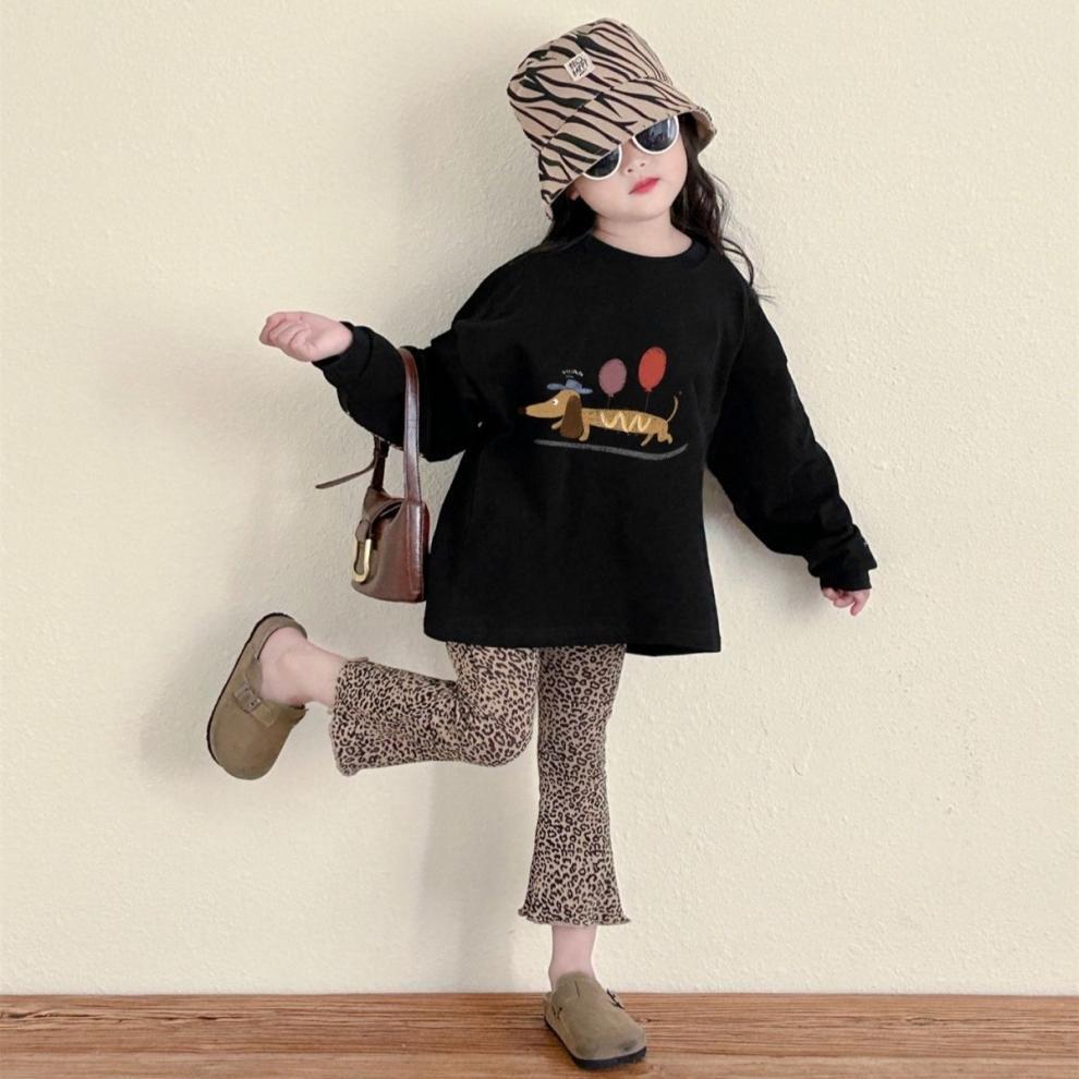 女童套装2024秋季新款宝宝中长款T恤卫衣裙儿童豹纹喇叭裤两件套