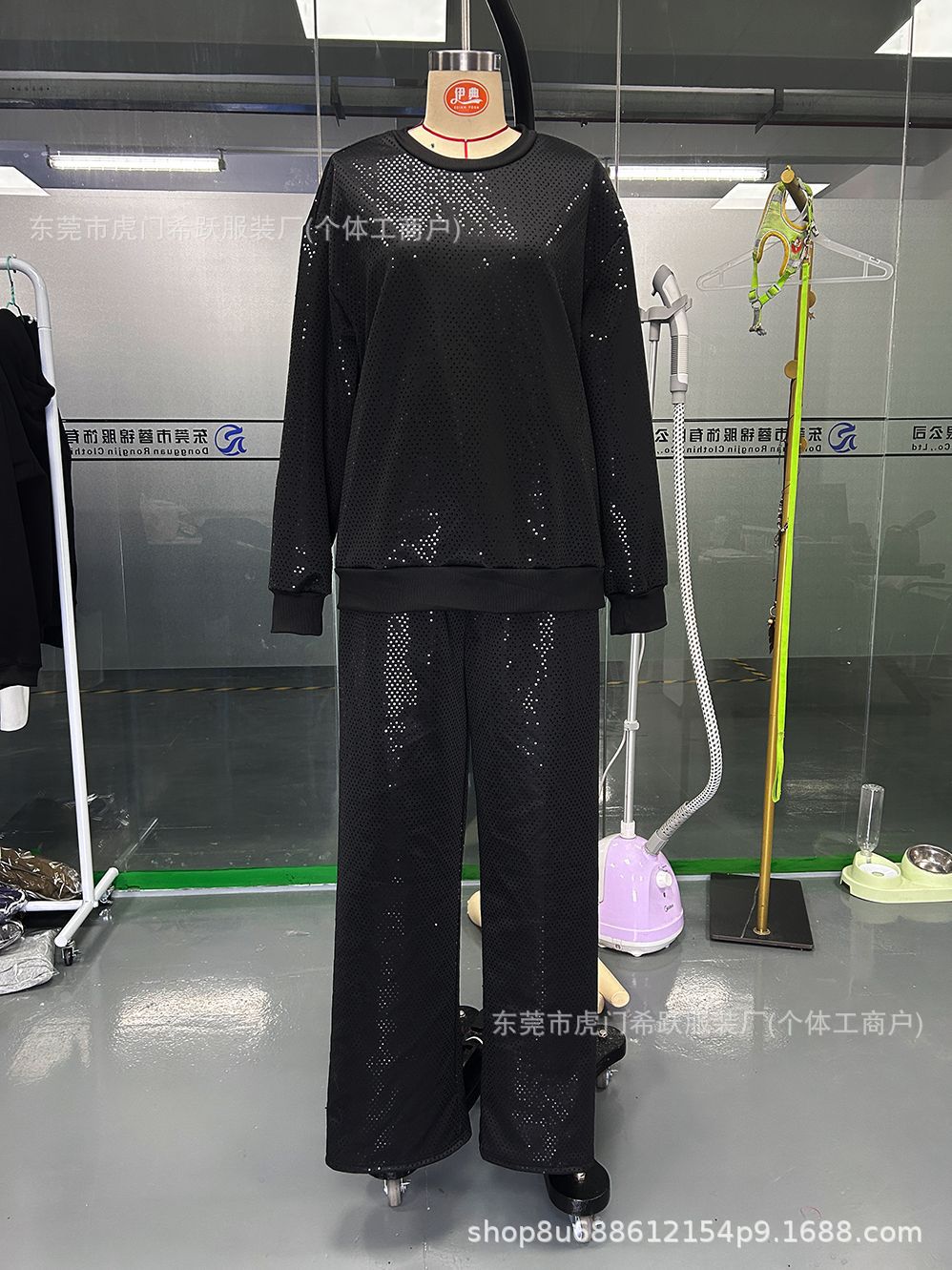 유럽과 미국의 국경 간 가을과 겨울 폭발 여성의 별이 빛나는 하늘 Gypsophila 긴 소매 둥근 목 느슨한 톱 서랍 와이드 다리 2 피스 세트