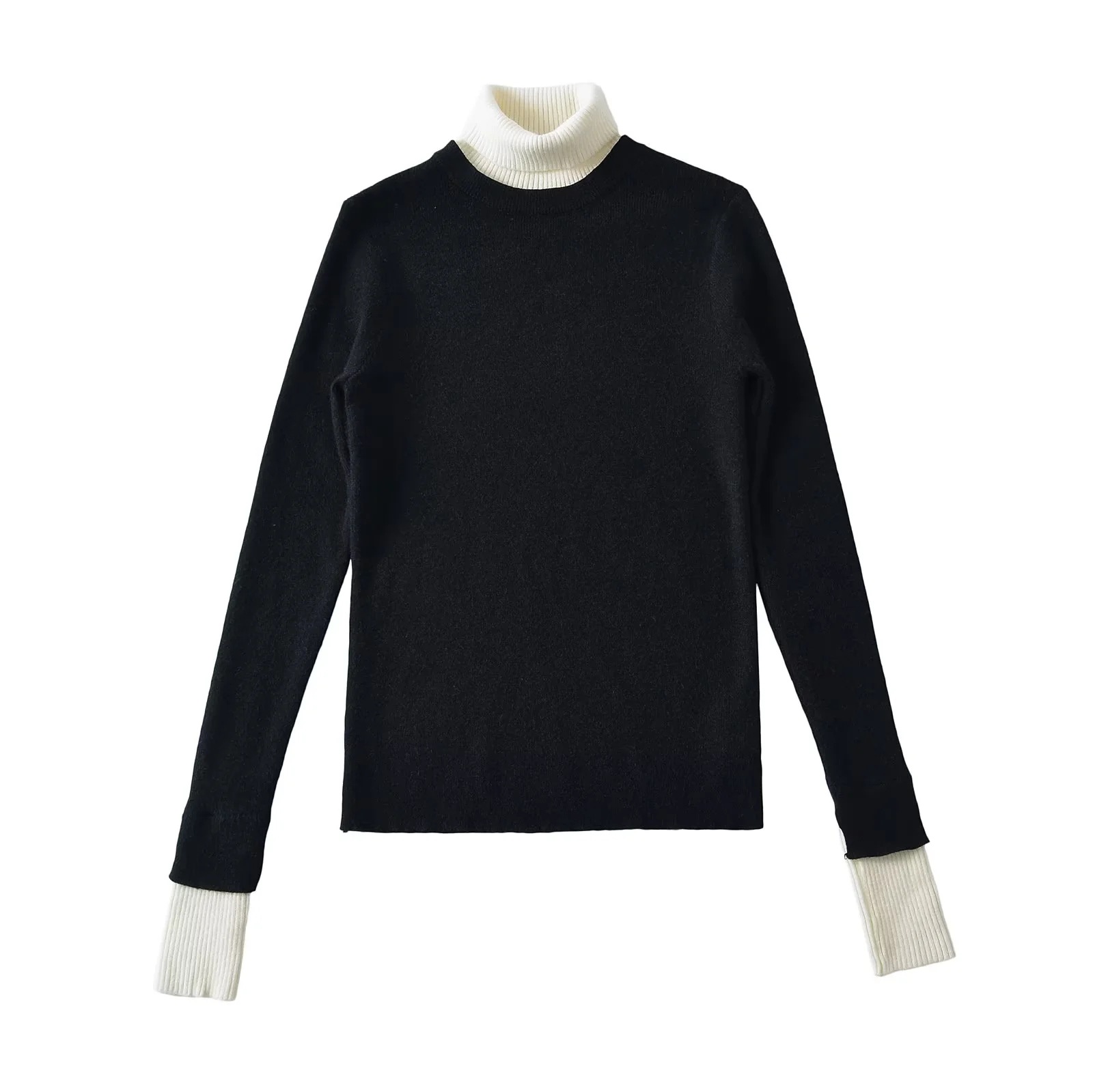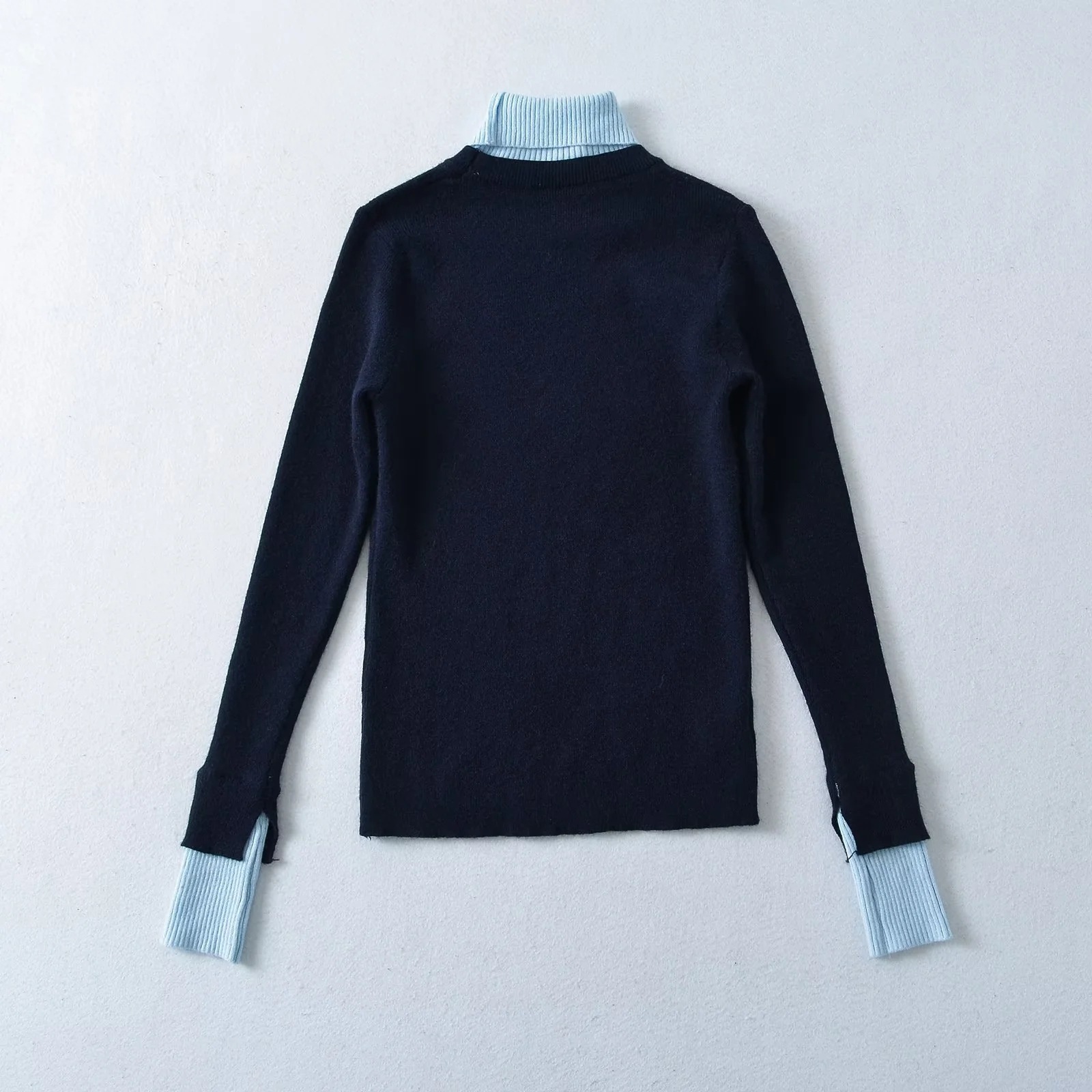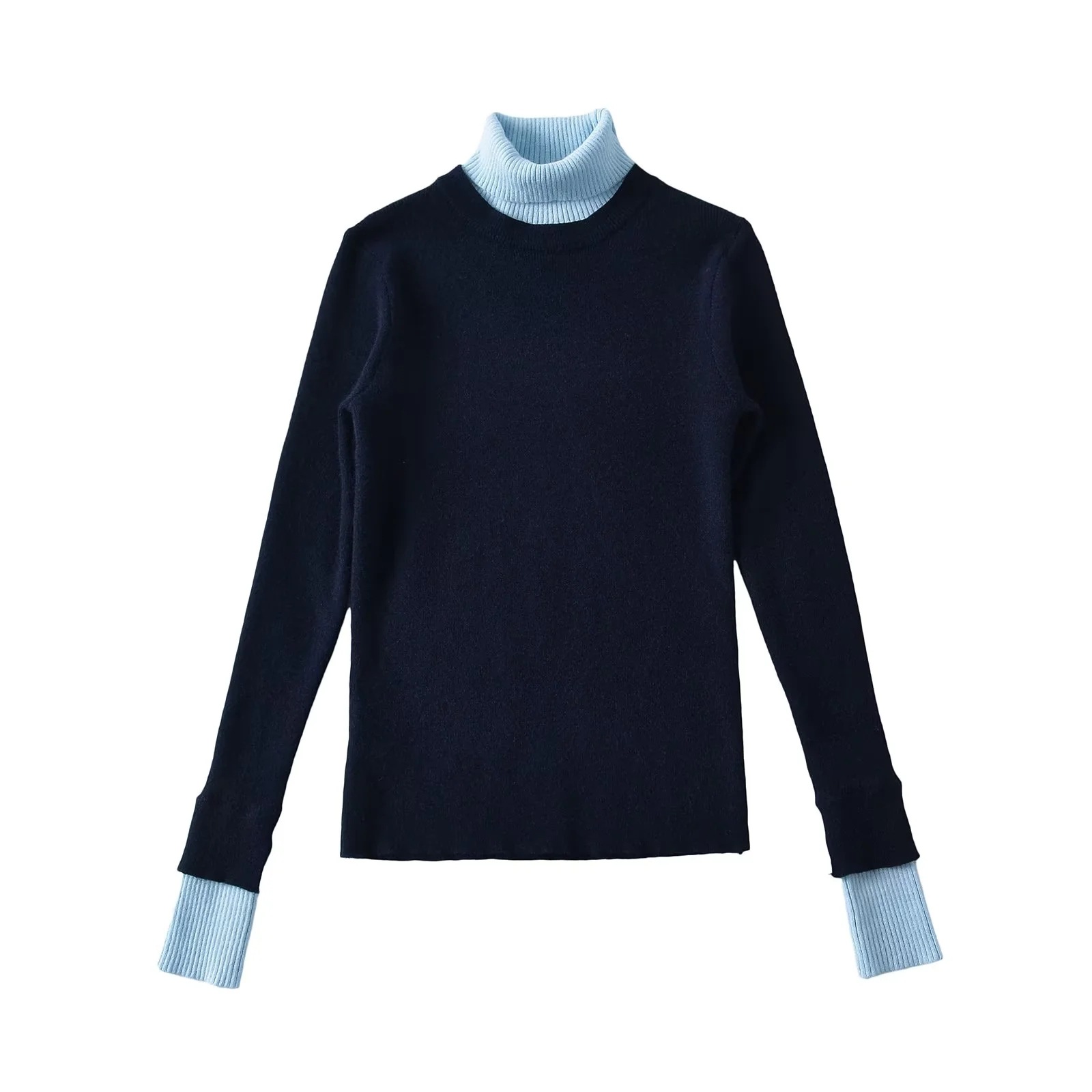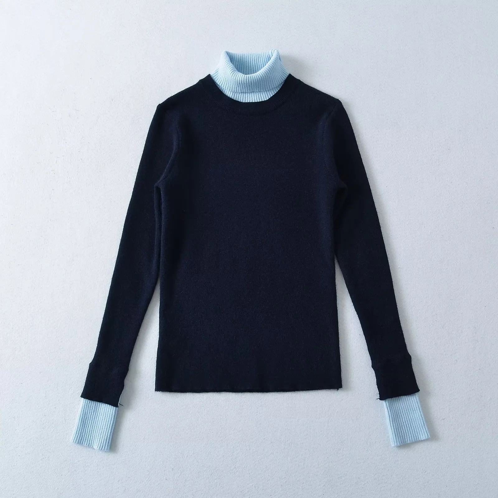 콘트라스트 컬러 가짜 투피스 터틀넥 디자인 베이직 니트 탑 여성 아메리칸 스타일 핫 걸 가을과 겨울 슬림 핏 베이스 스웨터