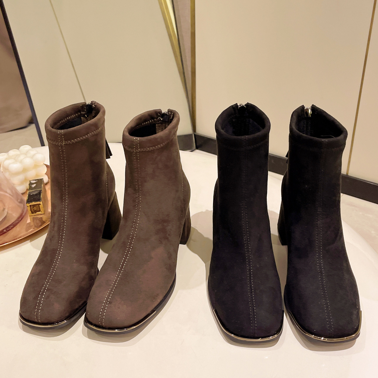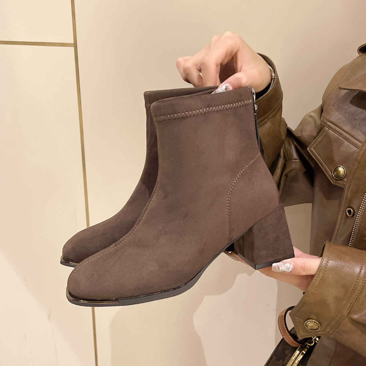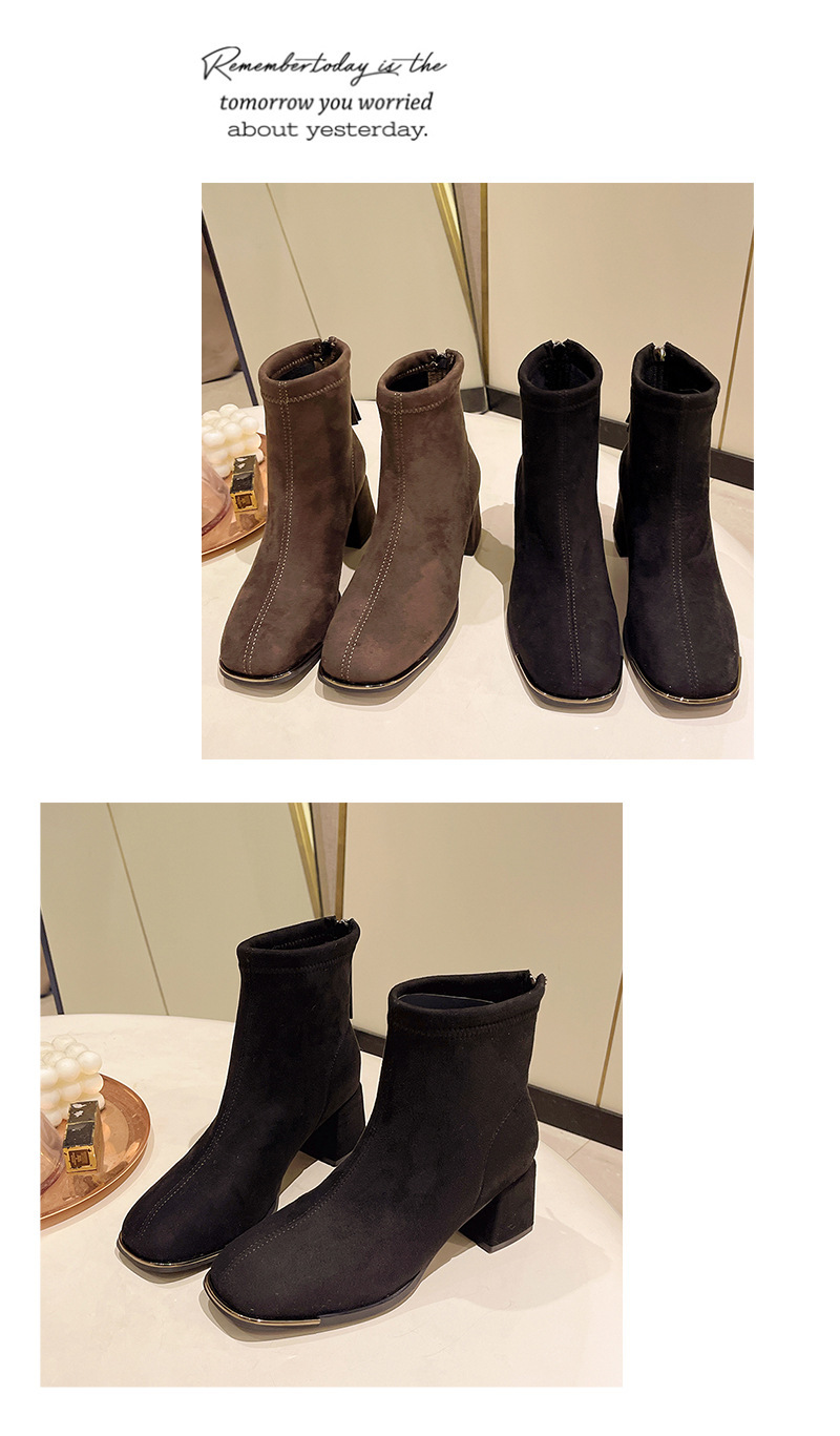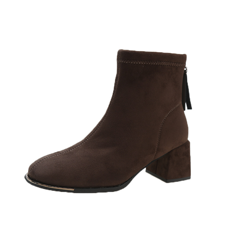 2024 겨울 새로운 영국 스타일 소 벨벳 짧은 튜브 얇은 부츠 유행 프랑스 지퍼 두꺼운 힐 짧은 부츠스토어 가기