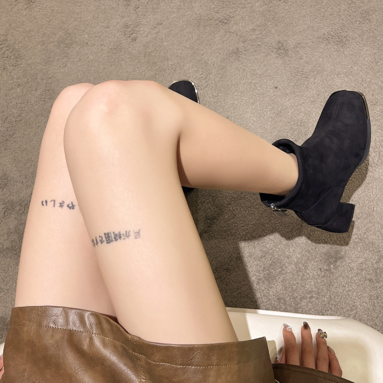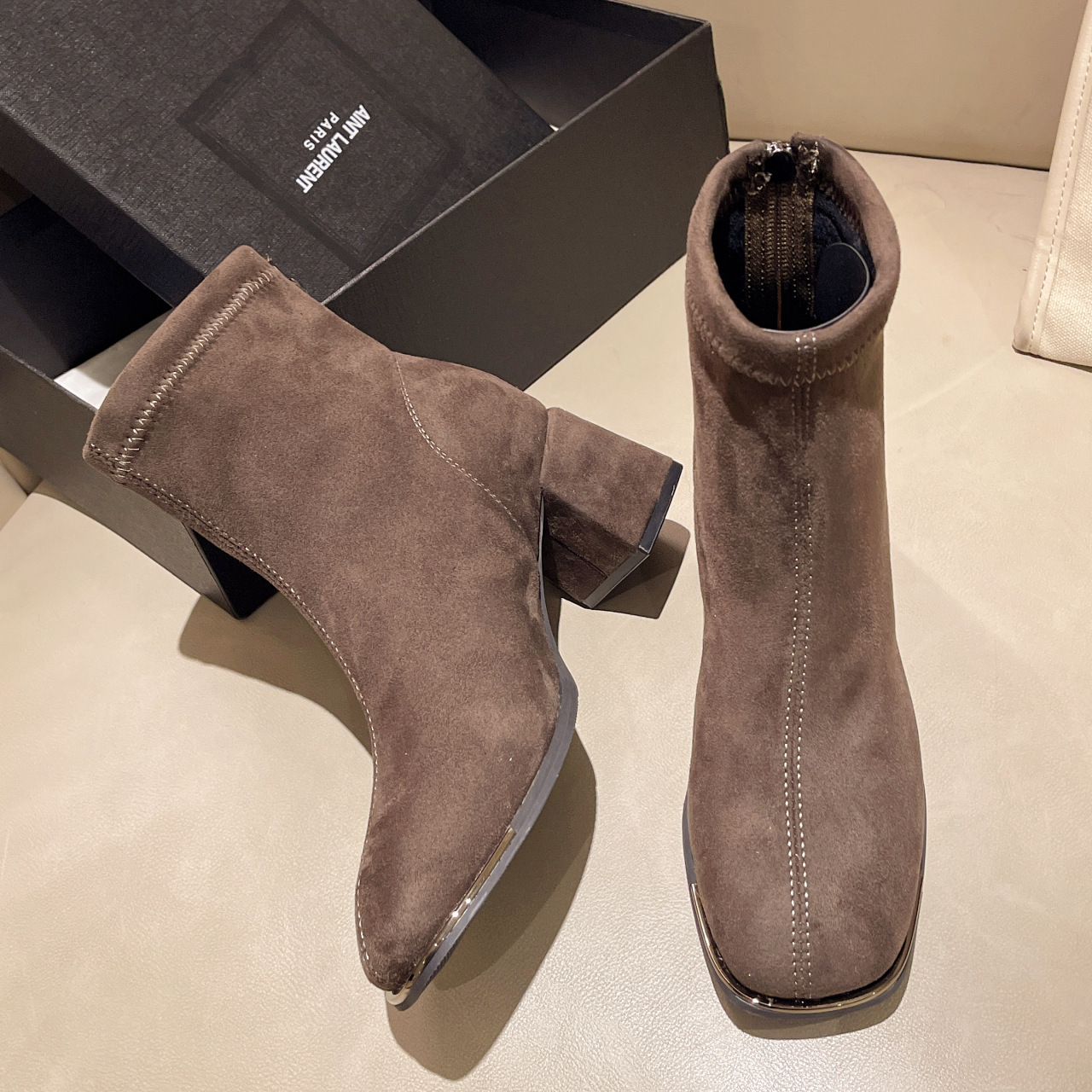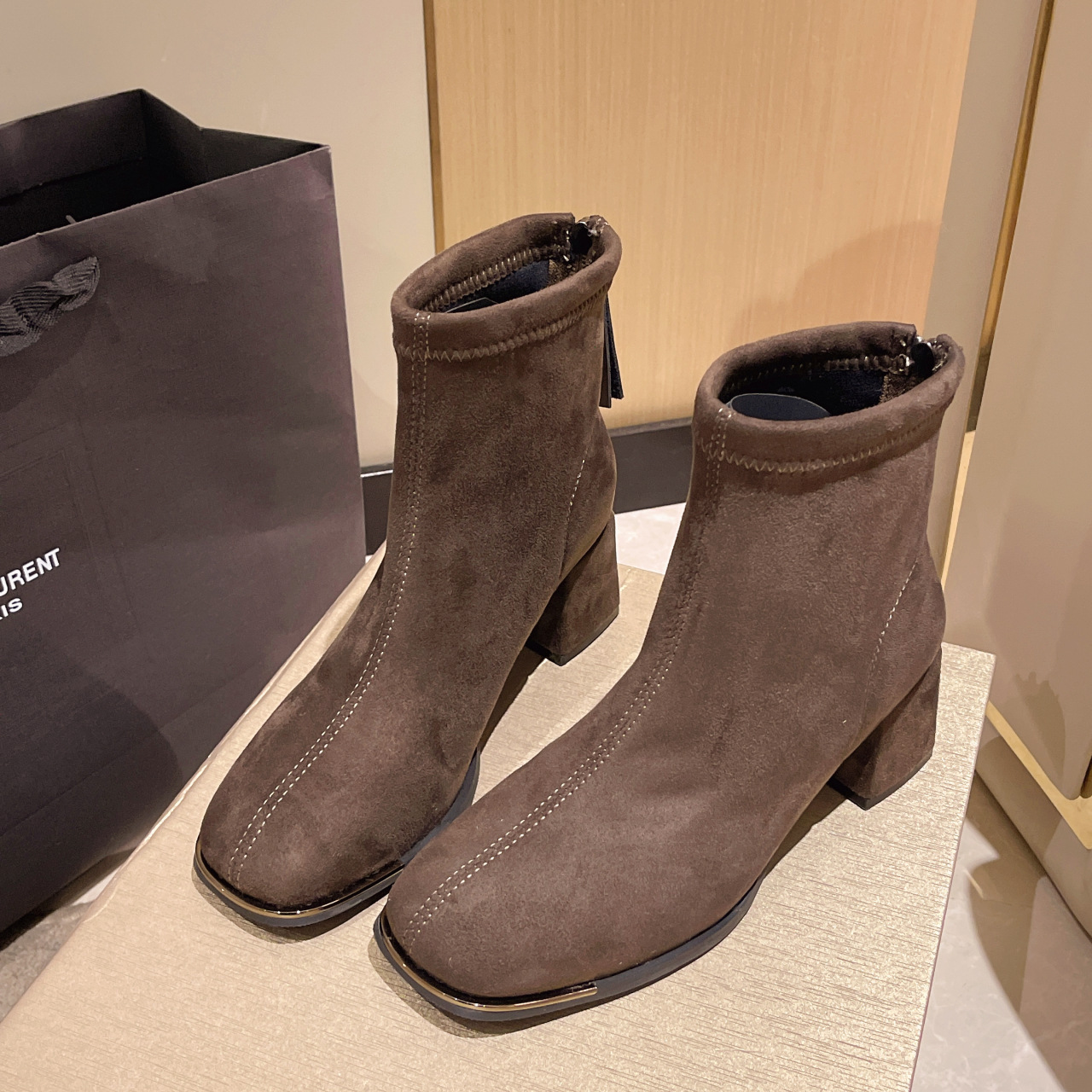 2024 겨울 새로운 영국 스타일 소 벨벳 짧은 튜브 얇은 부츠 유행 프랑스 지퍼 두꺼운 힐 짧은 부츠스토어 가기