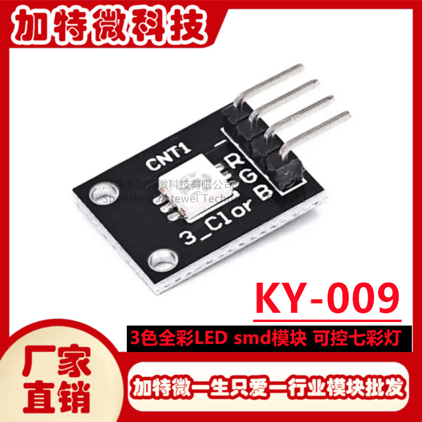 RGB LED 模块由一个贴片全彩 LED 制成,通过 R、G、B 三个引脚的 PWM 电压输入可以调节三种基色(红/蓝/绿)的强度从而实现全彩的混色效果。