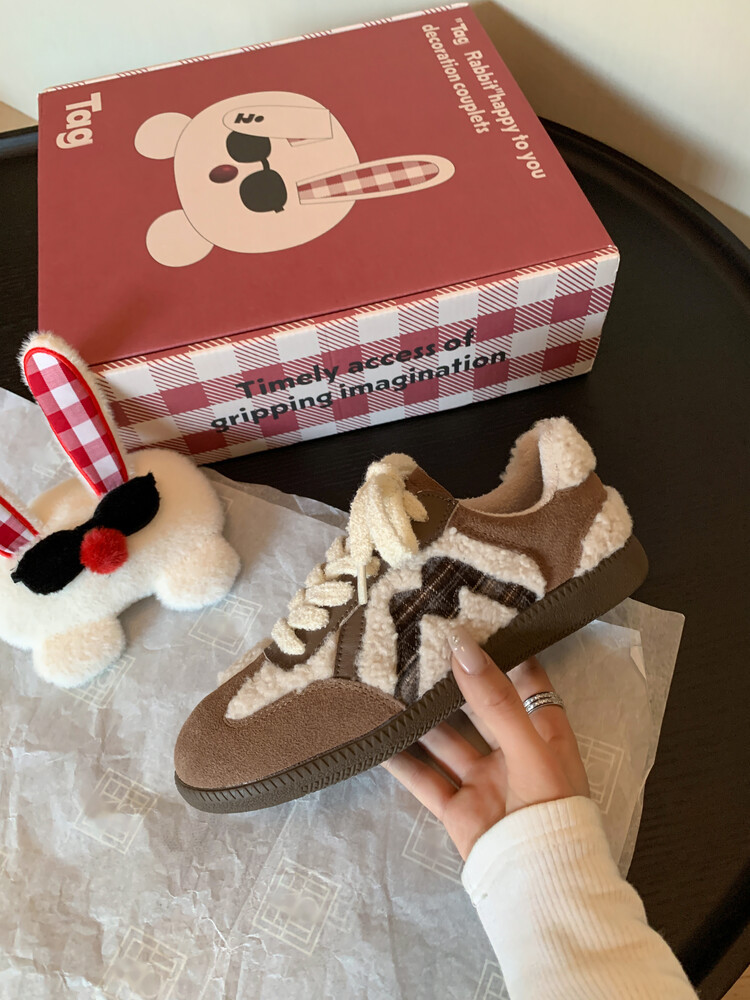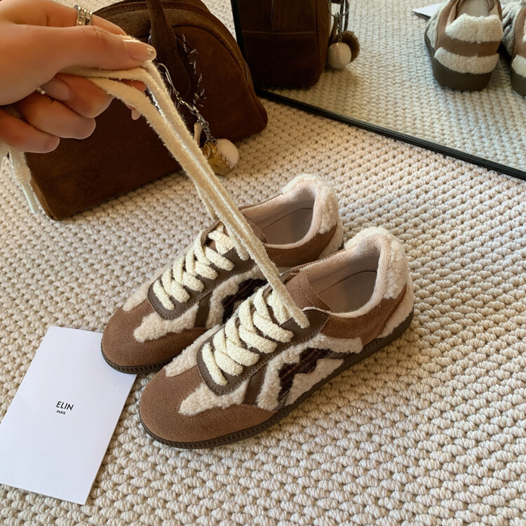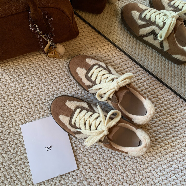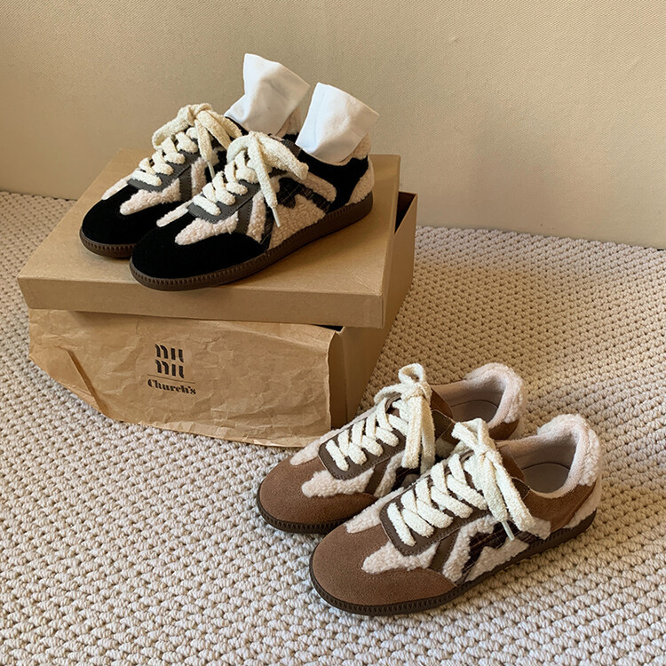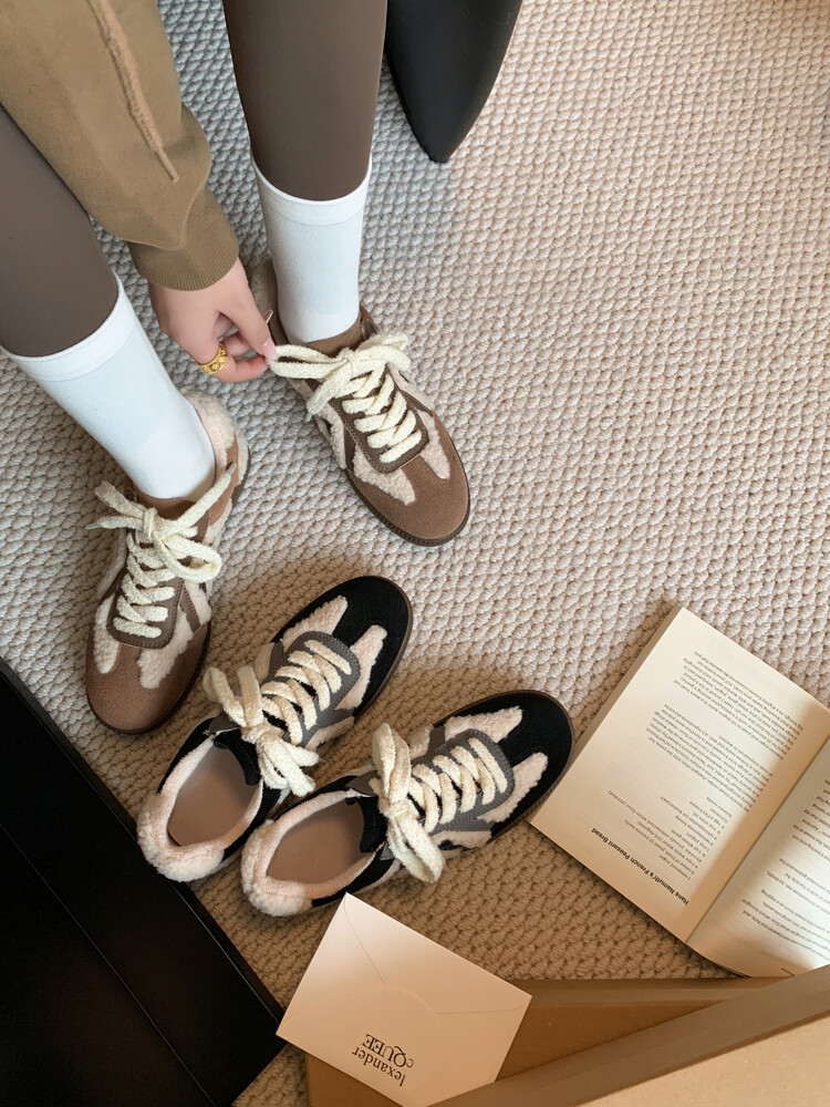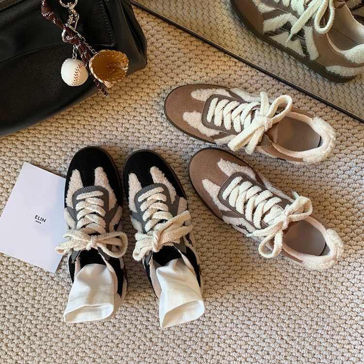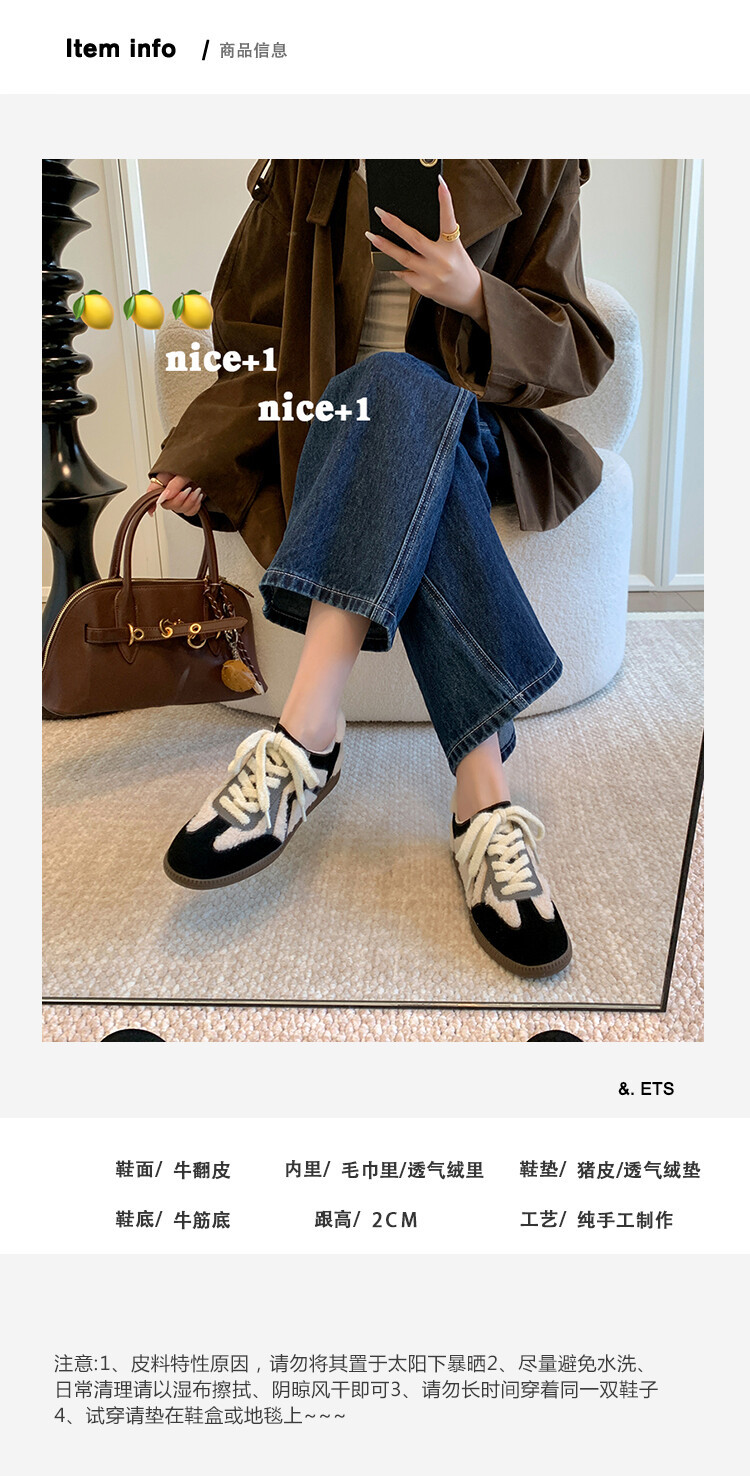 암소 터닝 가죽 캐주얼 슈즈 여성 스포츠 스니커즈 가을 새로운 라운드 토 레이스 업 모방 램 울 플랫 슈즈 여성 로우 탑 싱글 레이어 슈즈스토어 가기