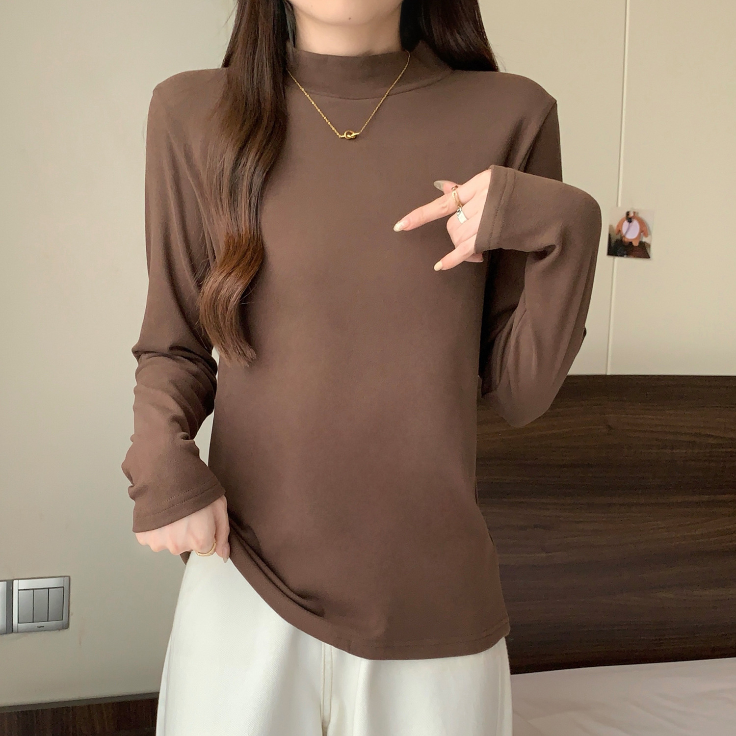 가을/겨울 세미 하이 칼라 벨벳 니트 바닥 셔츠 여성용 슬림 핏 벨벳 풀오버 티셔츠 66233 #