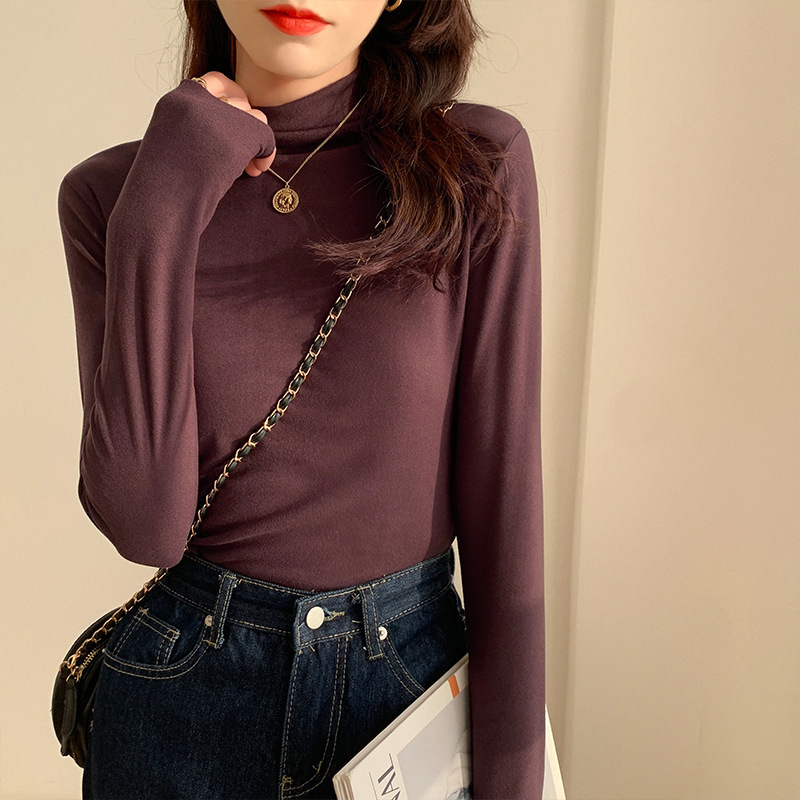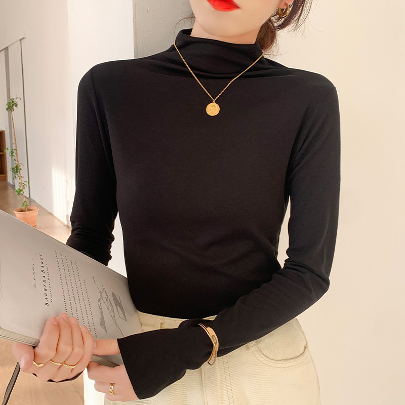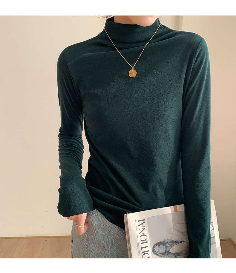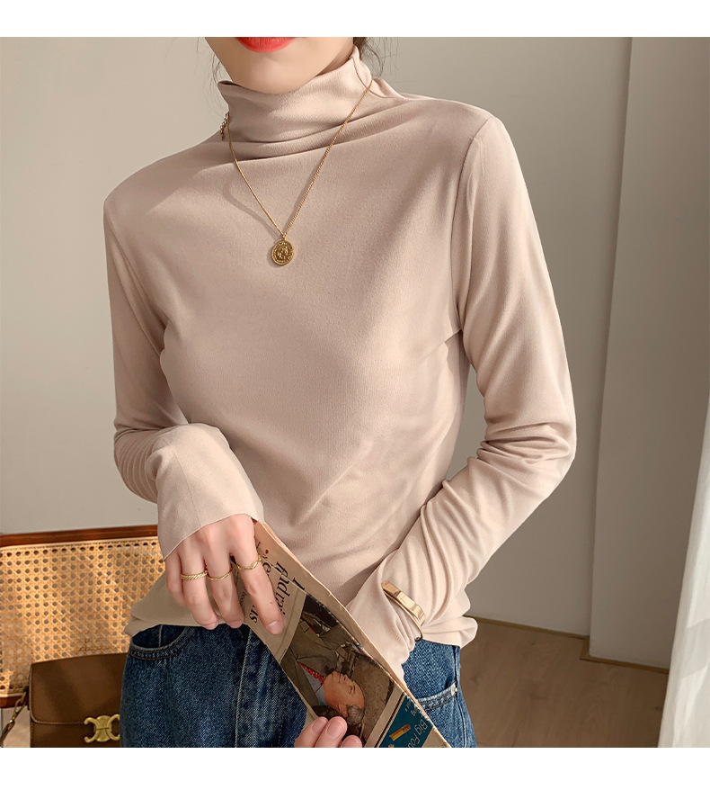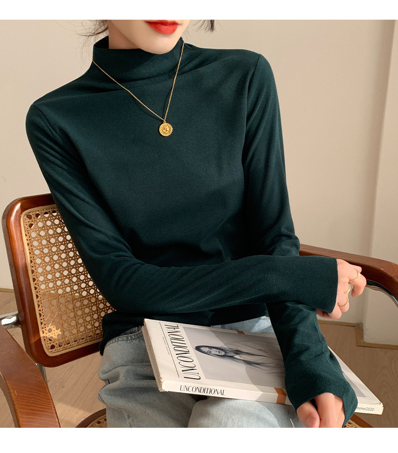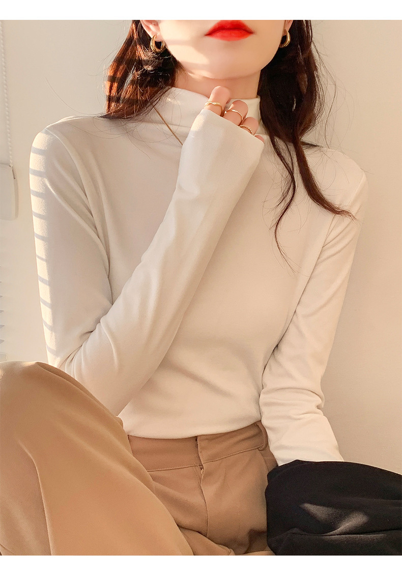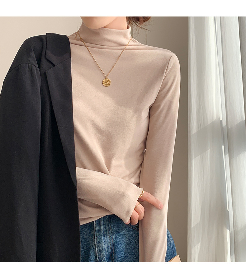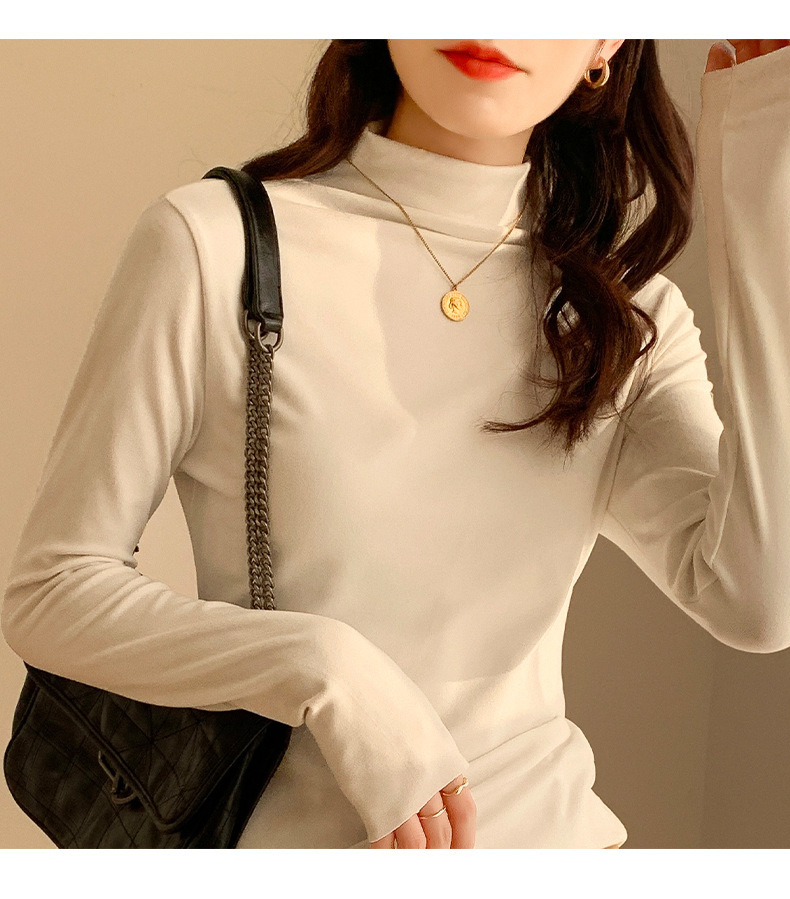 하프 하이 칼라 양면 벨벳 하단셔츠 여성용 가을과 겨울 새로운 한국식 슬림 핏 이너 기모 따뜻한 긴팔 탑