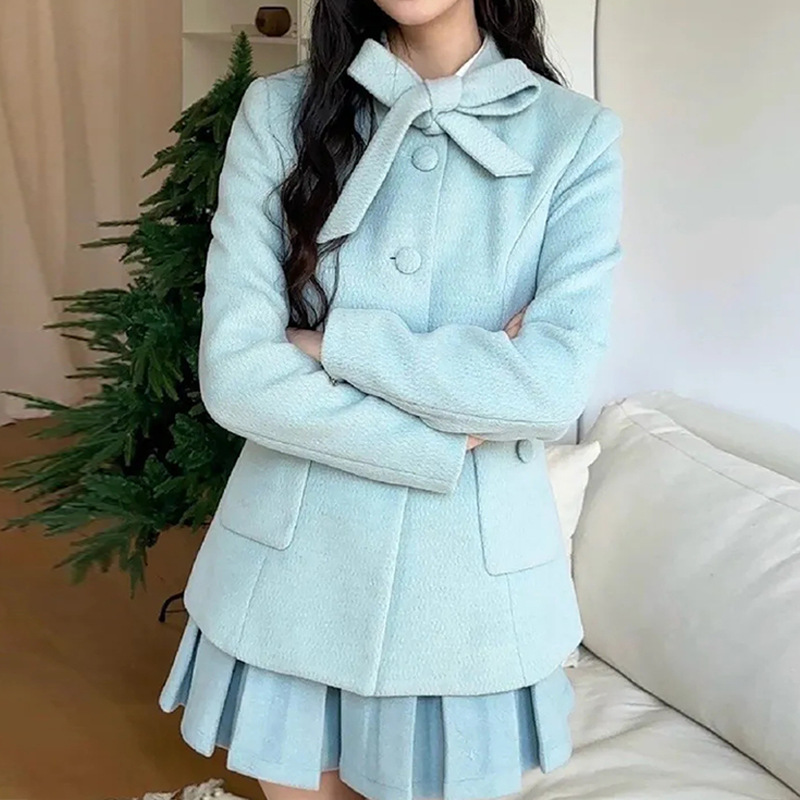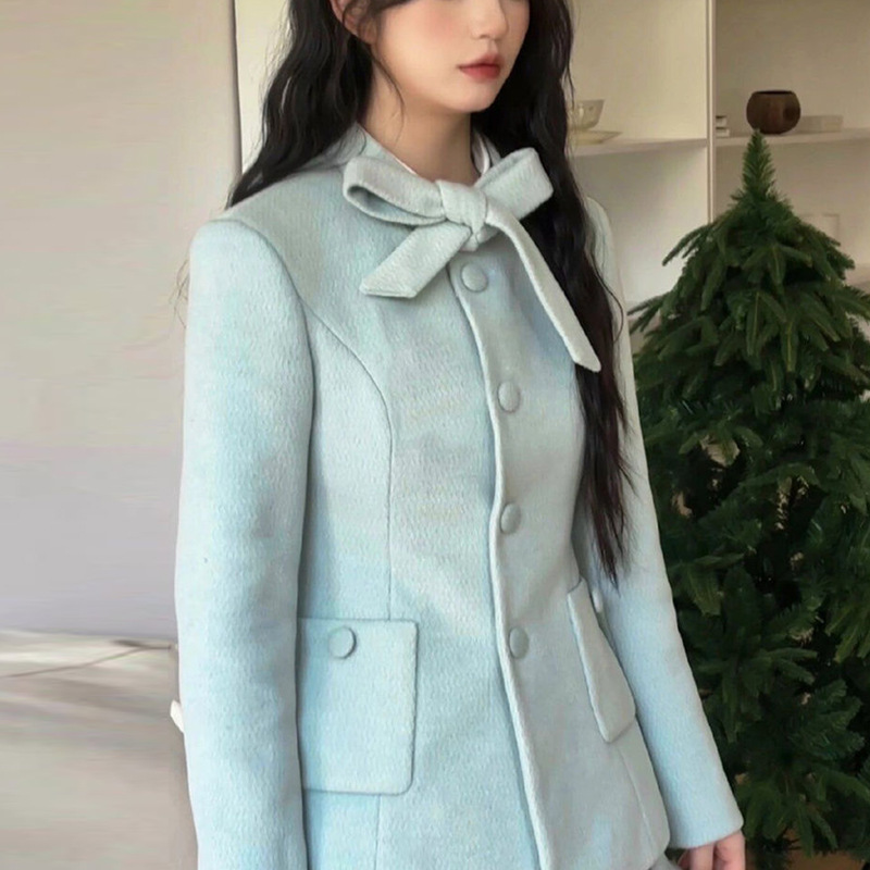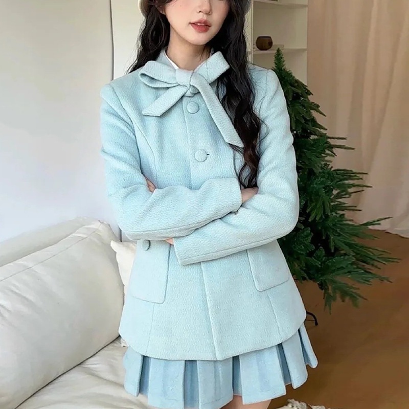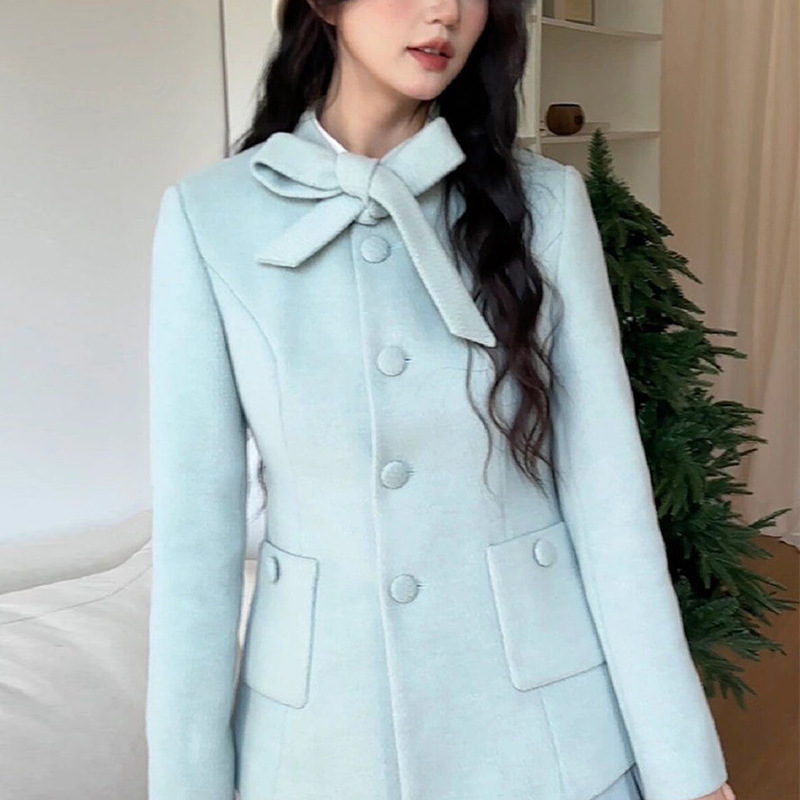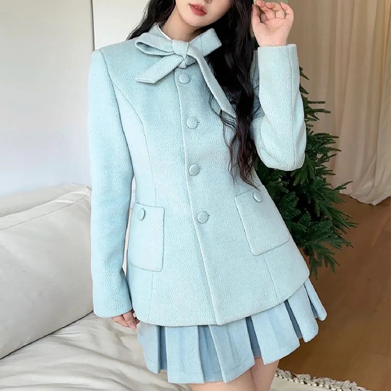 프랑스 사교계 여성의 우아한 작은 향기 스타일 여성 가을 겨울 모직 코트 하이 웨이스트 플리츠 스커트 투피스 세트