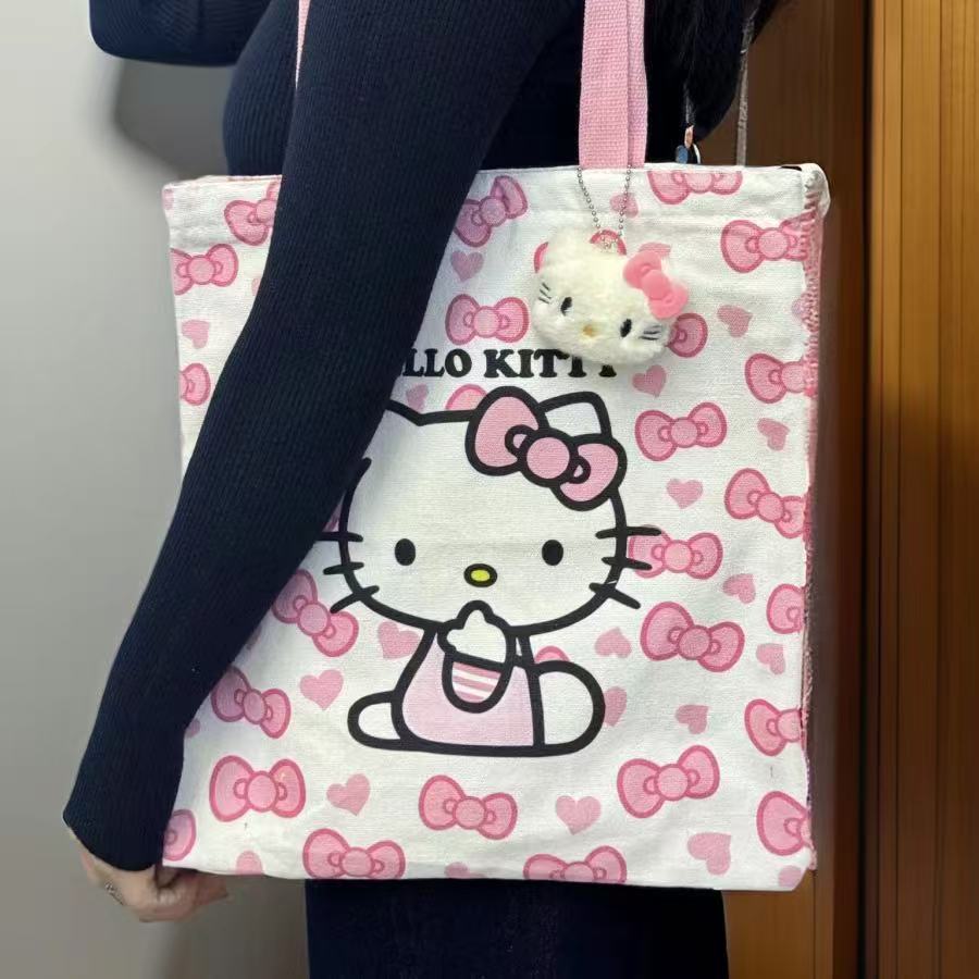키티 고양이 2024 새로운 캔버스 가방 귀여운 헬로 키티 대용량 학생 어깨 가방 만화 핸드백 여성