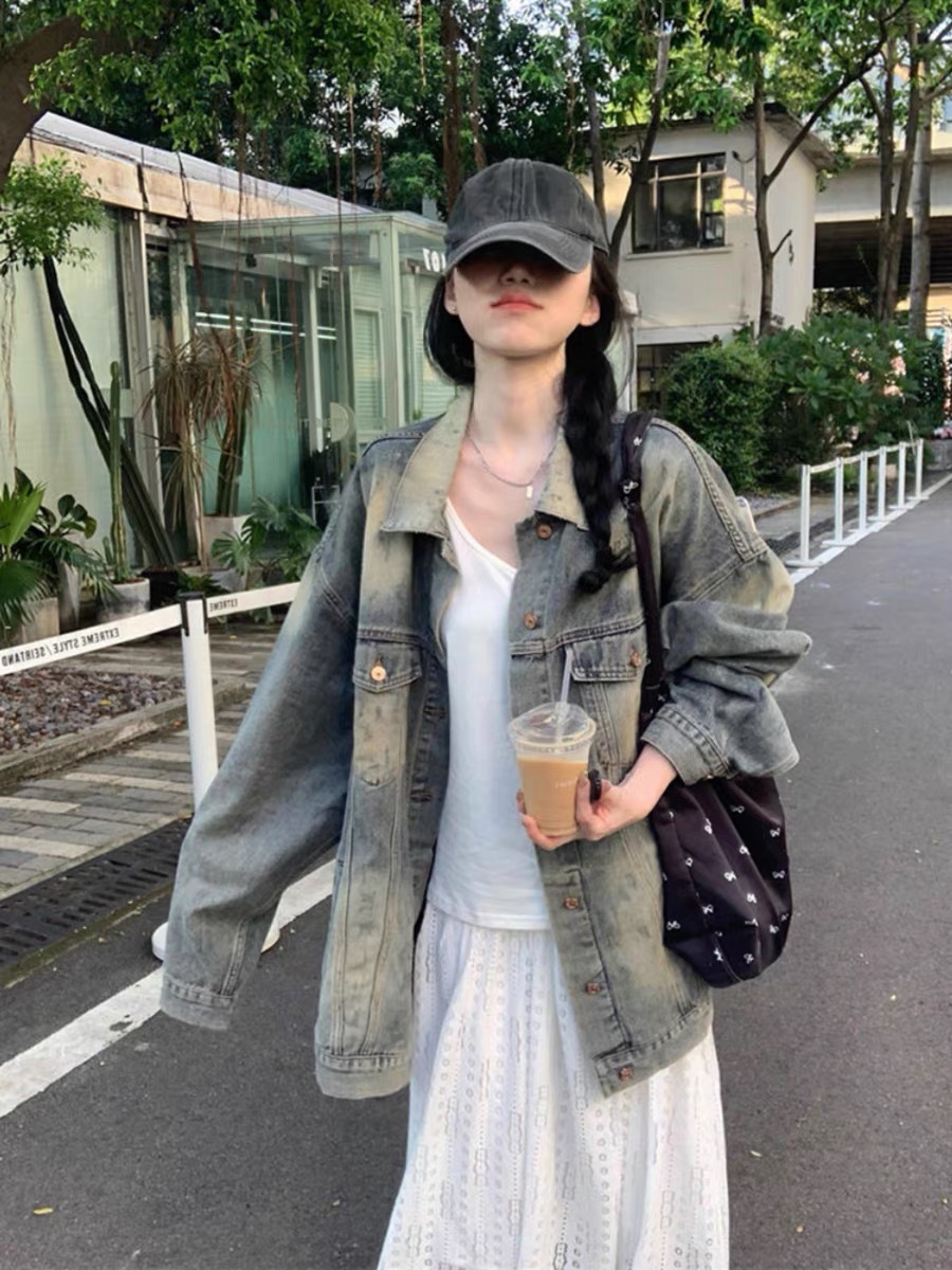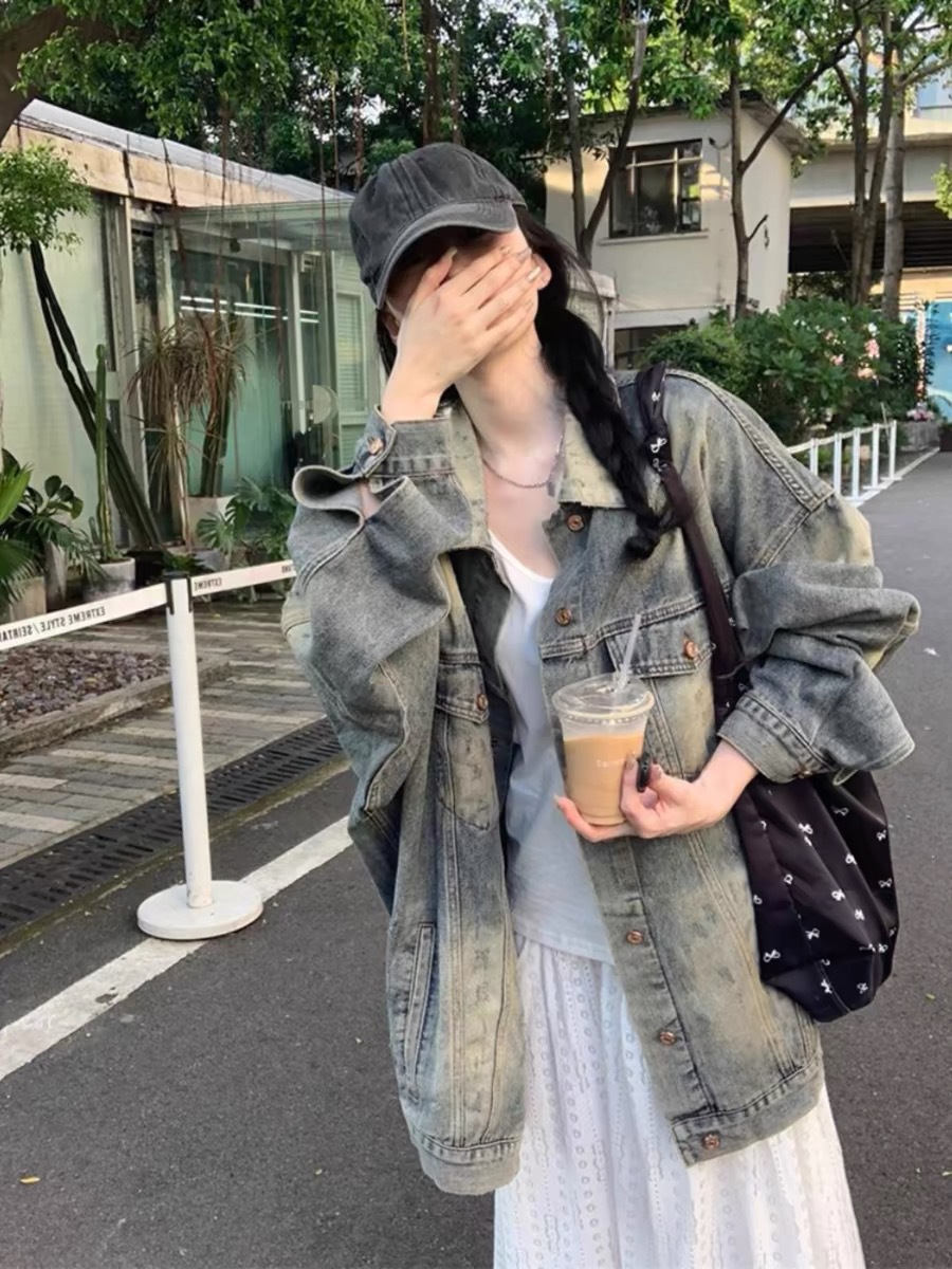 하이 스트리트 아메리칸 레트로 스타일 빈티지 데님 워크웨어 재킷 여성용 달콤하고 매력적인 스타일 루즈핏 슬림핏 상의 봄 가을스토어 가기
