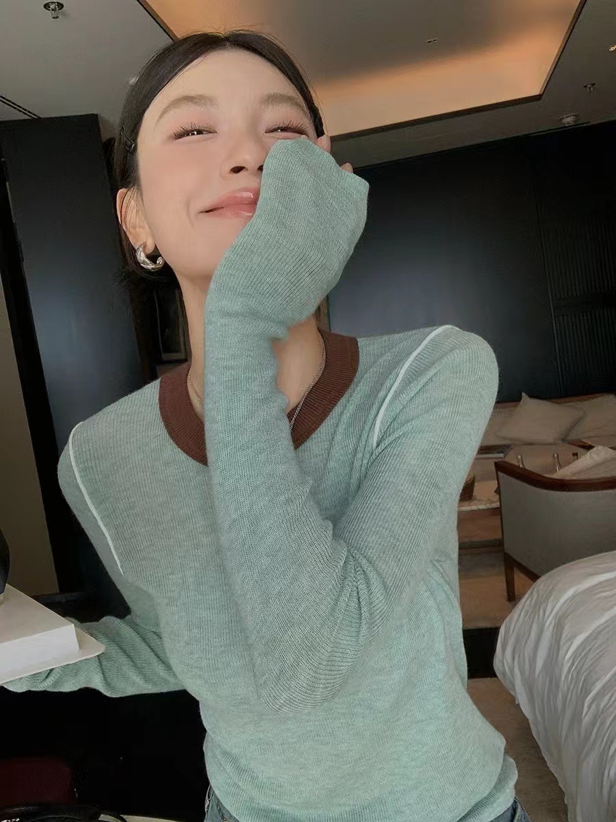 Mercerized 양모 부드러운 찹쌀 모든 경기 기본 T 여성의 가을 및 겨울 대비 색상 Crewneck 긴팔 니트베이스 셔츠 트렌디스토어 가기