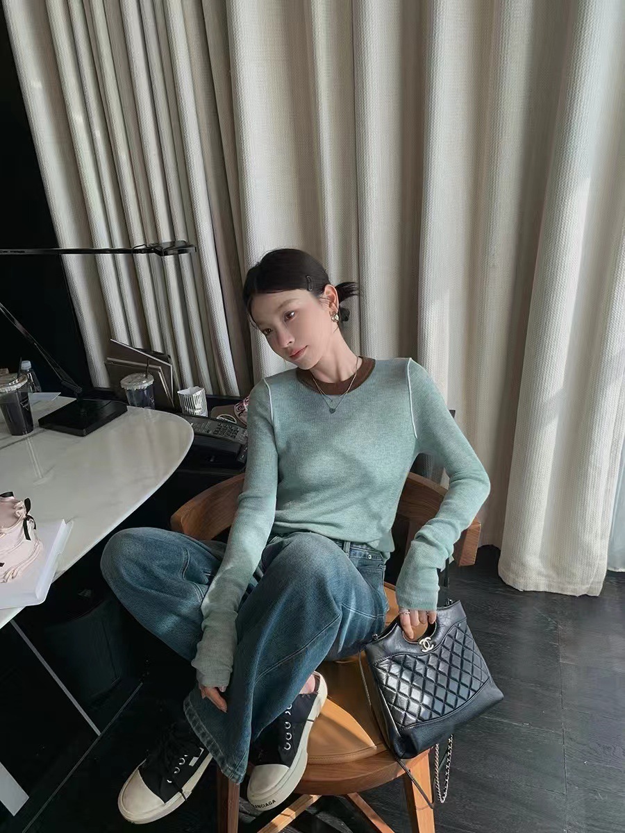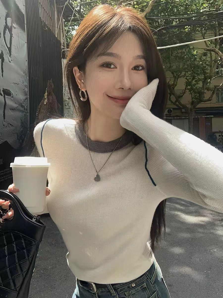 张贝贝ibell丝光羊毛软糯显瘦百搭基础T女撞色圆领长袖针织打底衫