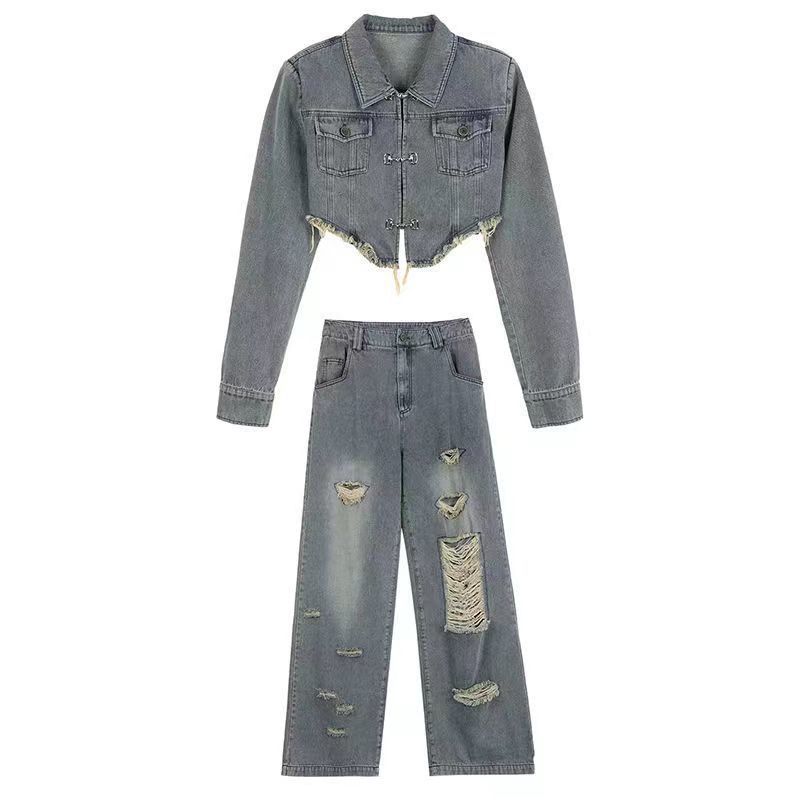 재킷 세트 뜨거운 소녀 짧은 치마 거리 파괴 청바지 초가을 2024 새로운 불규칙한 헴 세척 데님