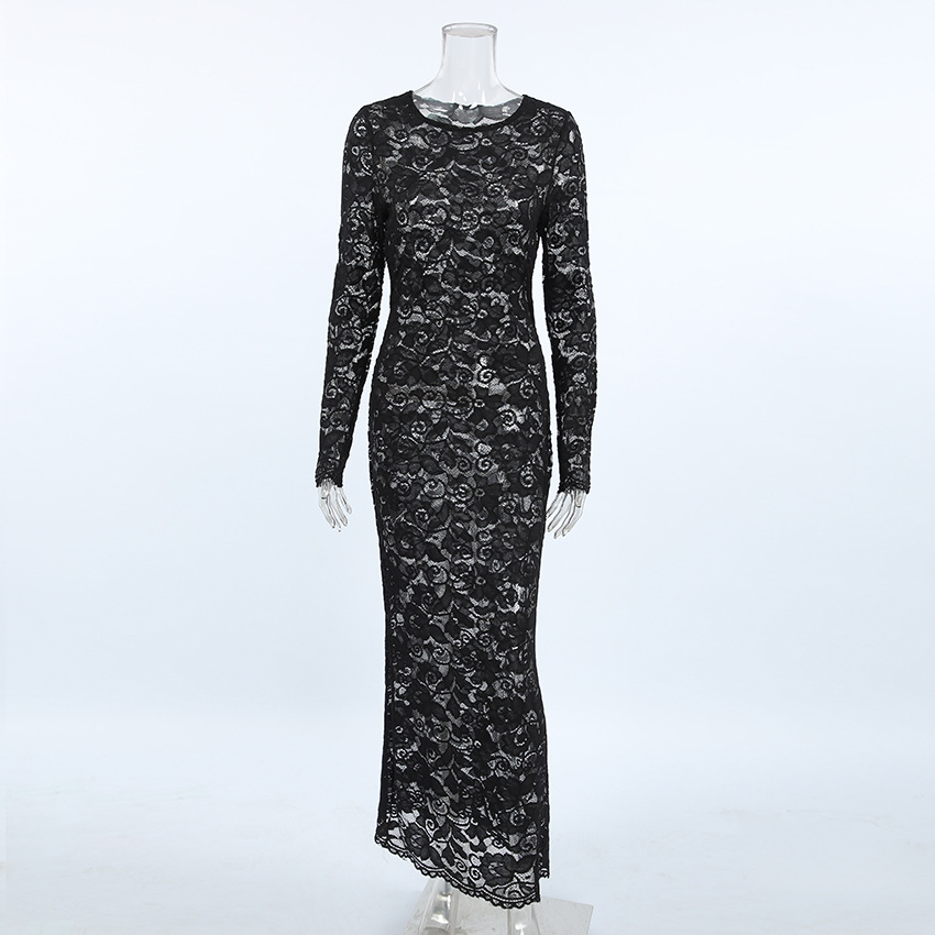 여성을위한 가볍고 성숙한 검은 색 섹시한 레이스 피쉬 테일 롱 스커트 2025 가을 유럽과 미국의 라운드 넥 힙 커버 드레스 여성 의류