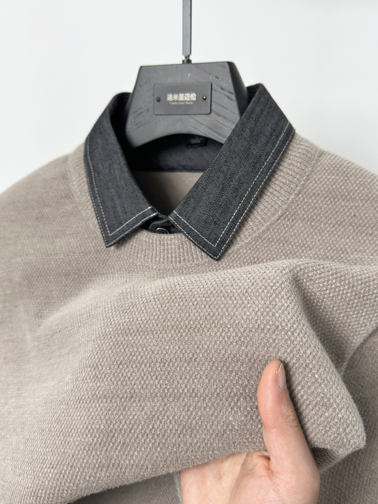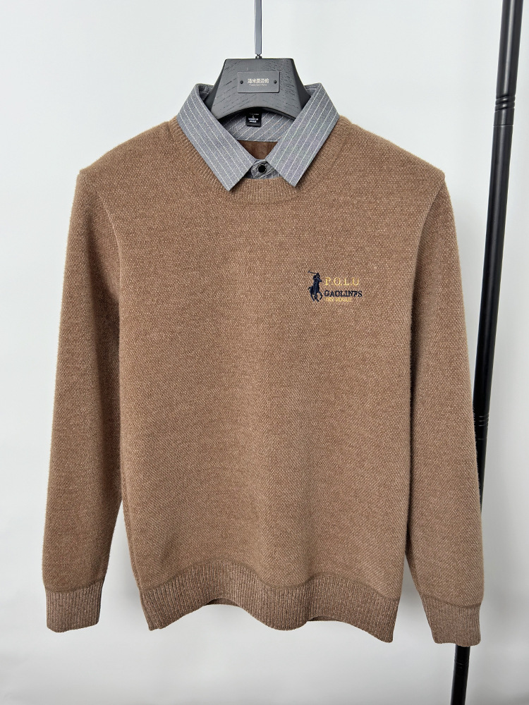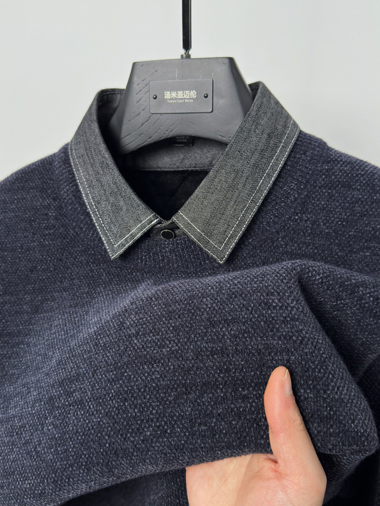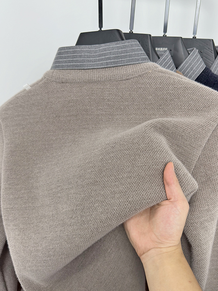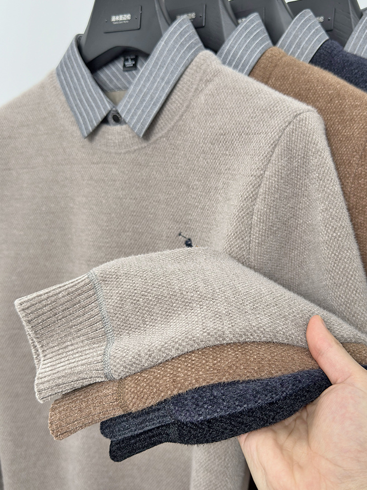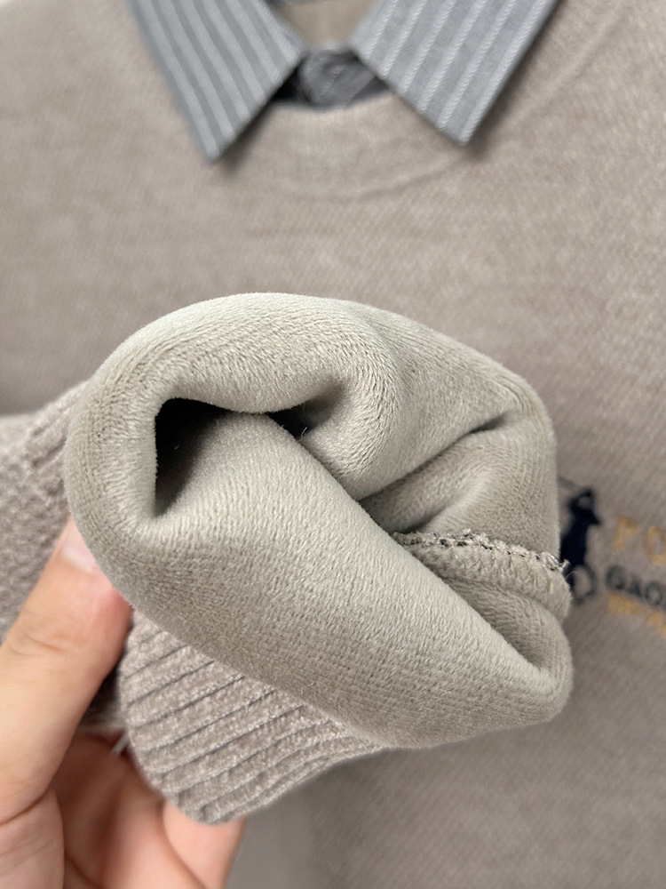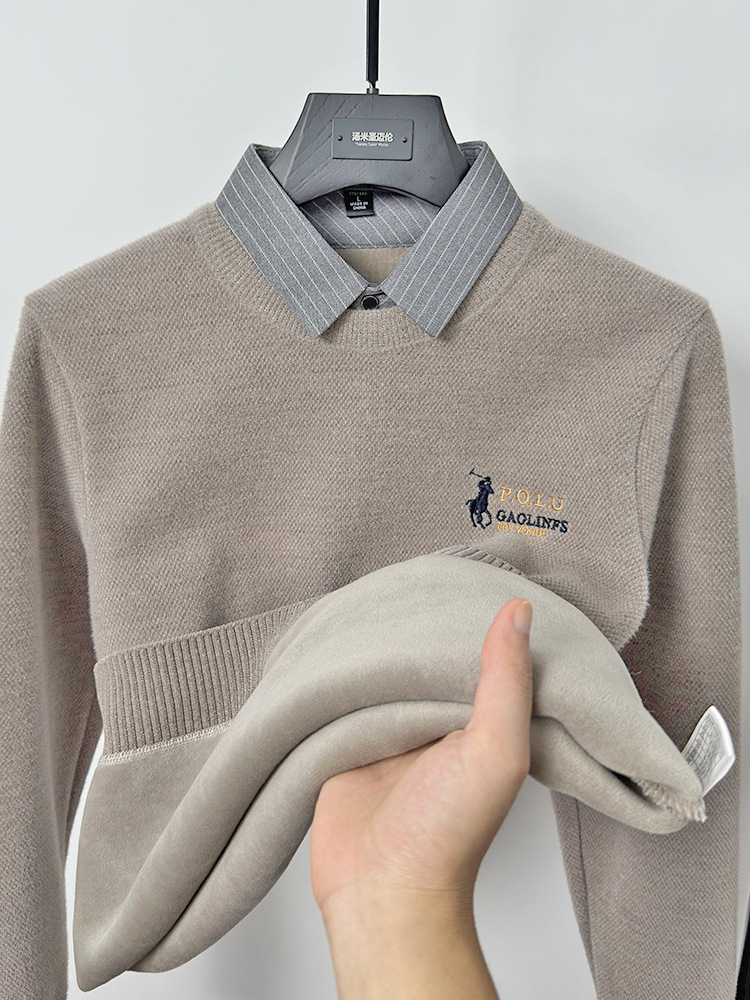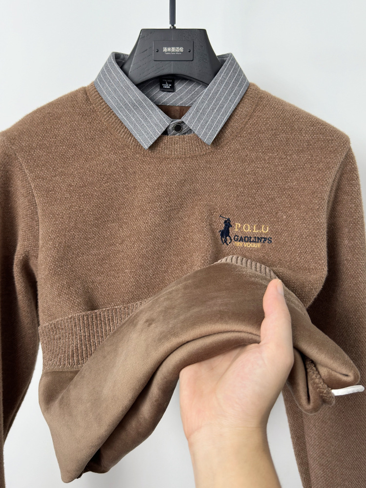 원피스 벨벳 기모 두꺼운 남성용 스웨터 새 남성용 셔츠 칼라 가짜 투피스 겨울 따뜻한 니트 베이스 셔츠